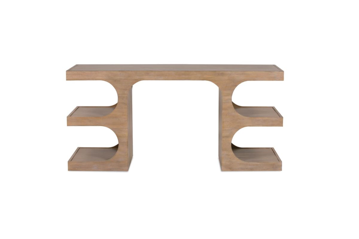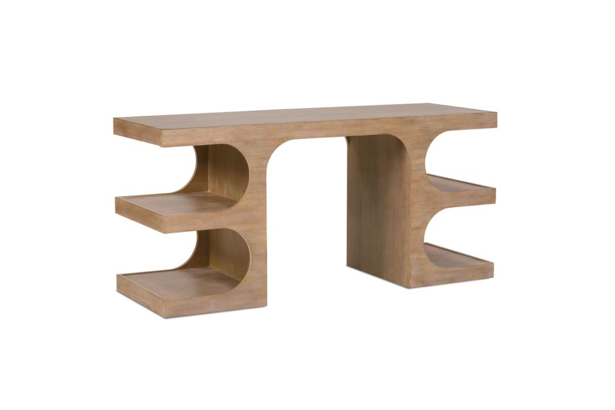 The Rowe Dune Desk blends sculptural modern design with everyday functionality, making it an ideal choice for home offices, living spaces, or creative nooks. Its defining feature is a distinctive curved silhouette that seamlessly integrates with open shelving on both sides — a design element that balances artistic flair with practical storage.
