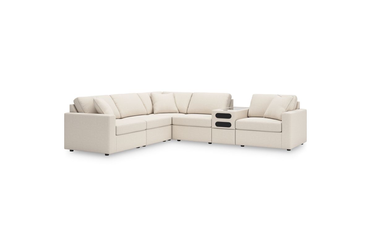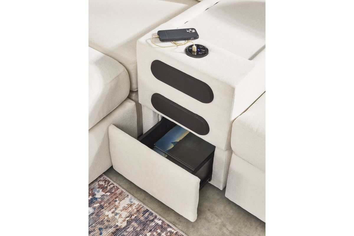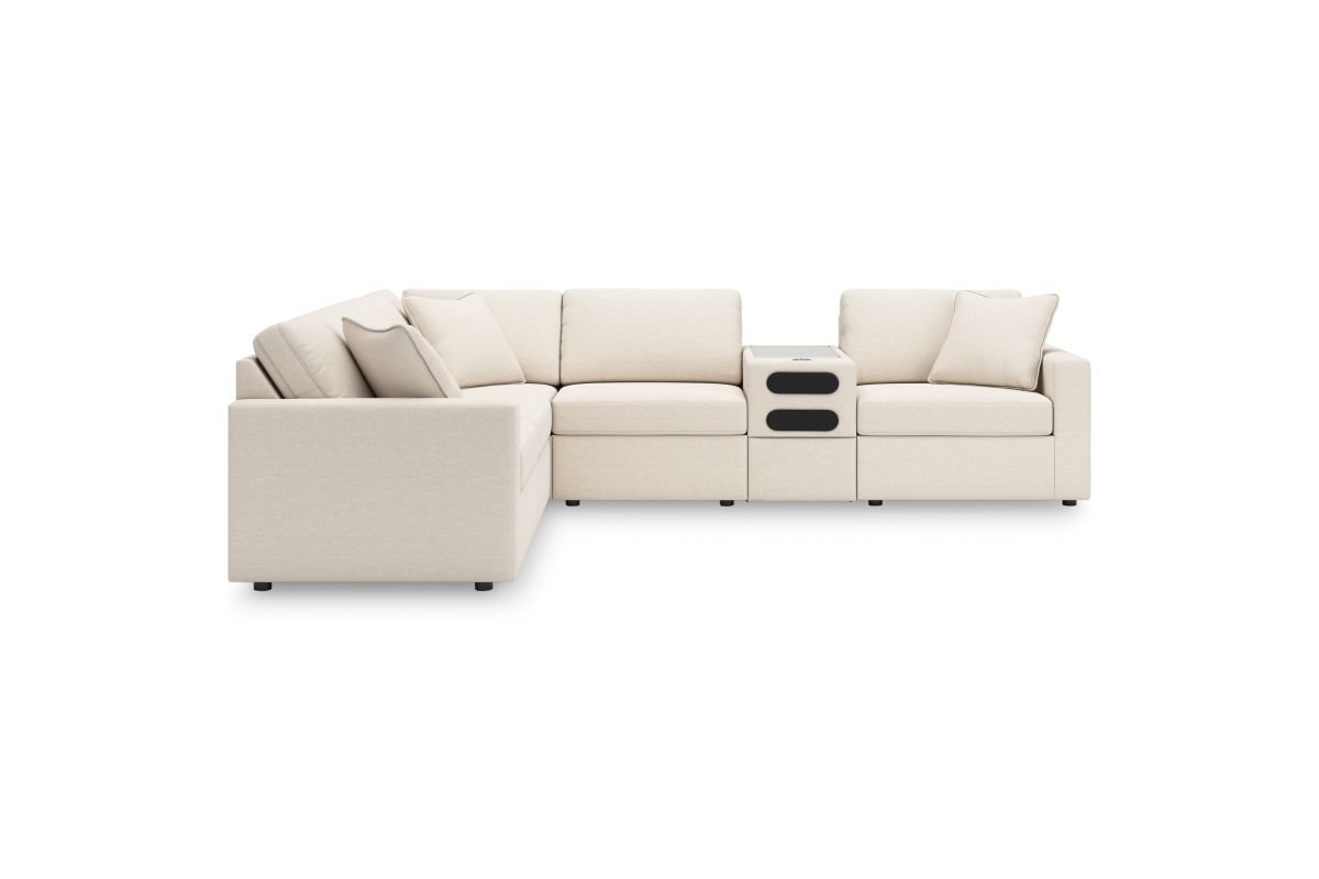 - Includes 6 modular pieces: left-arm facing corner chair, 2 armless chairs, wedge, audio console with storage and right-arm facing corner chair