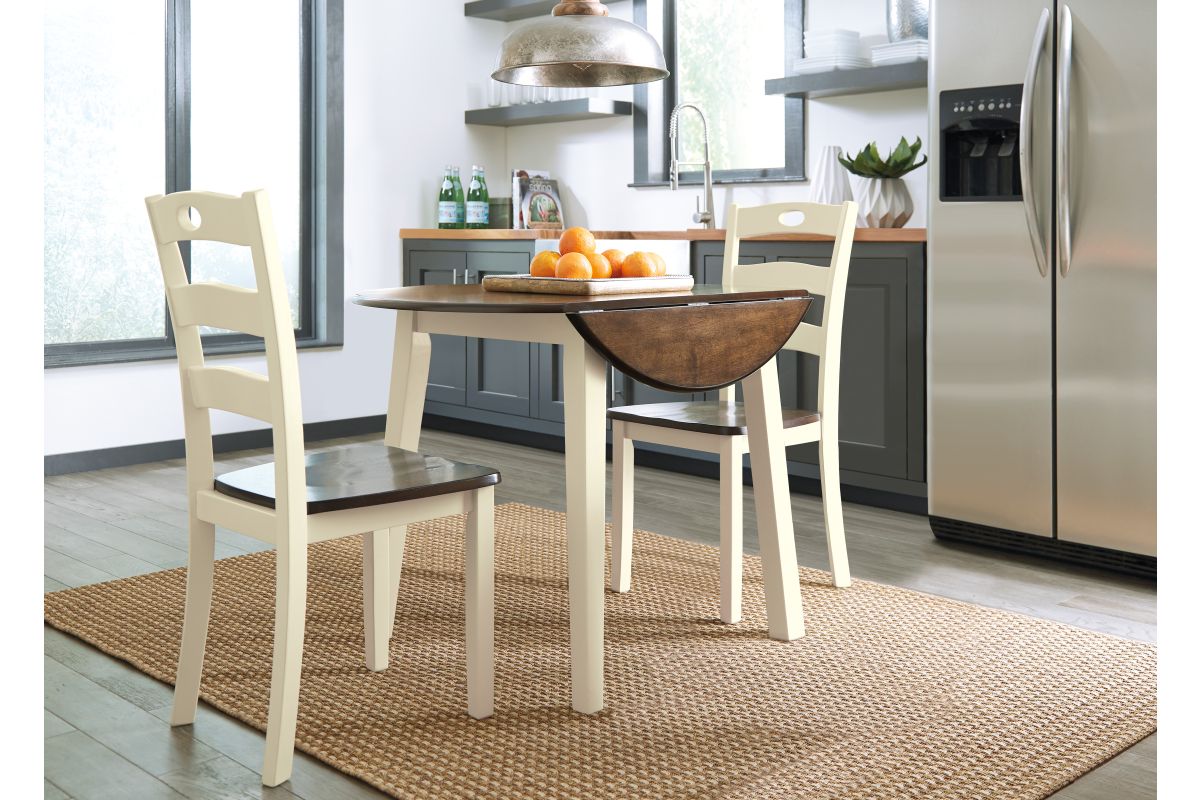 Turn your eat-in kitchen or dining space into a cottage-chic retreat with the Woodanville round dining table set. Two-tone finish serves up a double helping of charm. Chairs' pierced ladderback design is equally sweet and sophisticated.