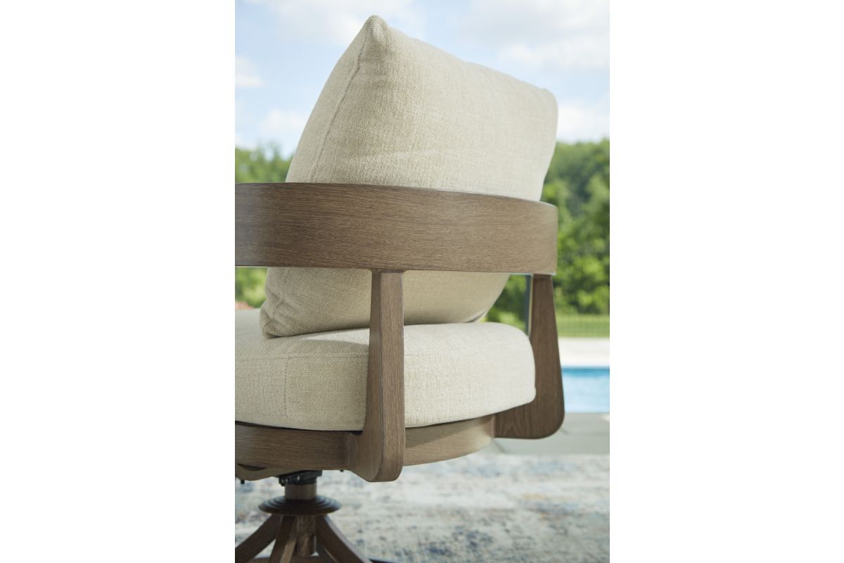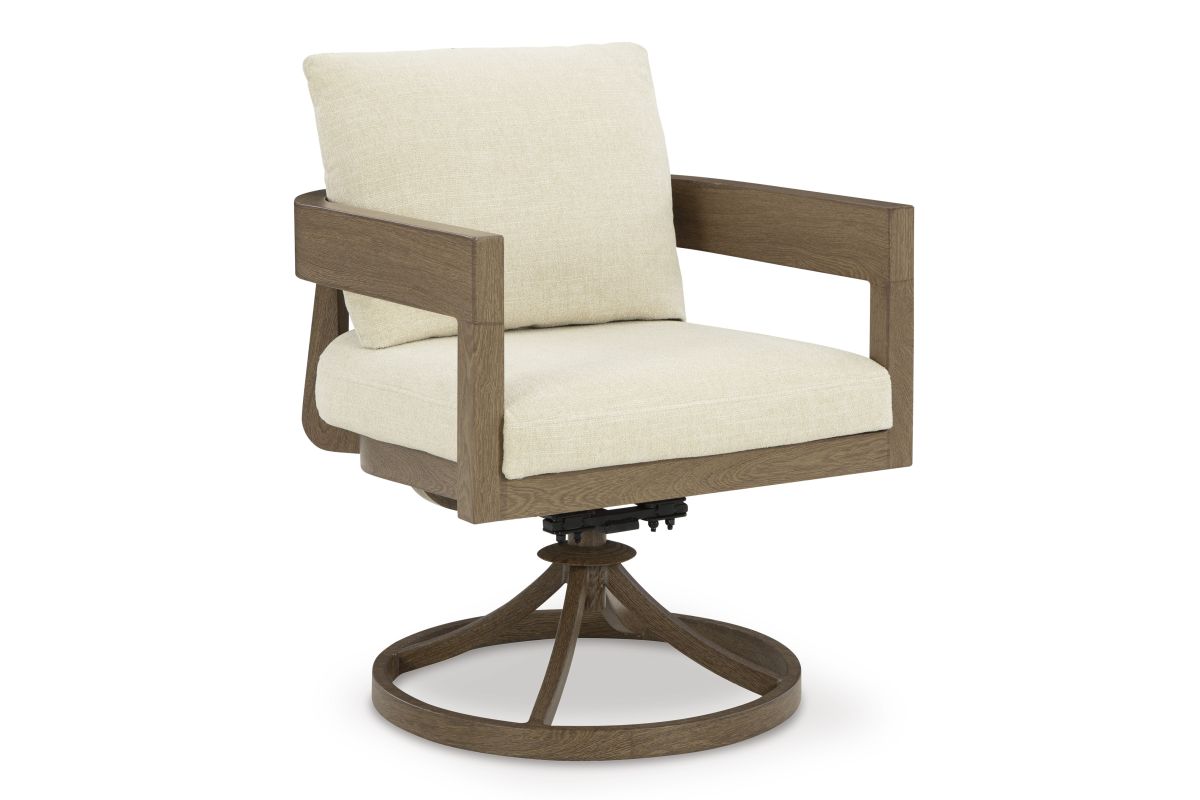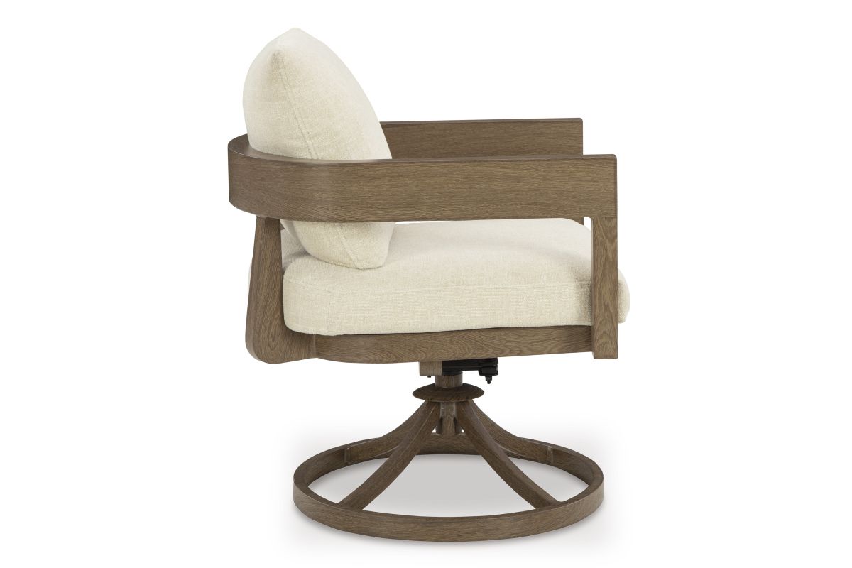 Elevate the appeal of easy-breezy living with this outdoor swivel dining chair. Made to look like wood yet durable enough to weather the elements, it's sure to serve you and your besties well, year after year. The gently curved chair features cushions wrapped in Nuvella+™ high-performance fabric for plush refinement. Go ahead and take a spin.