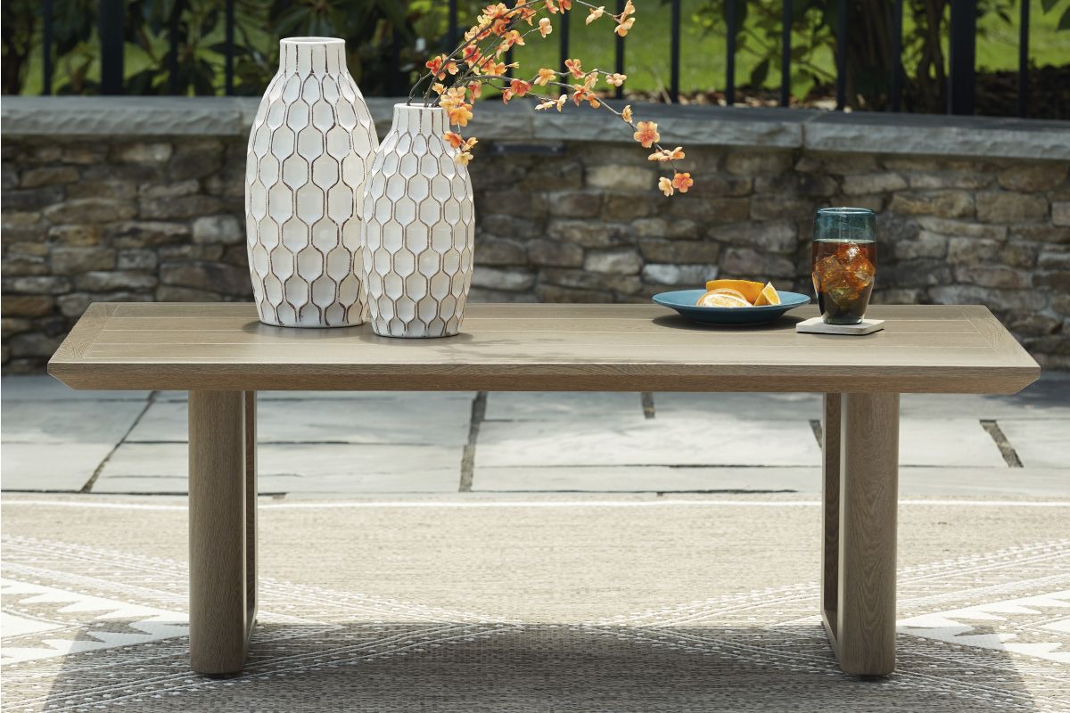 Elevate the appeal of easy-breezy living with this outdoor coffee table. Made to look like wood yet durable enough to weather the elements, it's sure to serve you and your besties well, year after year. This table's cool character is made for warm memories.
