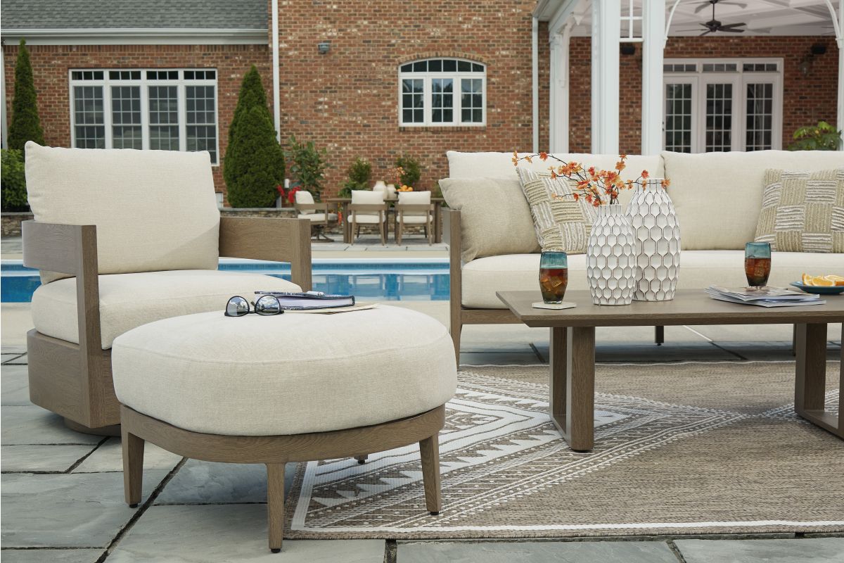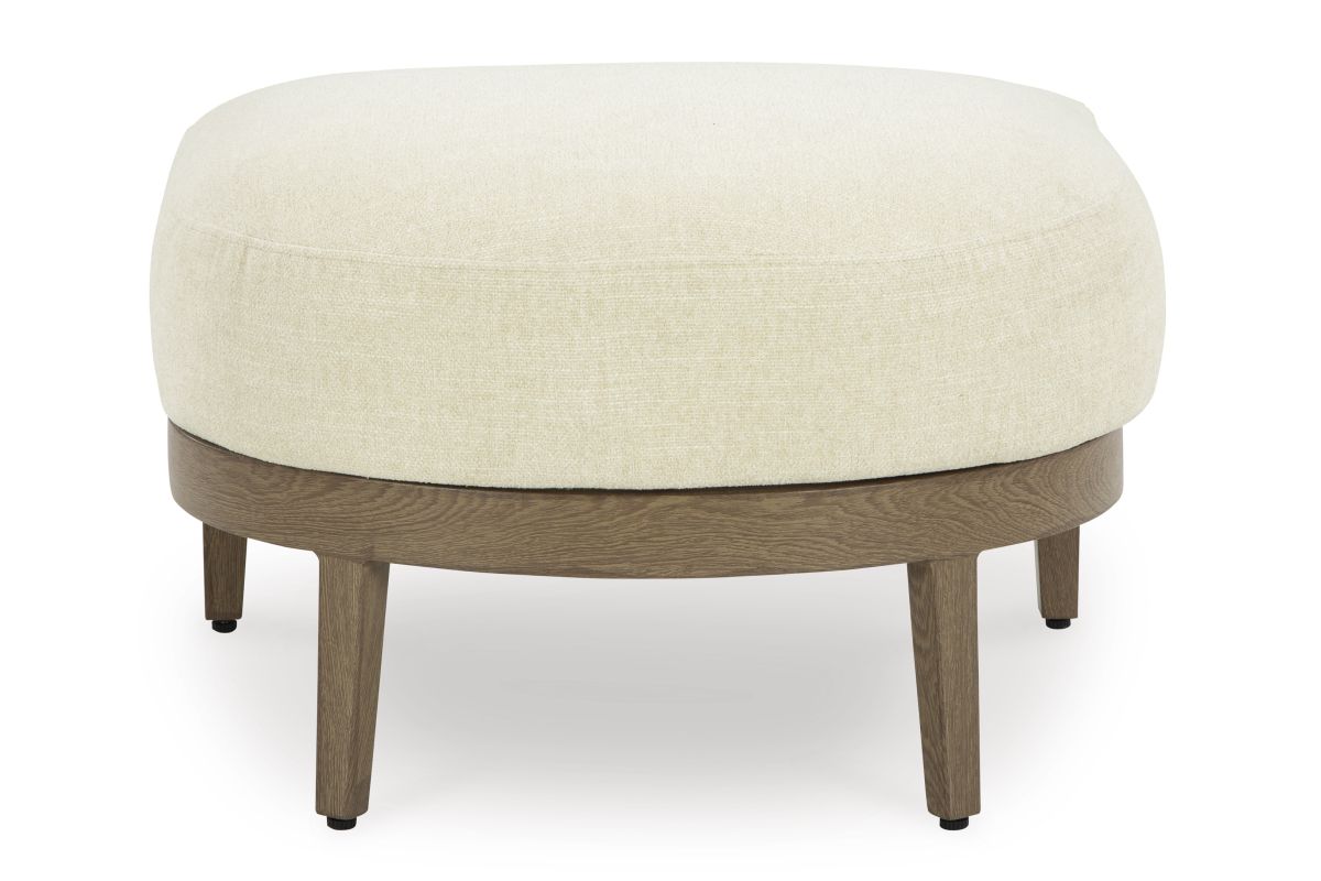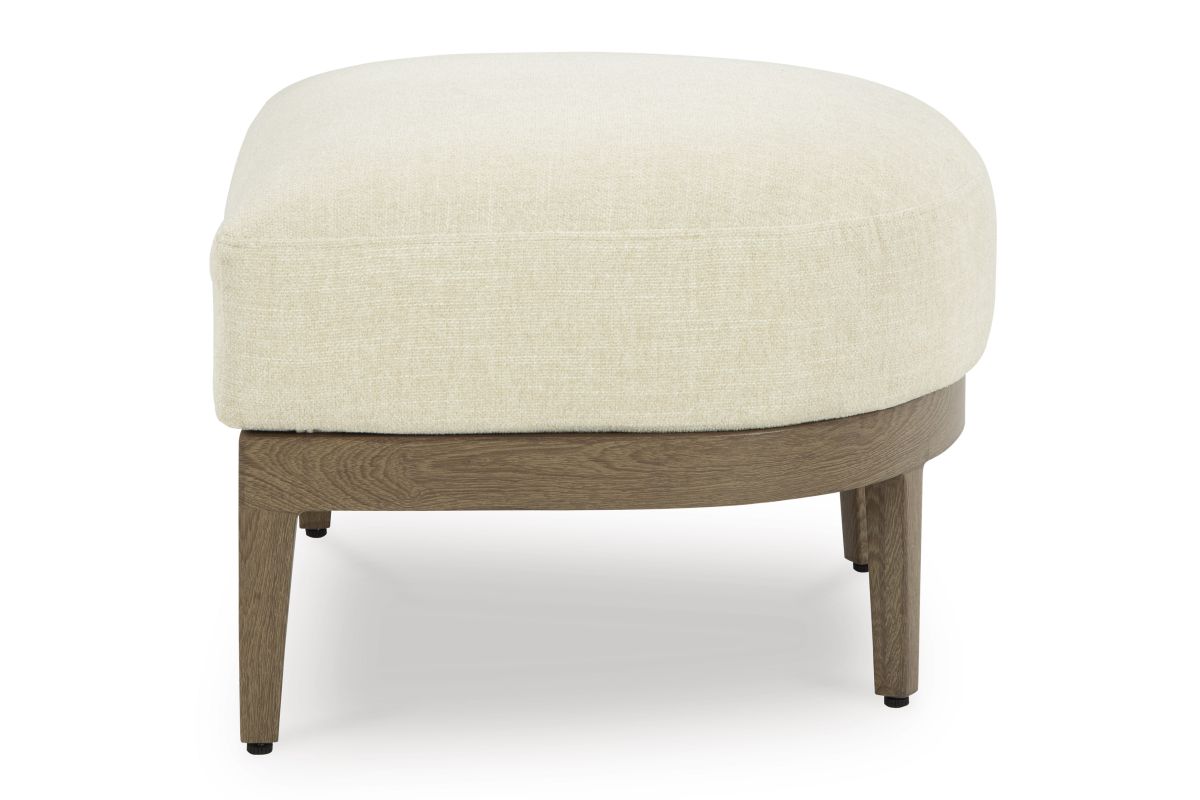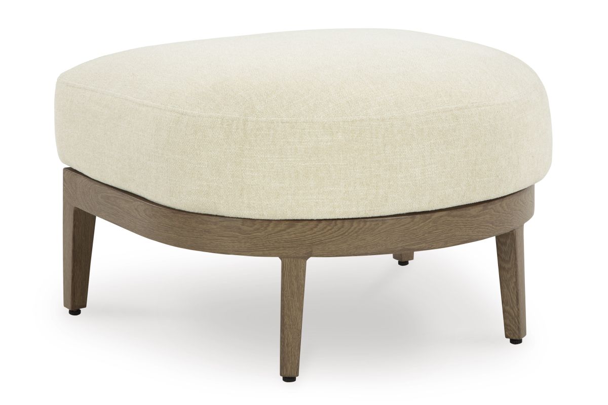 Elevate the appeal of easy-breezy living with this outdoor ottoman. Made to look like wood yet durable enough to weather the elements, it's sure to serve you and your besties well, year after year. The gentle curve of the frame is echoed in the cushion, which is covered in Nuvella+� high-performance fabric. Talk about plush refinement.