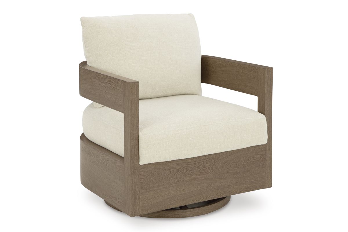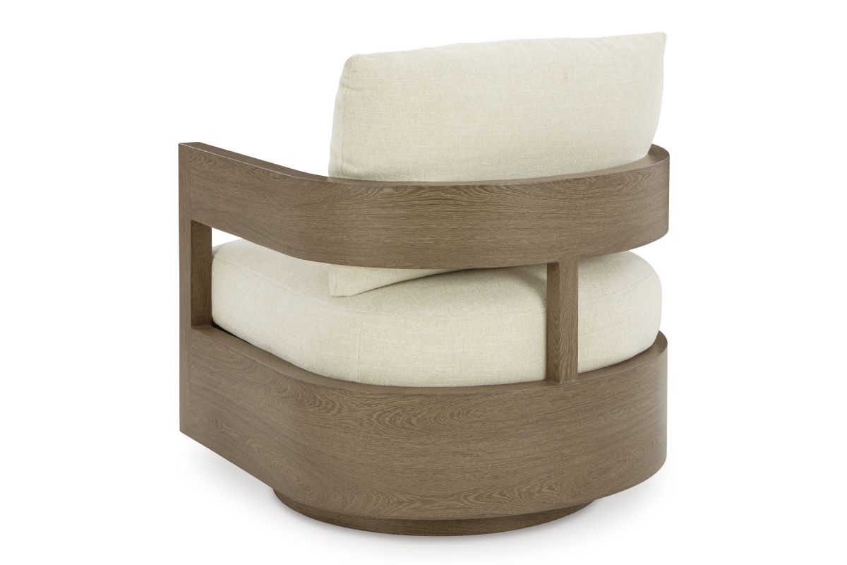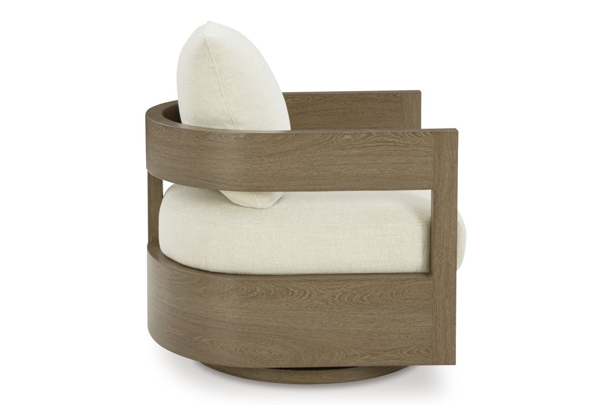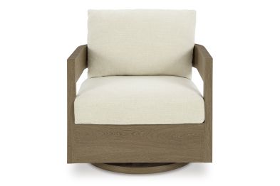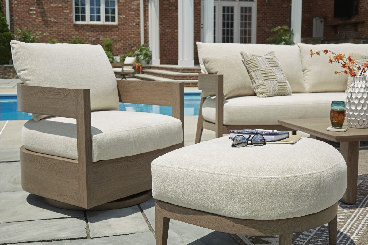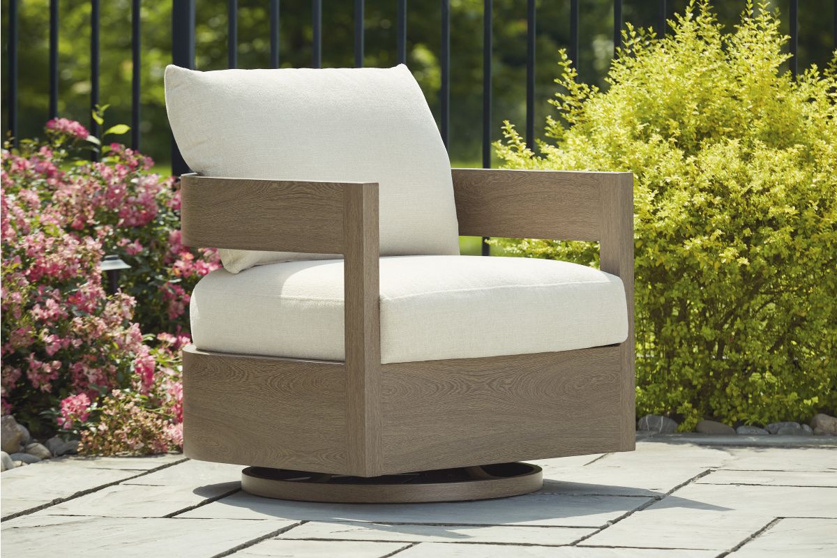 Elevate the appeal of easy-breezy living with this outdoor swivel glider chair. Made to look like wood yet durable enough to weather the elements, it's sure to serve you and your besties well, year after year. The gently curved chair features cushions wrapped in Nuvella+™ high-performance fabric for plush refinement. Go ahead and take a smooth spin.