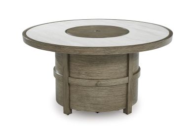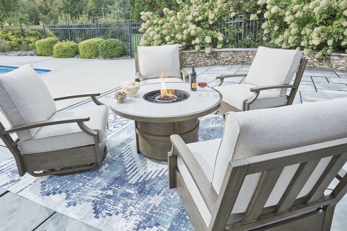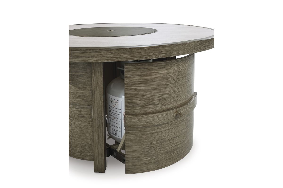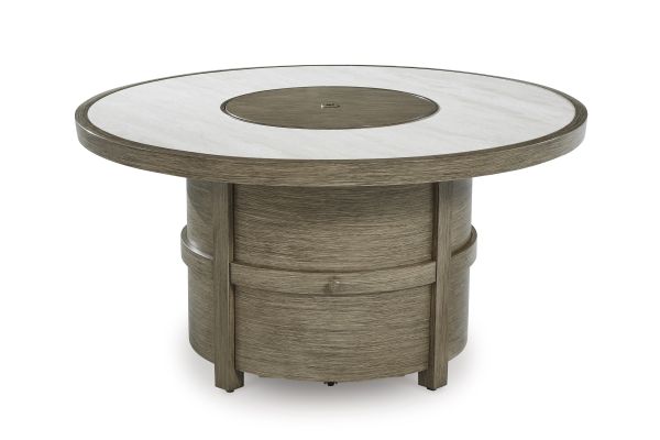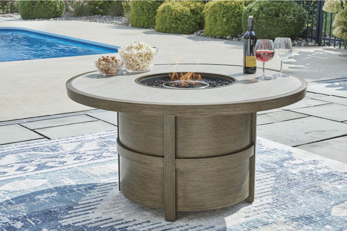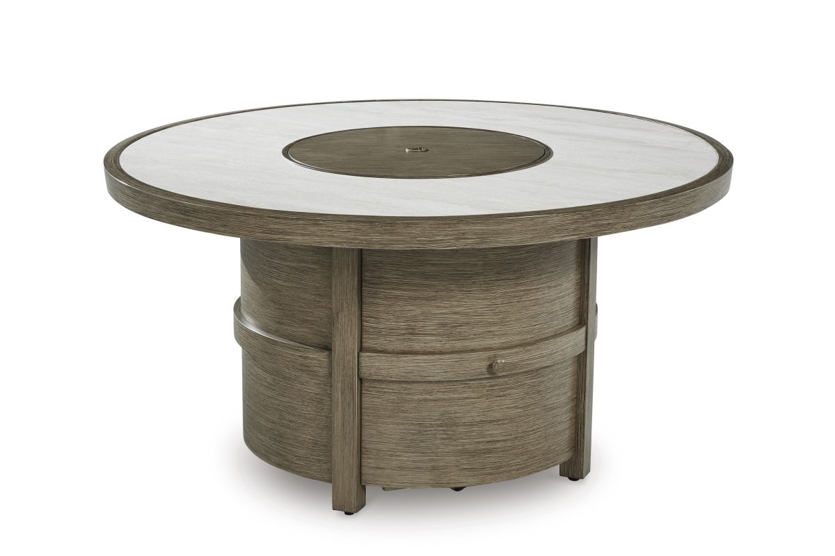 Experience the perfect combination of durability and style with this outdoor fire pit table. An aluminum frame with a wood-look finish maintains a sleek, contemporary aesthetic, while the sintered stone tabletop adds an element of natural elegance. A stainless steel burner with glass beads adds a captivating element sure to wow. This delightful addition to your outdoor dining creates an oasis where comfort and beauty thrive.