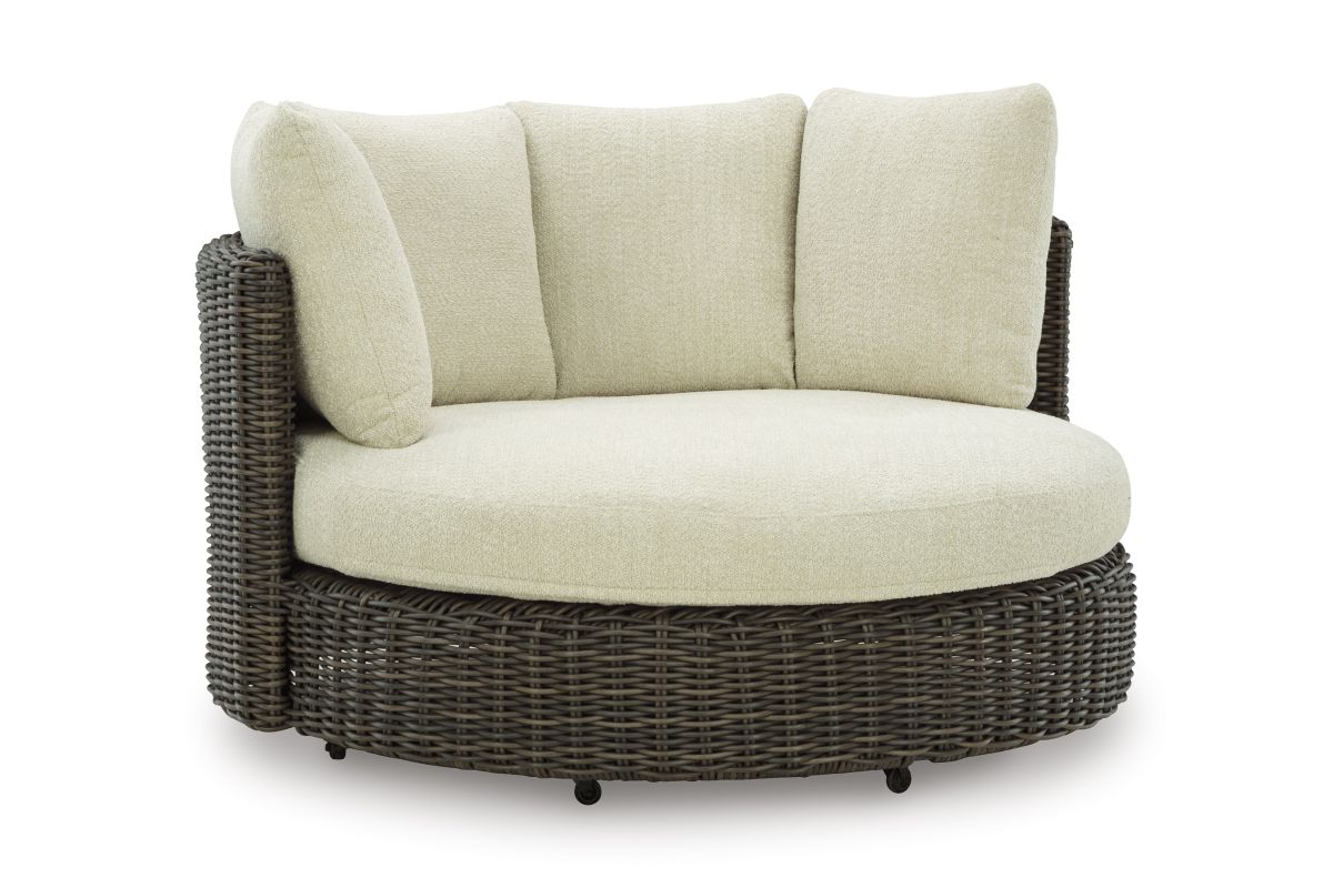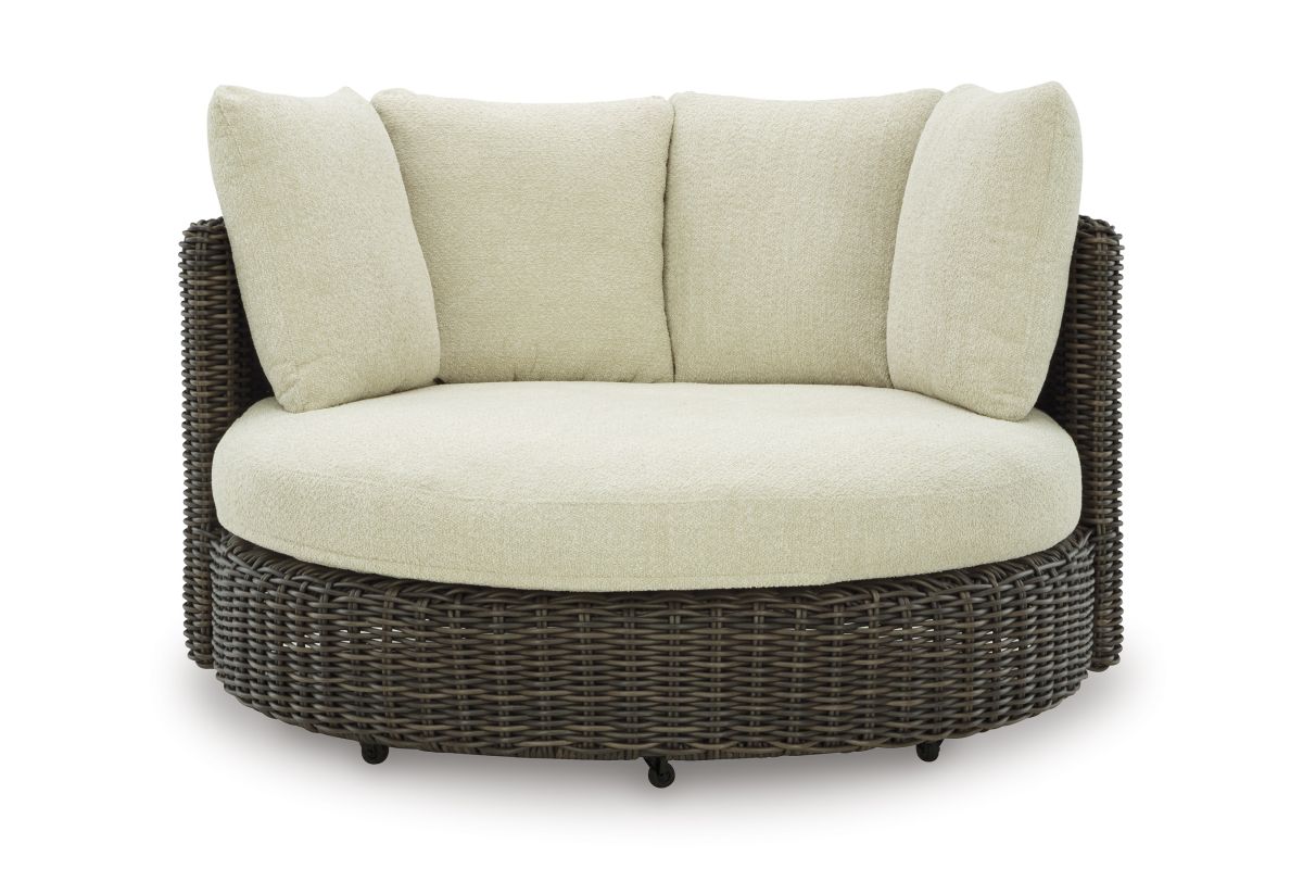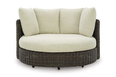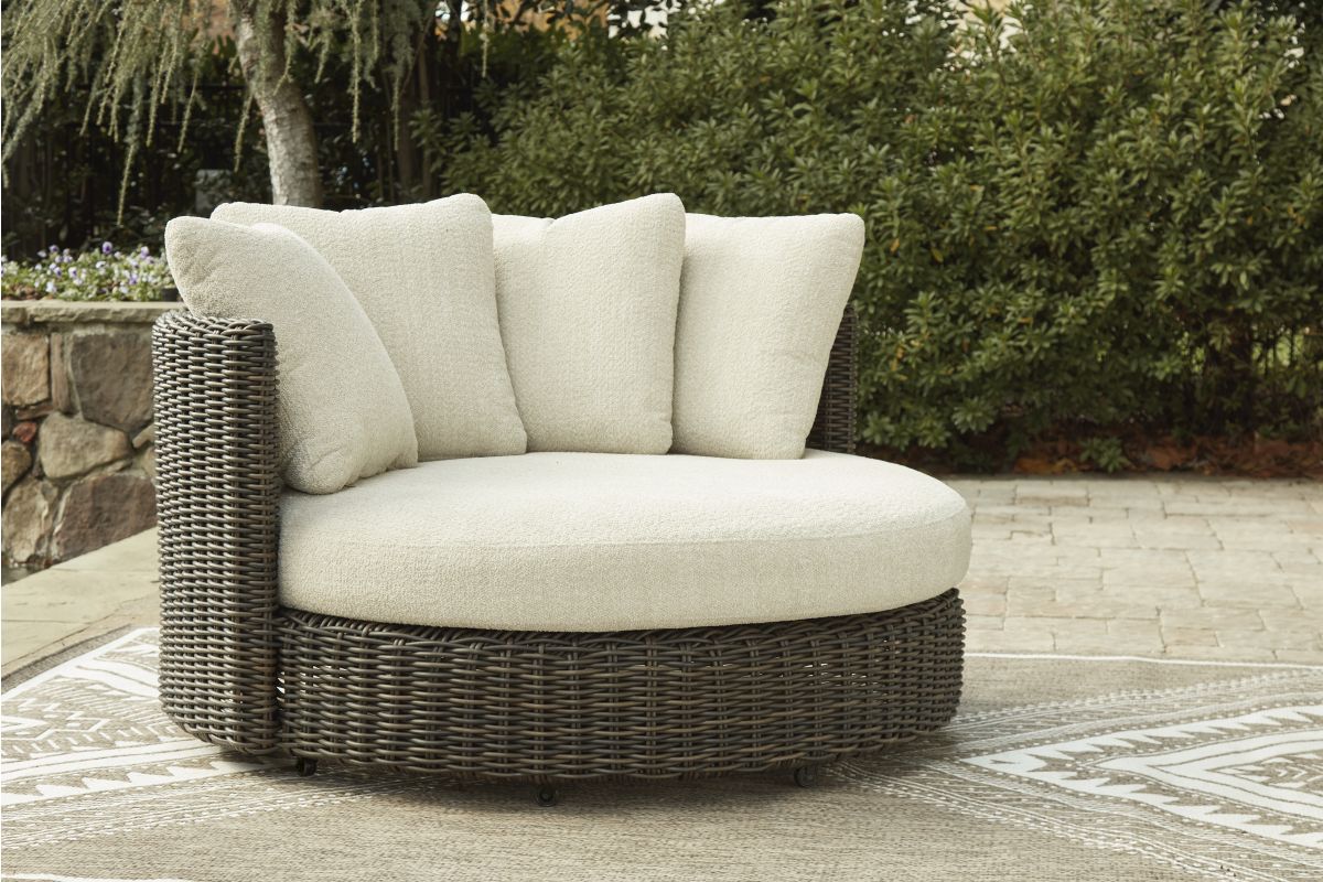 Add luxury, comfort and durability to alfresco fun. This outdoor swivel lounge chair captures the textural beauty of wicker while withstanding the elements, from rain to shine. With a UV-resistant design, the wonderfully low-maintenance Nuvella+™ fabric maintains its good looks over time. Deep, roomy seating completes the piece, offering ample space to sprawl out.