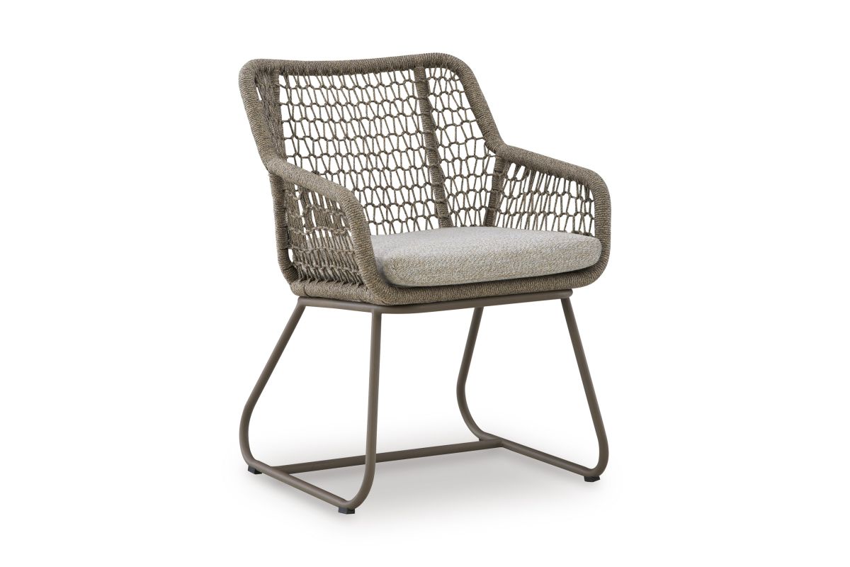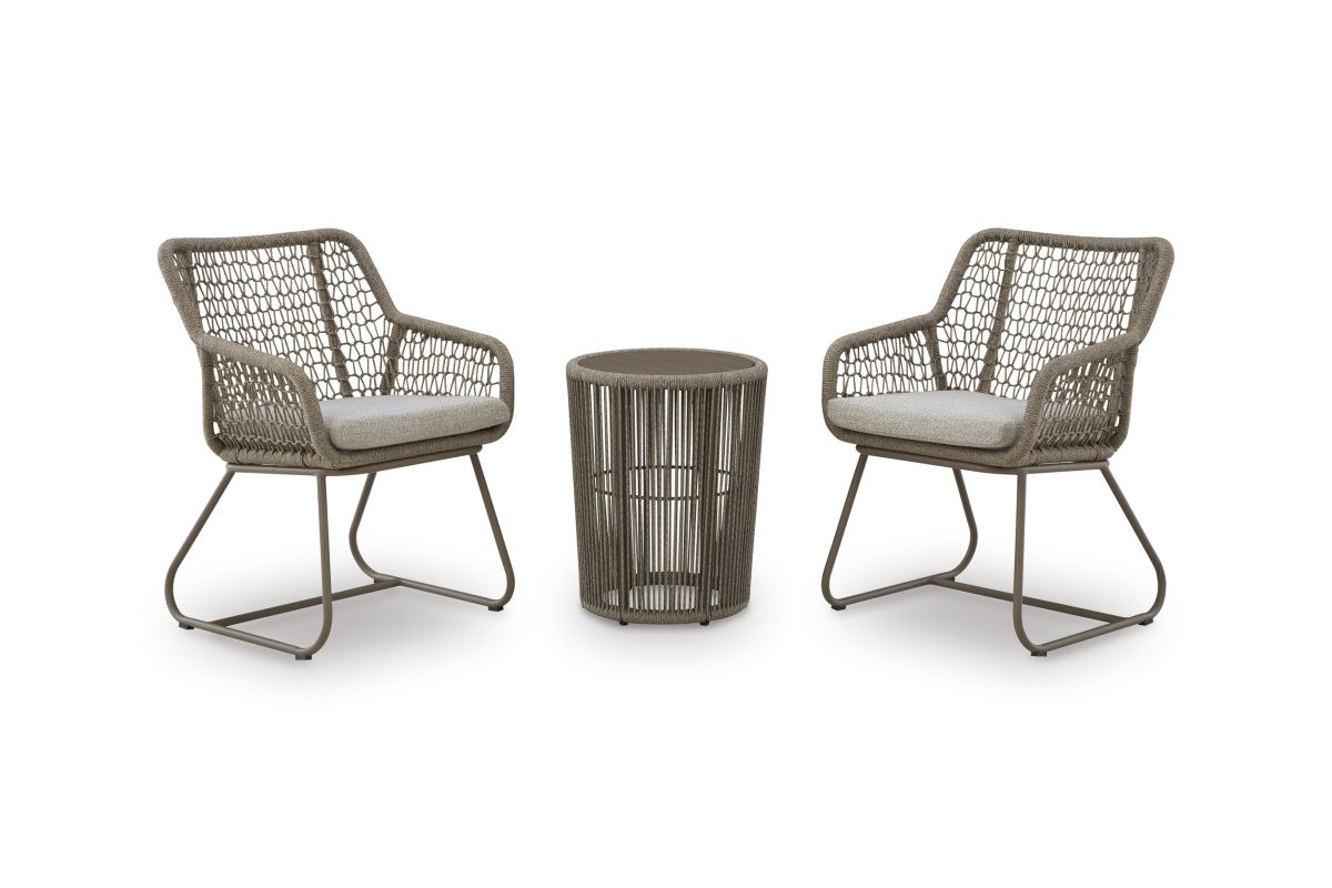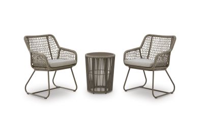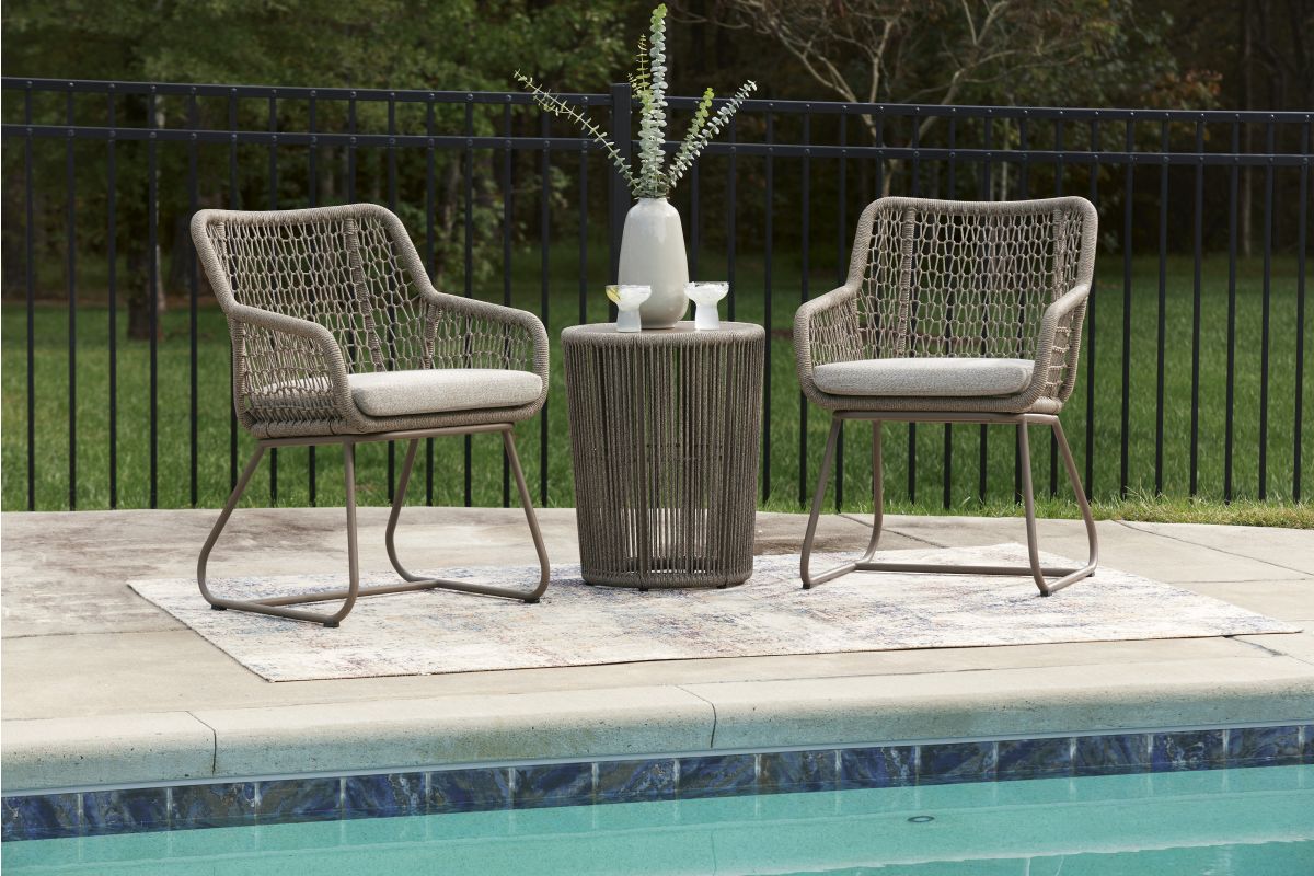 On-trend style, made for outdoor living. This outdoor table and chair set impresses with its contemporary vibe and durable construction. Detailed rope designs on sturdy aluminum frames make a chic impression. And with UV-resistant performance fabric, the cushions stay vibrant as they weather the elements.