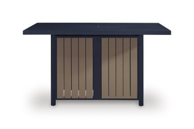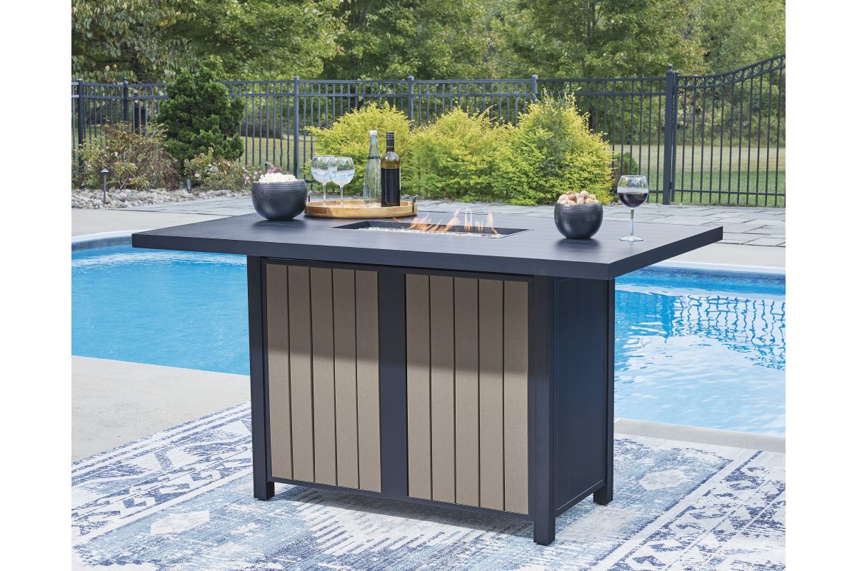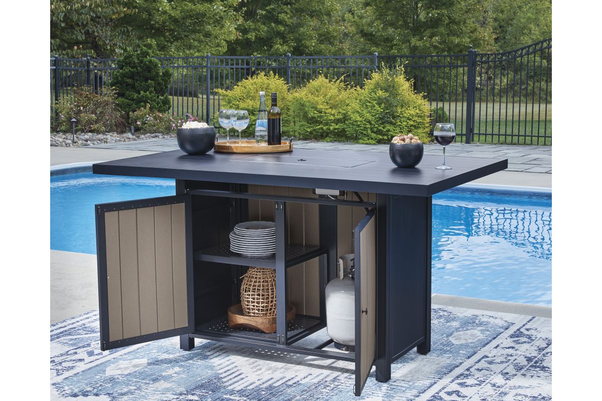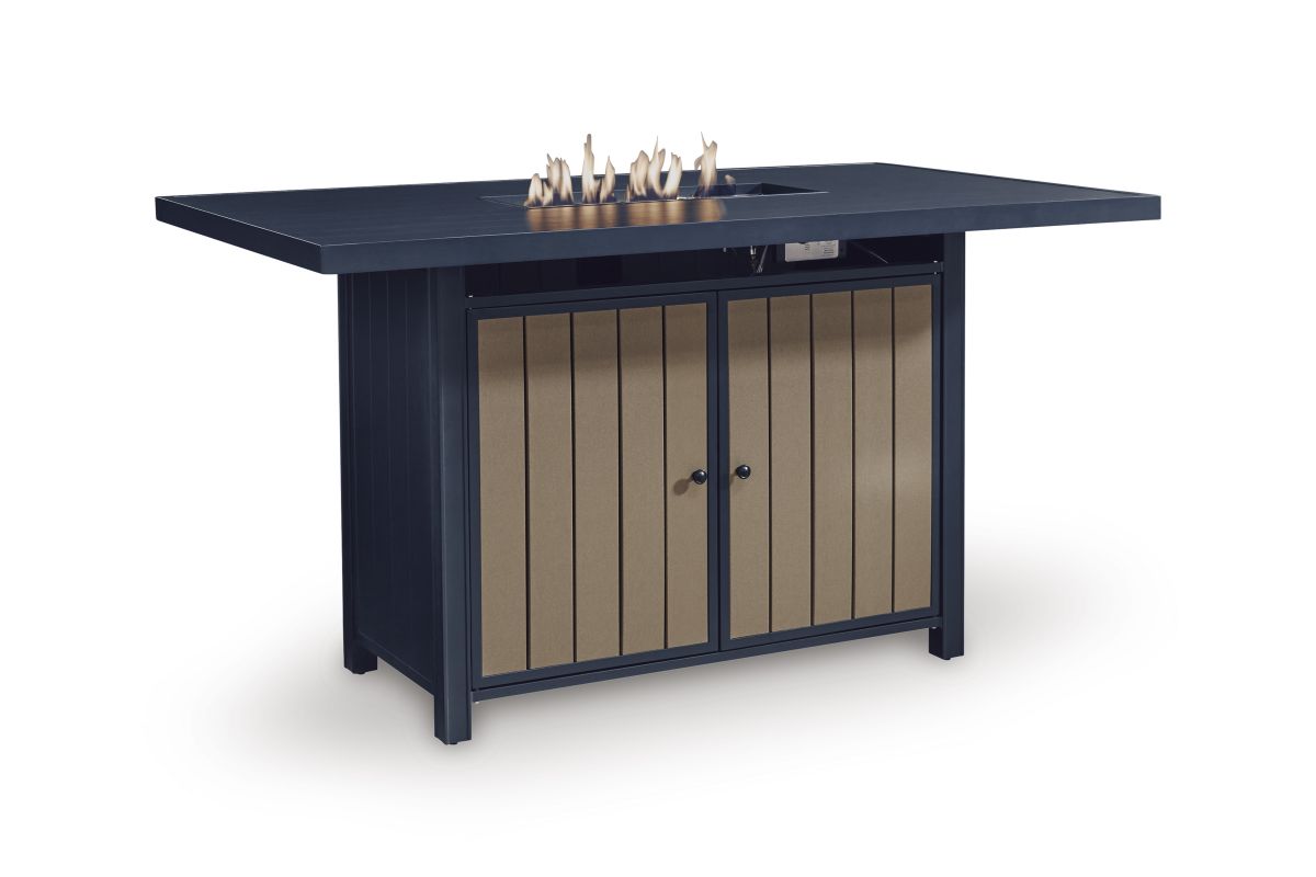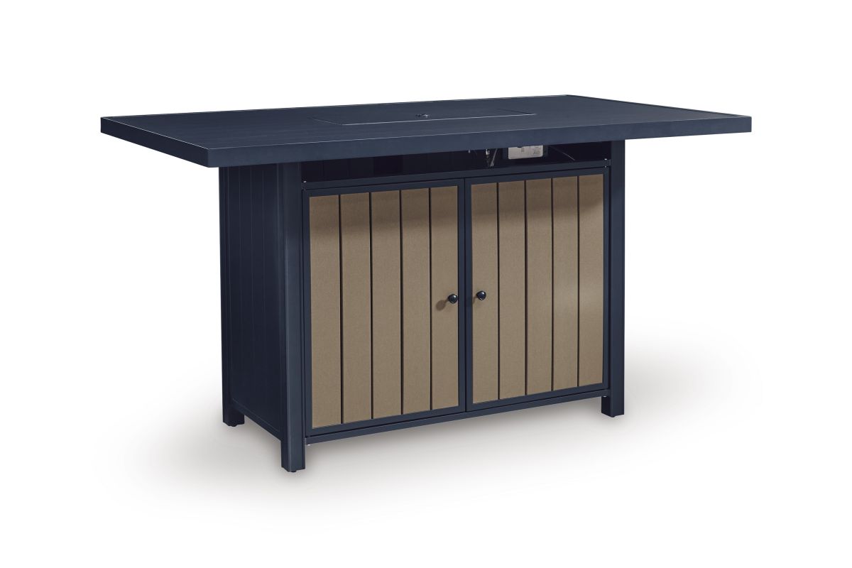 Easy-breezy beauty, made to withstand the elements. This outdoor bar table with fire pit makes a serene statement with its soothing shade of blue and contrasting wood-look cabinets. An integrated fire pit in the top adds a perfectly cozy vibe. Crafted with durable materials for added longevity, it's a smartly stylish addition to your outdoor oasis.