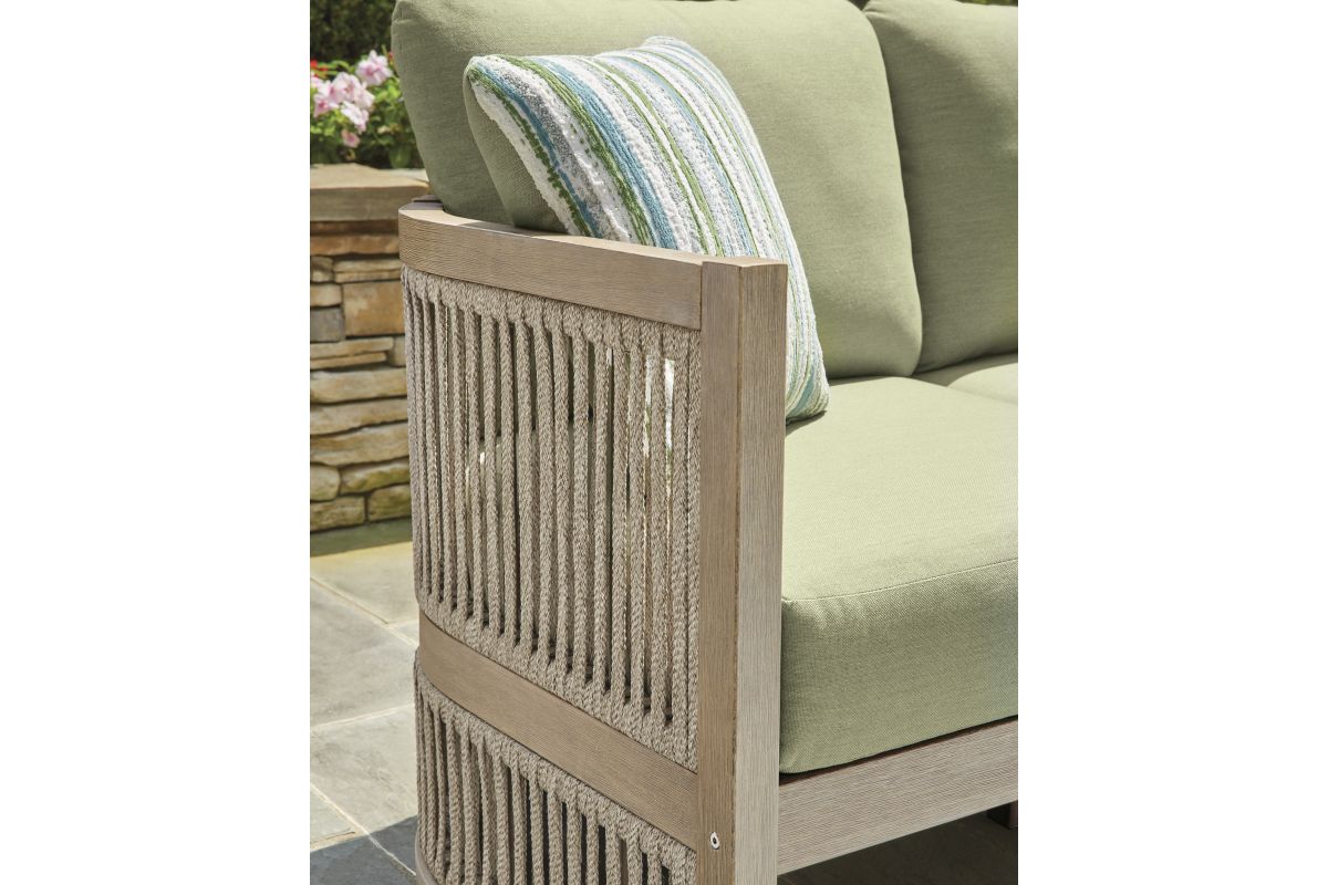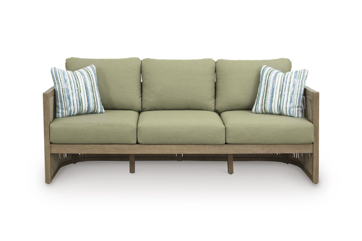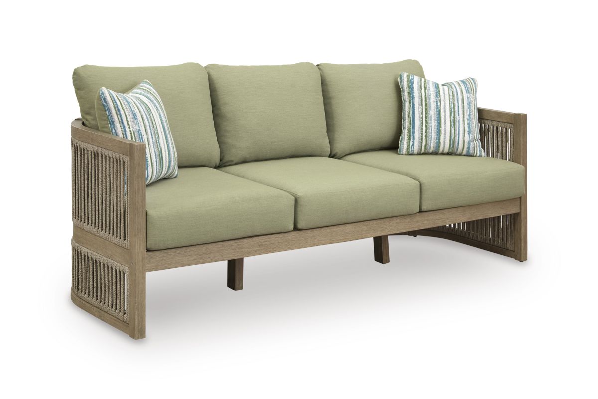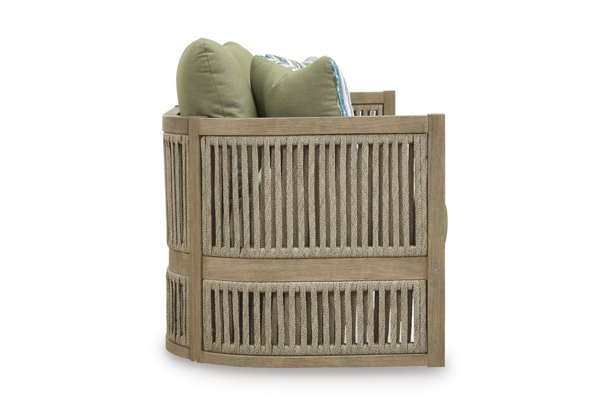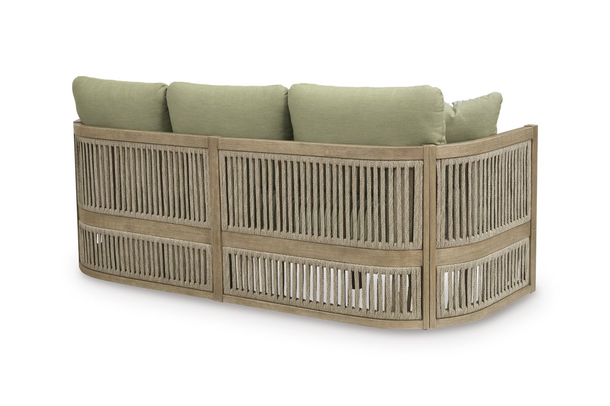 Round out your outdoor living space with the naturally beautiful look of wood. This cushioned sofa will serve up seasons of relaxation on your back deck or sitting pretty by the pool. The couch's gently curved, open-weave design is crafted from eucalyptus wood and polyester rope, for the perfect merger of high fashion and lasting durability. Plush cushions and accent pillows are wrapped in cleanable, UV-resistant Nuvella® fabric, making stylish living a breeze.