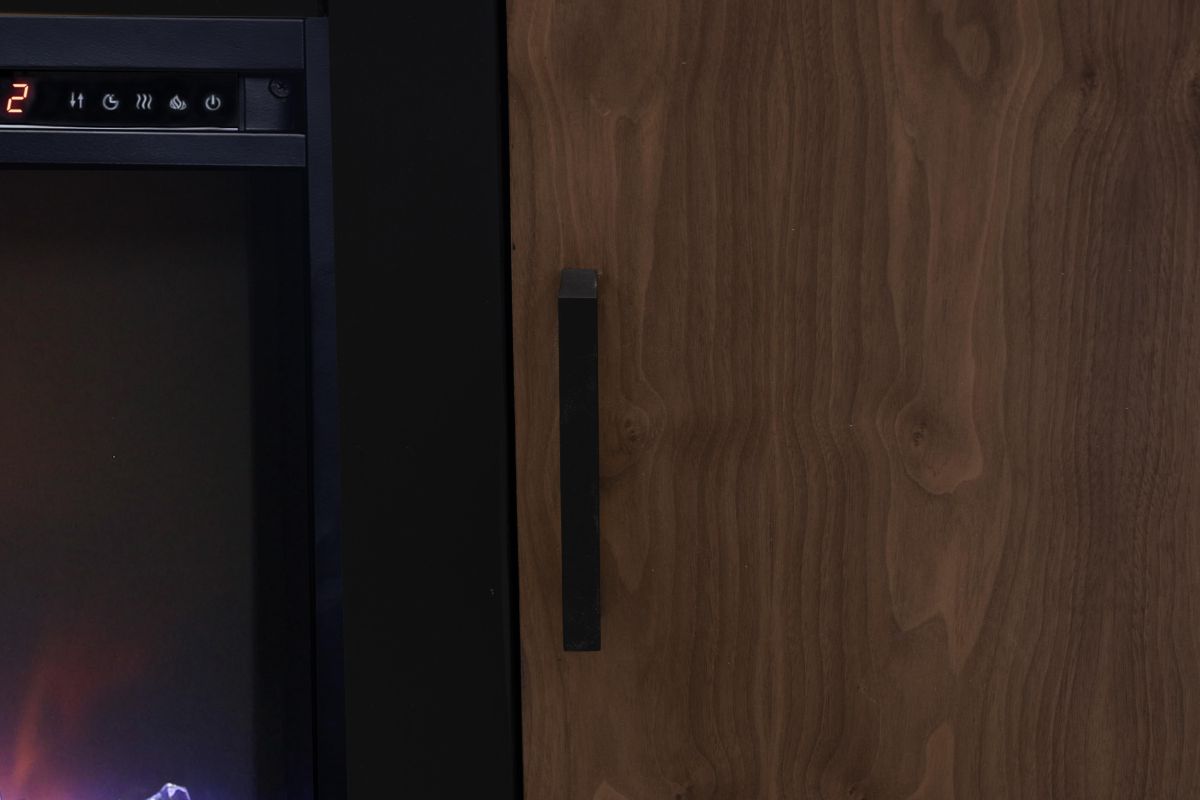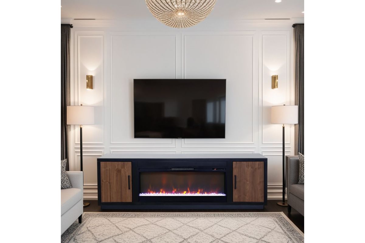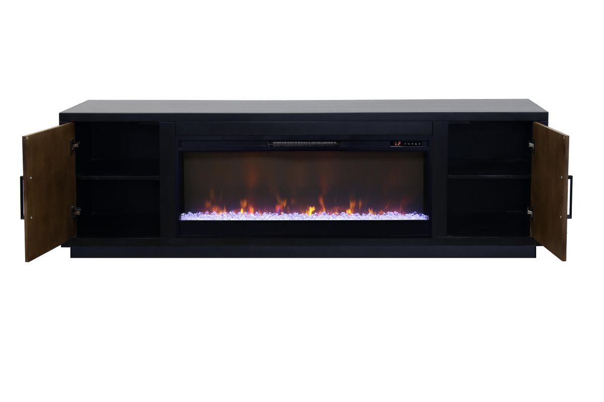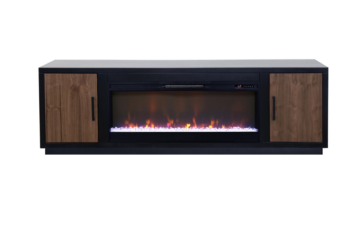 The Aria 80 inch Fireplace TV Stand boasts chic, modern, contemporary style. Exquisitely crafted from Poplar Solids and Okoume Veneers and Walnut Veneers, this Entertainment Center with Fireplace features clean, structural lines, a Two-Tone Black and Walnut finish, Black hardware and plinth base. This Fireplace TV Console will accommodate TVs up to 95 inches and will provide ample storage for media and gaming consoles behind two doors. Cable management openings on the back panel will keep all cords and wires concealed. The 42" Electric Fireplace Insert includes a remote control and multiple settings allow for heat up to 400 square feet. Four (included) screws make securing the fireplace insert to the console quick and simple.