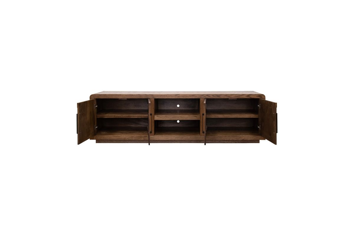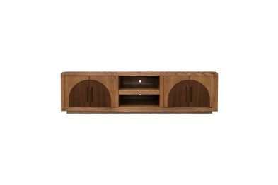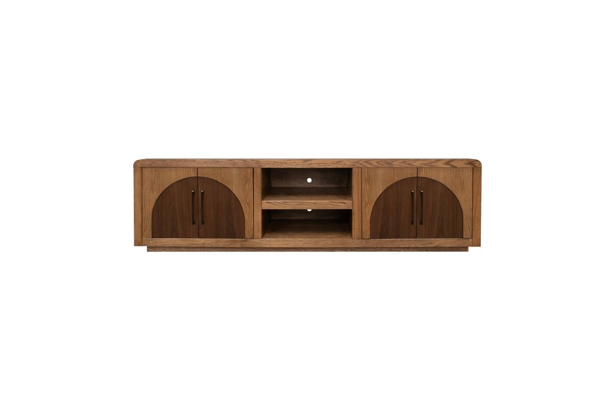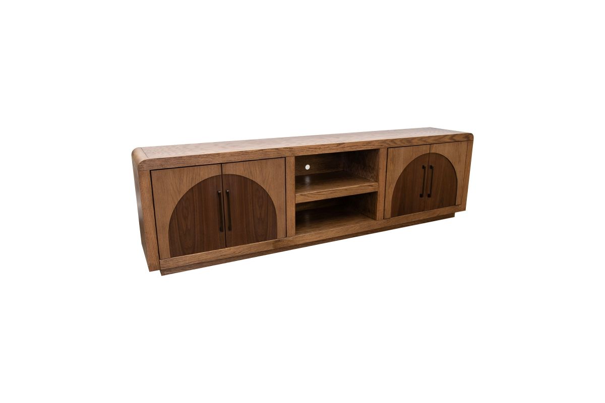Bring Home the Eclipse 92 inch TV Stand Console for sophisticated reimagined vintage style. Beautifully crafted from Oak Solids and Veneers and Walnut Veneers, this Entertainment Center rests atop a crisp plinth base and features striking two-tone finish inlay arch panels on the doors that mirror the curves of the top corners. Each door includes Antique Bronze Hardware and conceals interior shelving for media and gaming consoles. Designed to accommodate TVs up to 100 inches, this TV Console Cabinet also includes cable management openings on the back panel. Fully assembled upon arrival, this piece is ready to unbox and enjoy. Pair with the matching Bookcase Pier Cabinet to create a complete Entertainment Wall.