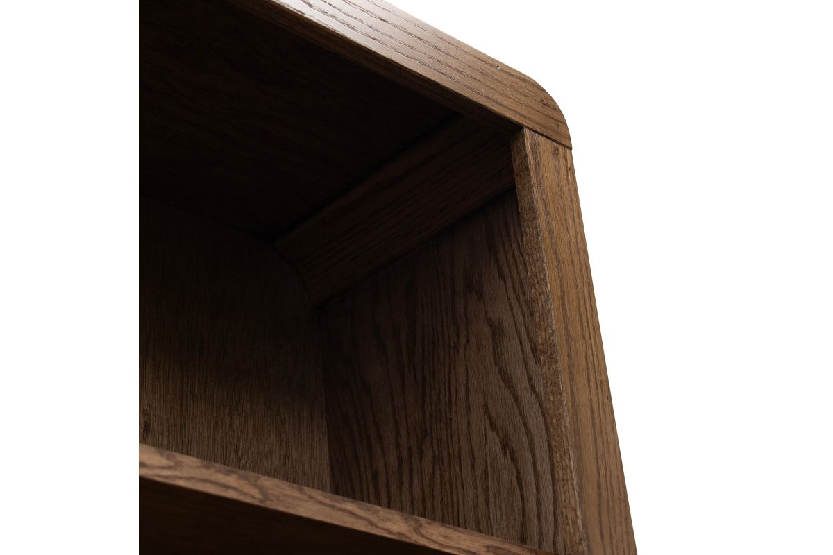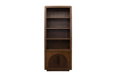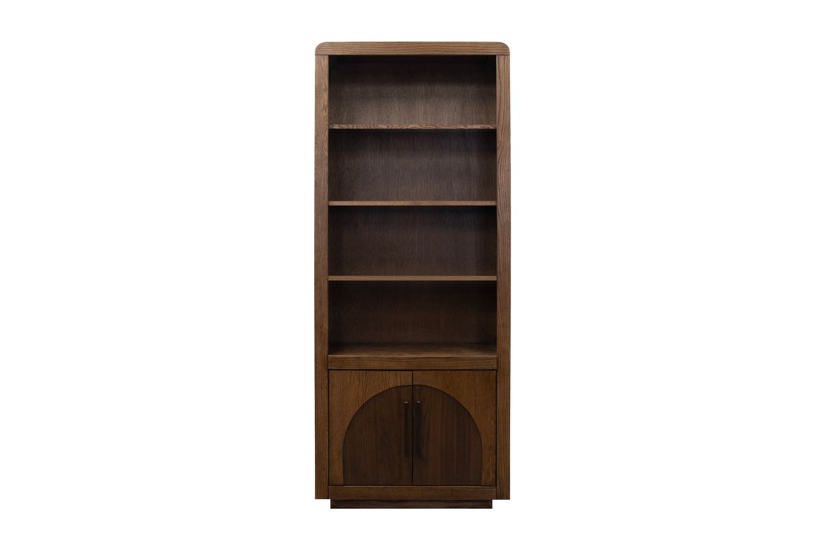 Bring Home the Eclipse 78 inch high Bookcase Pier for sophisticated reimagined vintage style. Beautifully crafted from Oak Solids and Veneers and Walnut Veneers, this Bookshelf Cabinet rests atop a crisp plinth base and features striking two-tone finish inlay arch panels on the doors that mirror the curves of the top corners. Showcase home decor and your book collection on open shelving above while concealing clutter behind two doors below. Pair with the matching TV Stand or Fireplace TV Stand to create a complete Entertainment Wall or display in multiples of two or three to form a chic bookshelf wall. Fully assembled upon arrival, this piece is ready to unbox and enjoy.