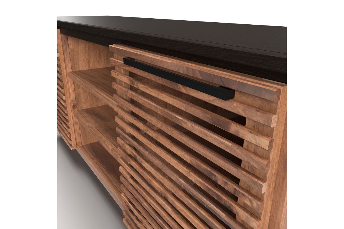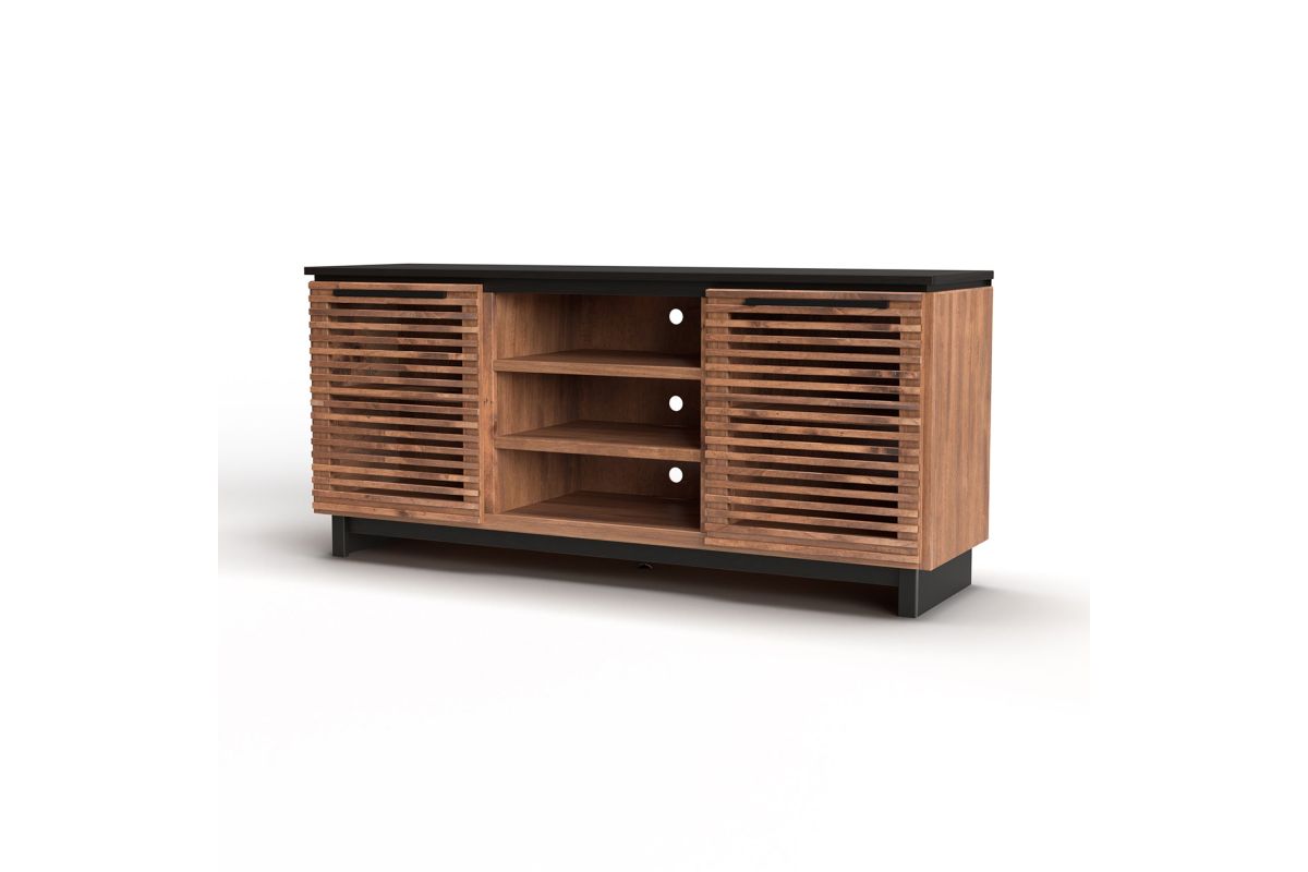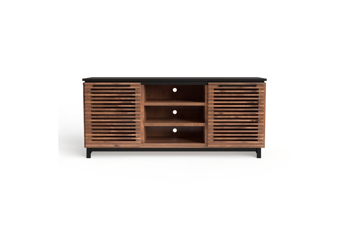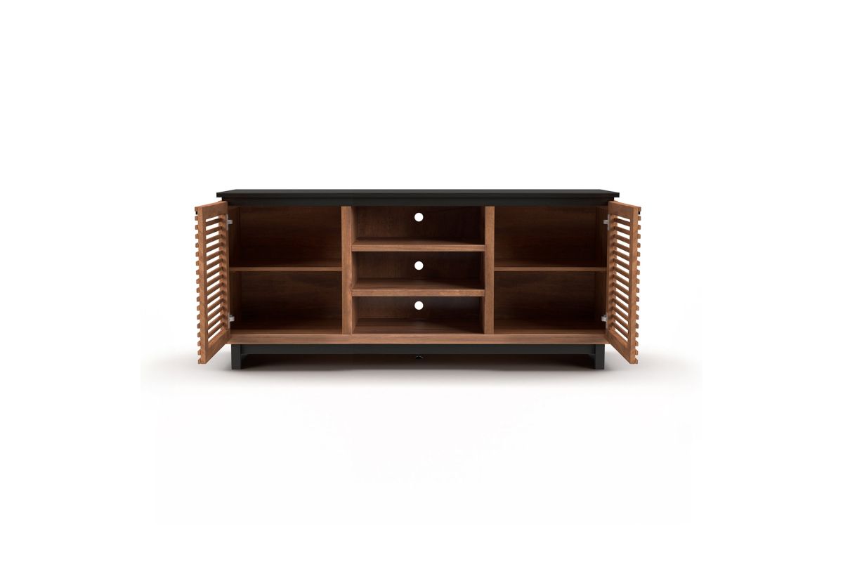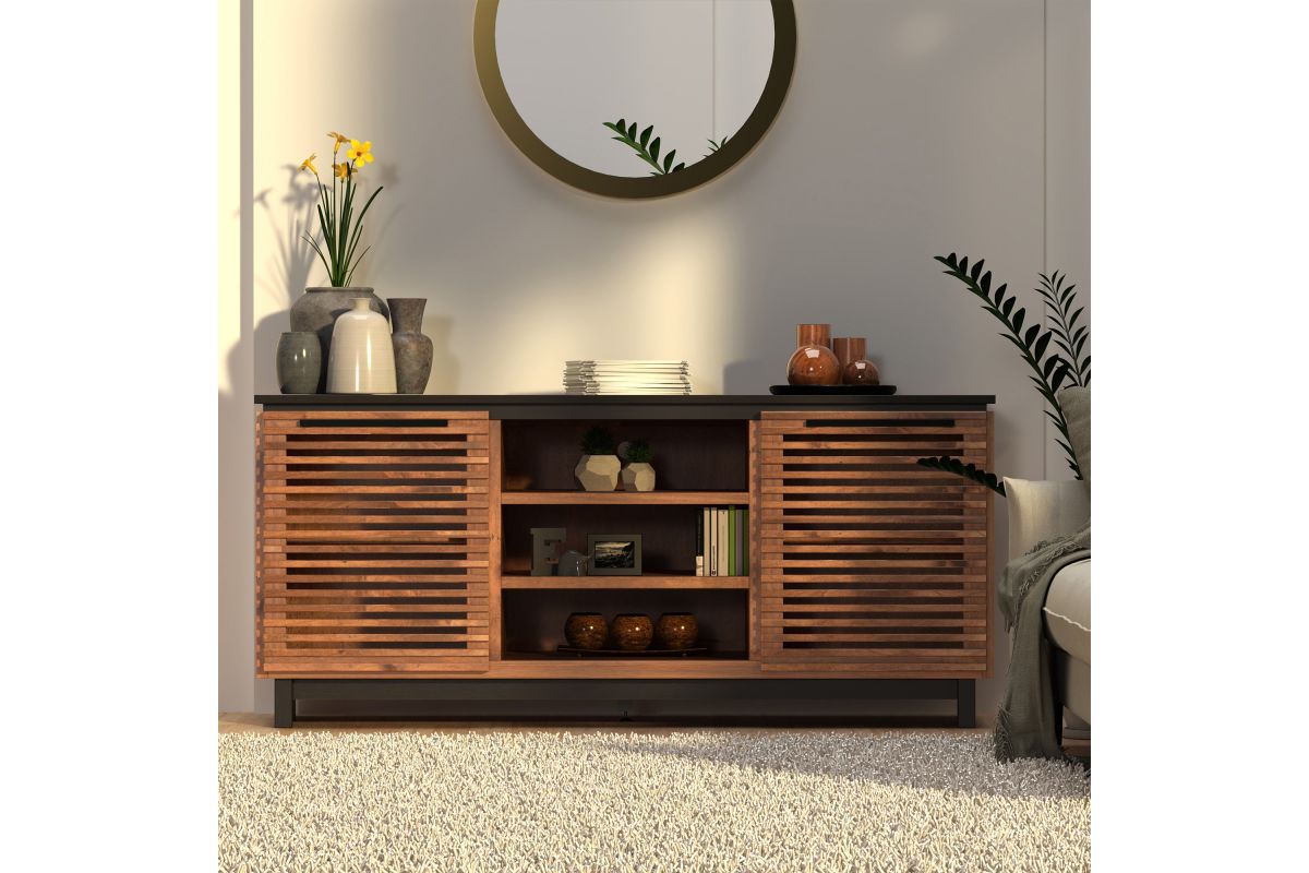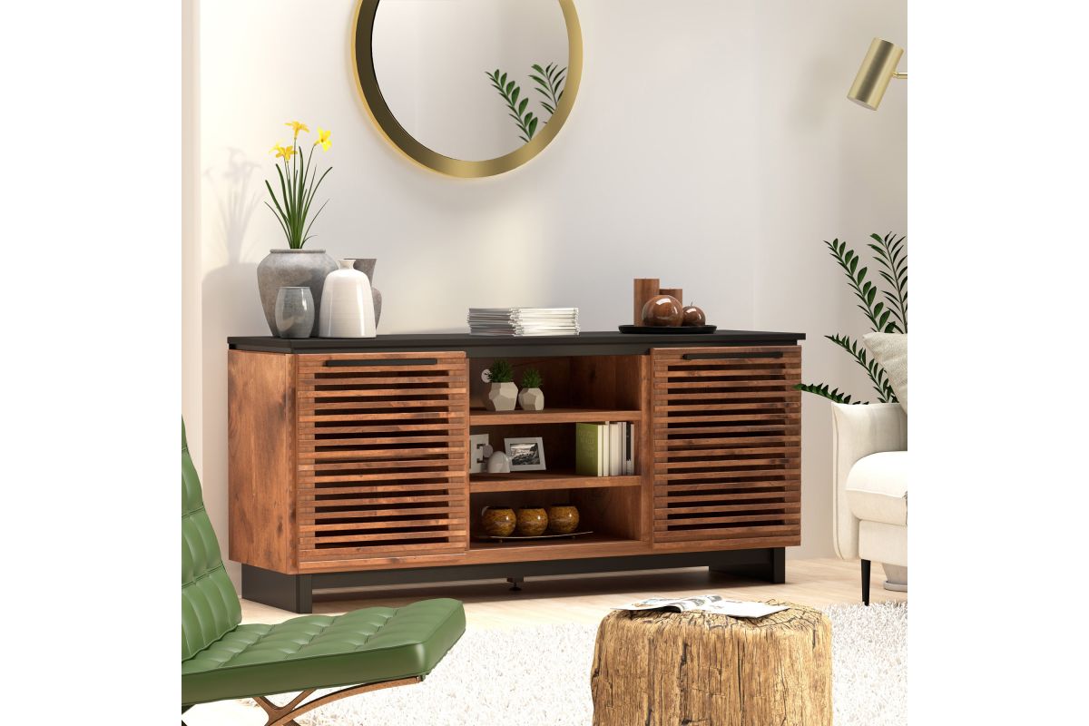 The Graceland 63" TV Stand exudes sophistication and a contemporary Hollywood charm reminiscent of Elvis's iconic style. Featuring a striking two-tone design with elegantly slatted doors, it's perfect for creating a standout media center. This piece comfortably supports TVs up to 70" and offers ample storage for all your entertainment essentials.