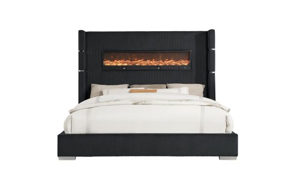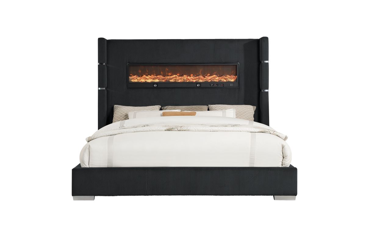 Unwind in pure luxury with this modern glam bed that brings warmth, ambiance, and elevated design into your bedroom. The tall, channel-tufted headboard makes a dramatic statement, while the built-in LED fireplace adds a cozy glow and contemporary edge. Wrapped in rich, textured fabric with chrome accent bands, this bed blends comfort and high style for the ultimate retreat. Whether you're curling up with a book or setting the tone for a relaxing evening, this bed transforms your space into a chic sanctuary.