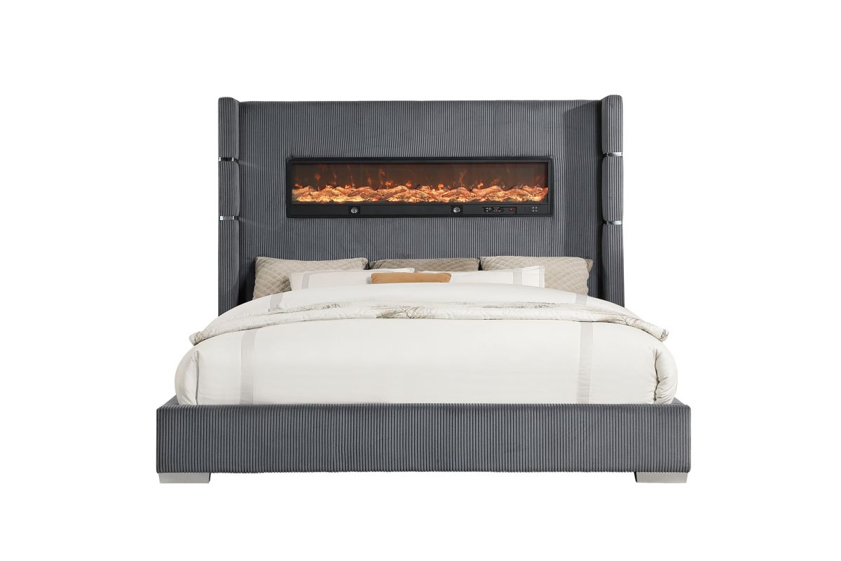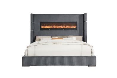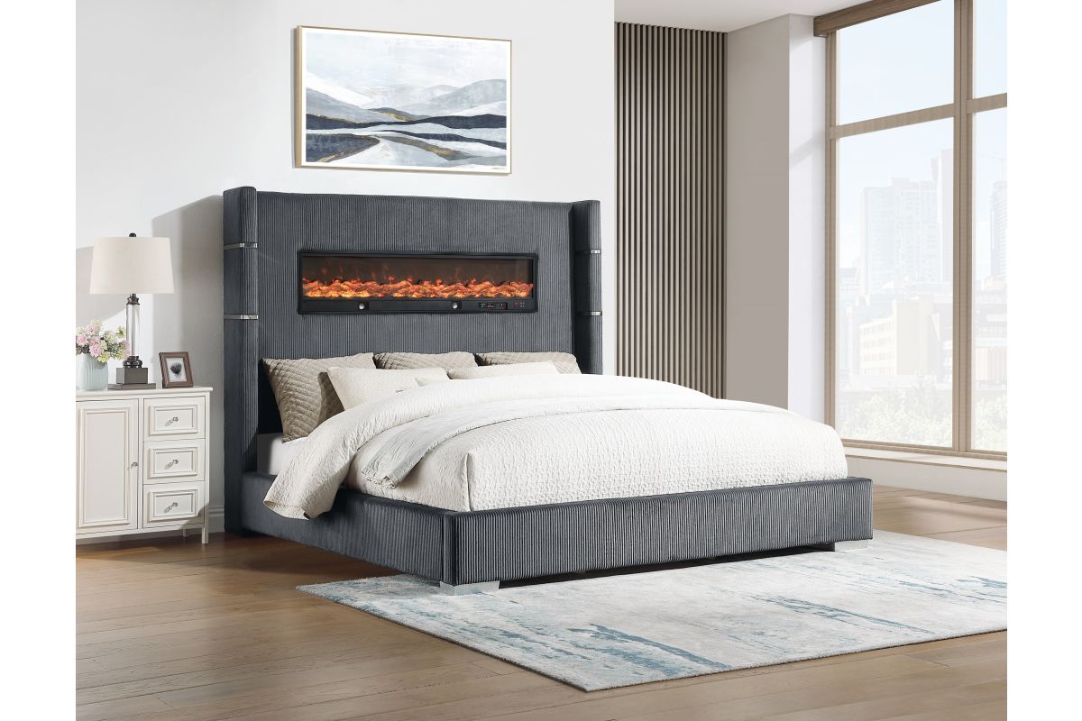Unwind in pure luxury with this modern glam bed that brings warmth, ambiance, and elevated design into your bedroom. The tall, channel-tufted headboard makes a dramatic statement, while the built-in LED fireplace adds a cozy glow and contemporary edge. Wrapped in rich, textured fabric with chrome accent bands, this bed blends comfort and high style for the ultimate retreat. Whether you're curling up with a book or setting the tone for a relaxing evening, this bed transforms your space into a chic sanctuary.