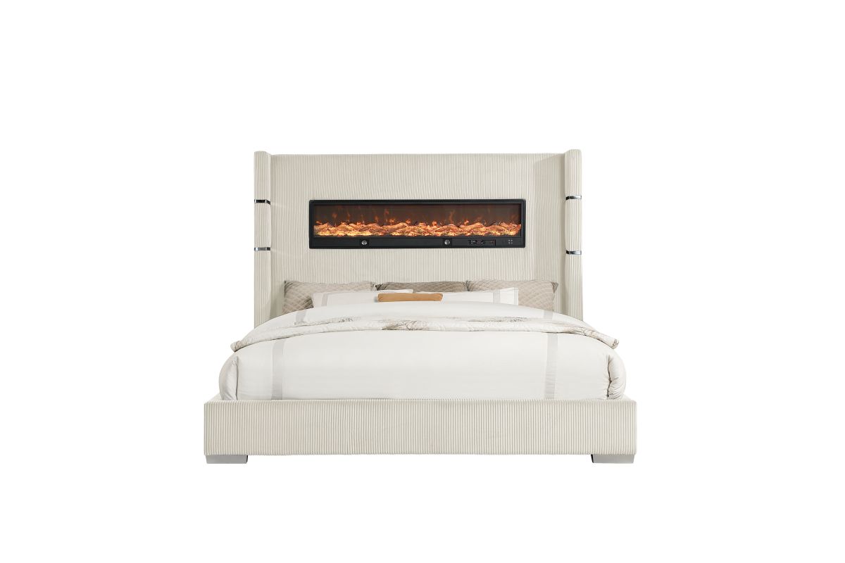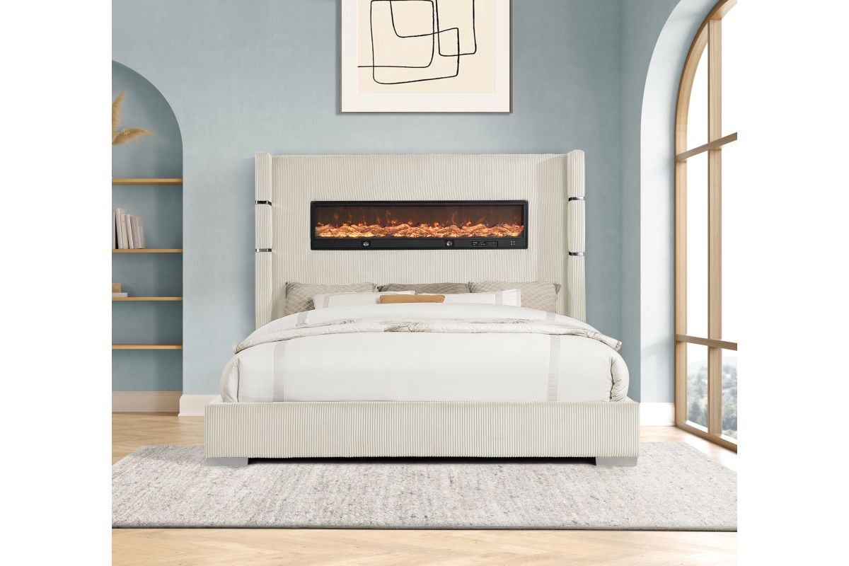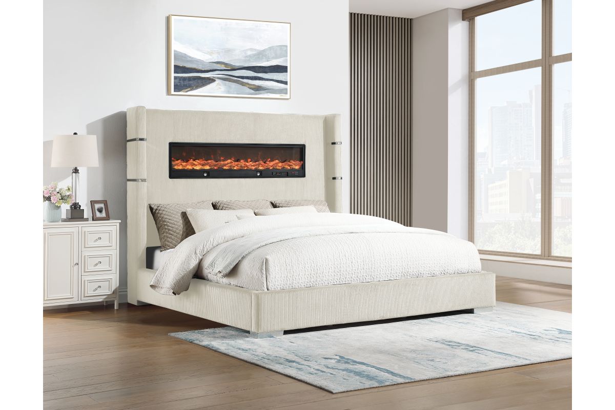 Unwind in pure luxury with this modern glam bed that brings warmth, ambiance, and elevated design into your bedroom. The tall, channel-tufted headboard makes a dramatic statement, while the built-in LED fireplace adds a cozy glow and contemporary edge. Wrapped in rich, textured fabric with chrome accent bands, this bed blends comfort and high style for the ultimate retreat. Whether you're curling up with a book or setting the tone for a relaxing evening, this bed transforms your space into a chic sanctuary.