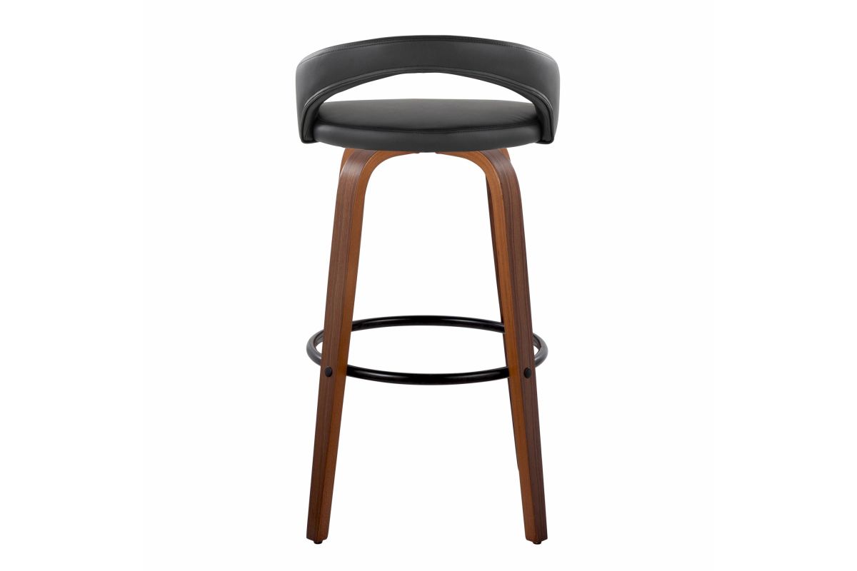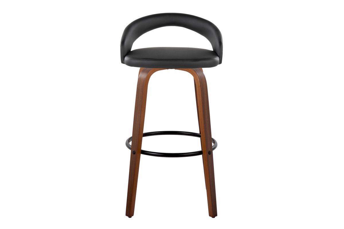 - Bent wood legs with round black metal footrest