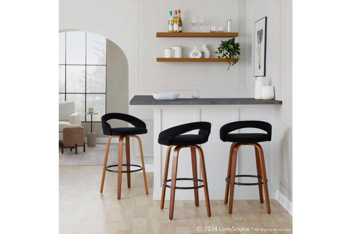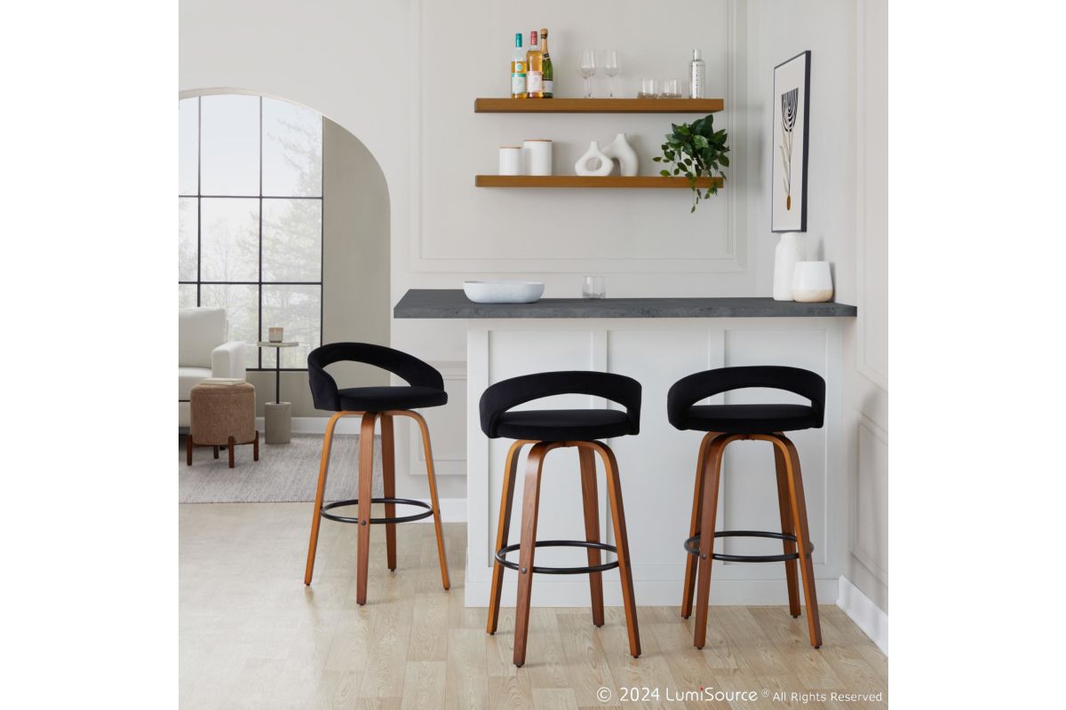 The Grotto Upholstered Fixed-Height Barstool by LumiSource brings a refined and versatile seating option to your kitchen. Featuring a fully upholstered seat and a low backrest, these stools offer both style and comfort. The clean-lined design of the frame complements the plush upholstery, allowing the Grotto stools to blend seamlessly into a variety of kitchen or bar decor styles.