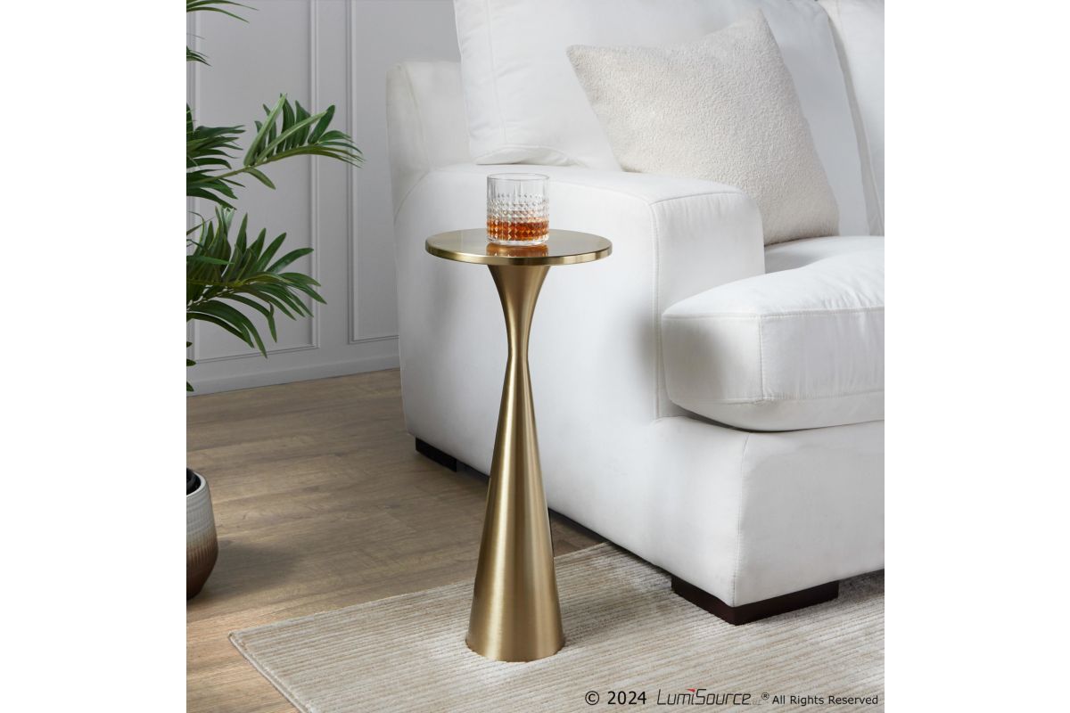 The Gemma Metal Side Table from Grandview Gallery by LumiSource will elevate any space with its sleek hourglass shape and dazzling metal finish. Available in gold, polished nickel, and black, this small, versatile table doubles as a chic cocktail table. Perfect for adding a touch of elegance to any room while holding your favorite drink or decor.