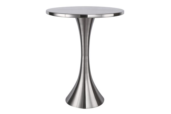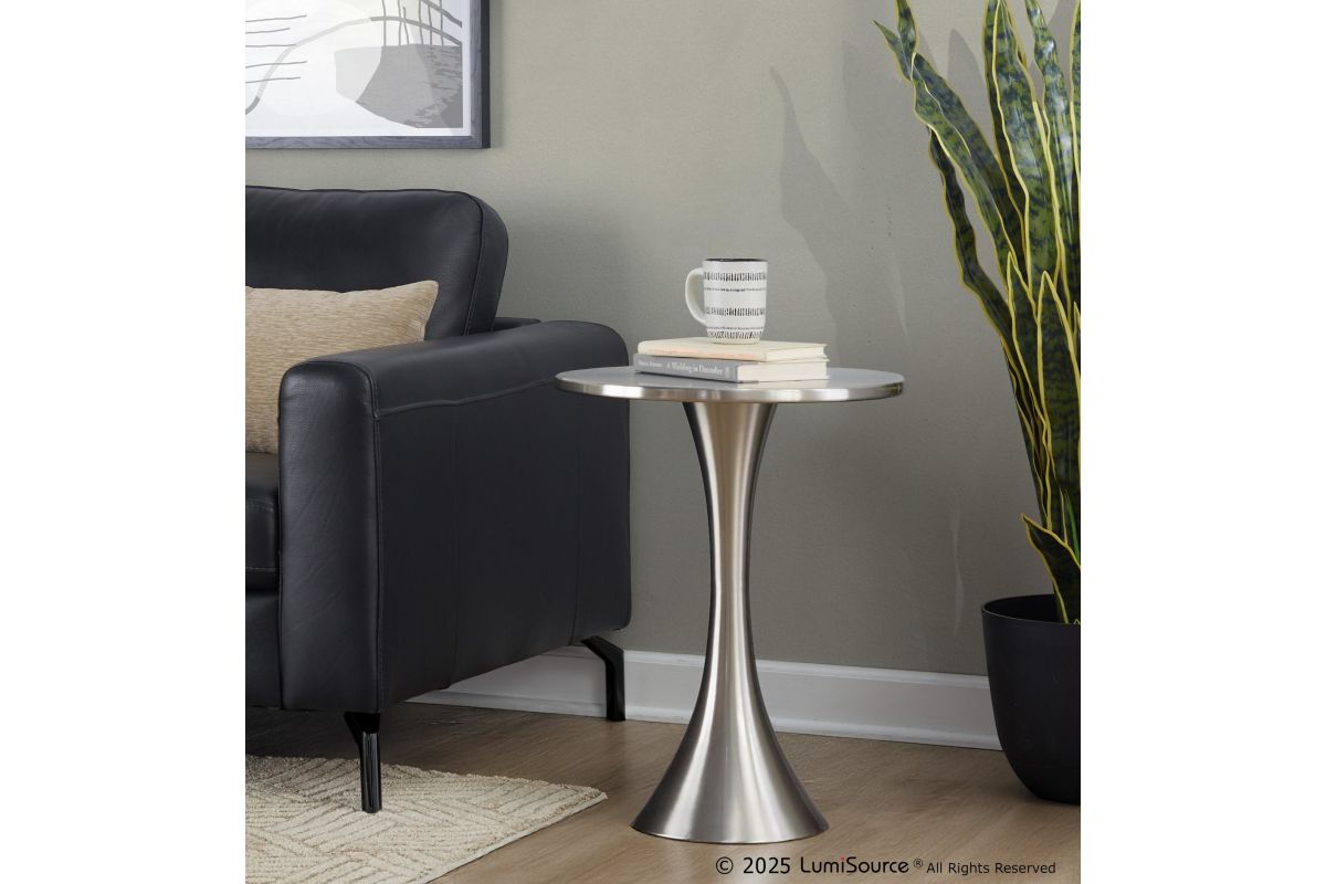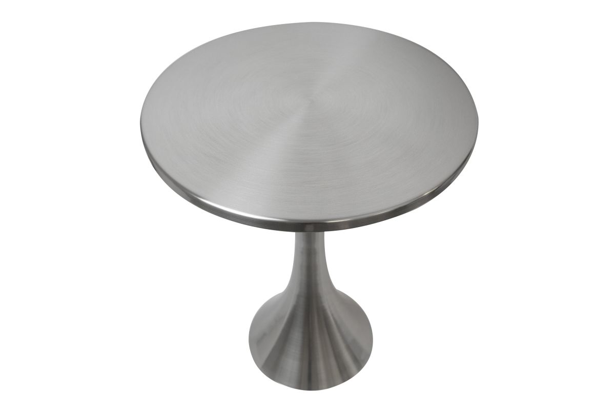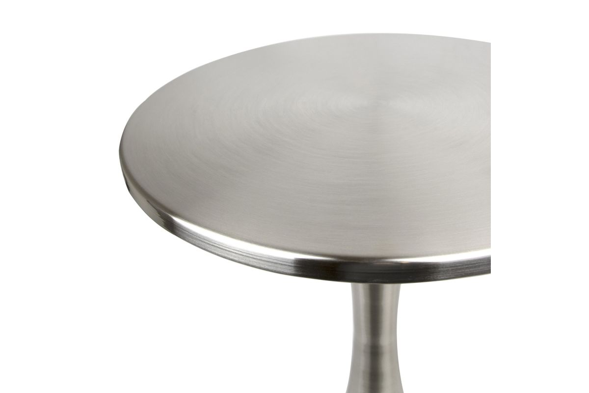 This seamless spun metal end table perfectly balances modern flair and minimalism with its clean lines and gracious curves, all in a brushed nickel finish. Each end table's bold round base curves into a lovely hourglass silhouette and is crowned by a matching circular tabletop. This is the ideal end table for those seeking modern design with the allure of seamless perfection.
