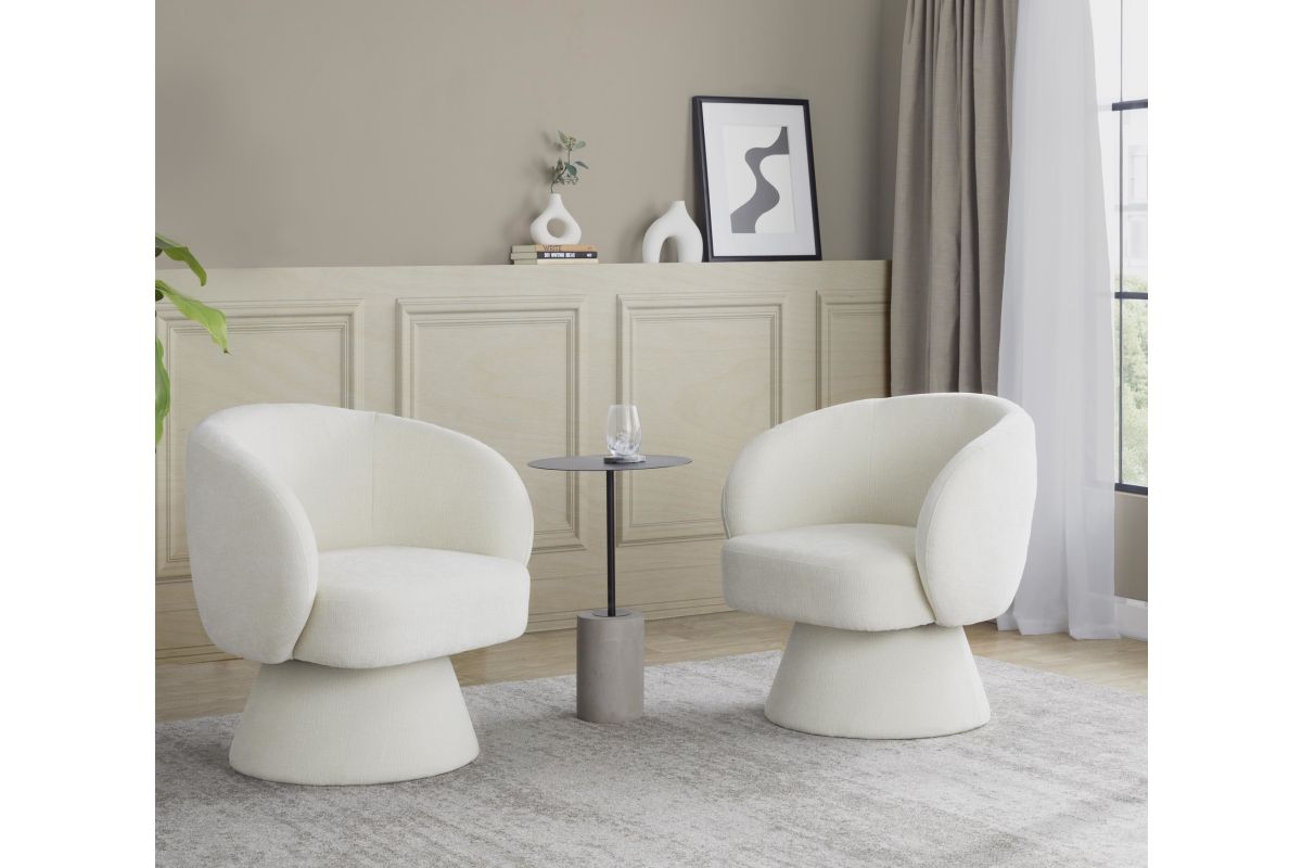 The contemporary charm of the Fran Swivel Accent Chair by LumiSource combines sturdy construction with aesthetic appeal. With smooth fabric material, its round and cozy shape will be the perfect addition for any room. Available in a variety of color combinations, the Fran Accent Chair can be used as a small accent chair or for extra seating.