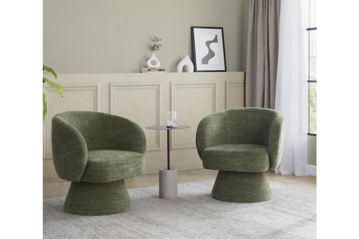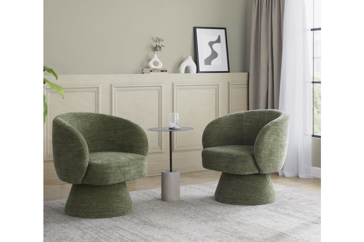 The contemporary charm of the Fran Swivel Accent Chair by LumiSource combines sturdy construction with aesthetic appeal. With smooth fabric material, its round and cozy shape will be the perfect addition for any room. Available in a variety of color combinations, the Fran Accent Chair can be used as a small accent chair or for extra seating.