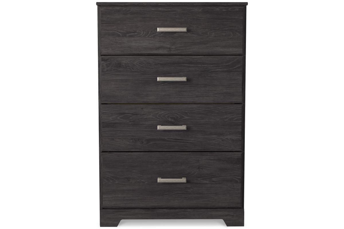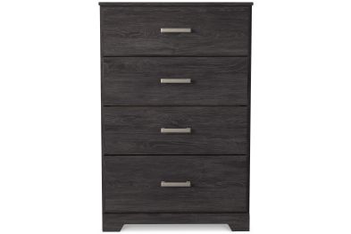 With its clean-lined look and modern attitude, this chest of drawers is a fresh style awakening. A warm charcoal hue over replicated oak grain easily complements other furniture finishes. Smooth drawer fronts with antiqued pewter-tone handles complete the aesthetic.