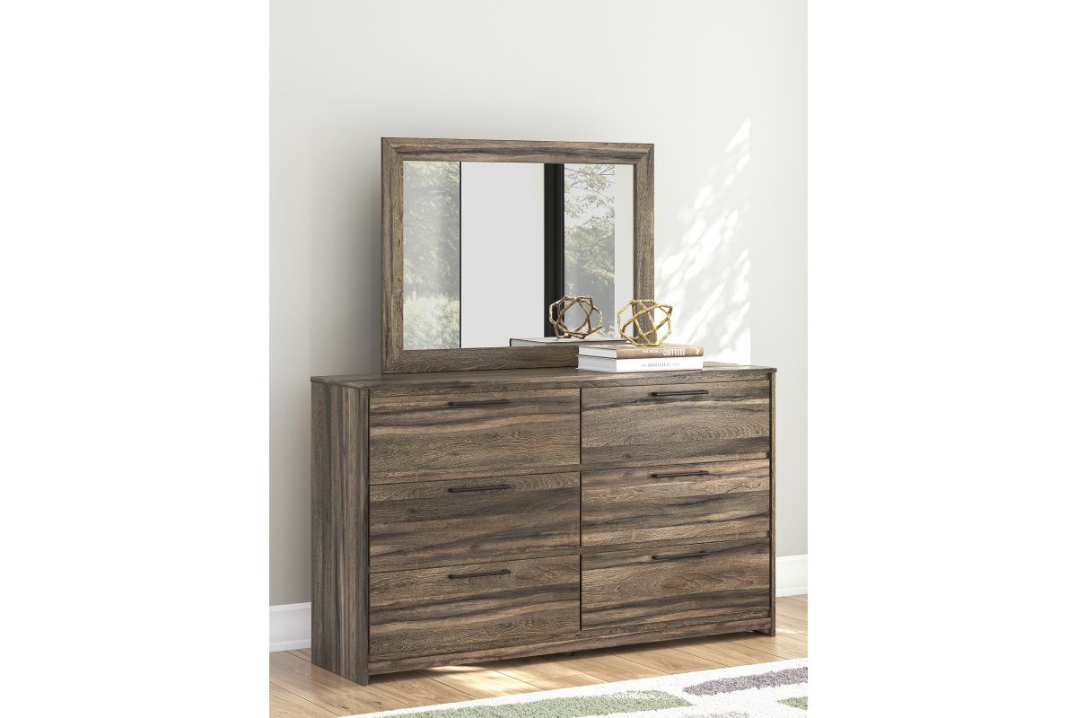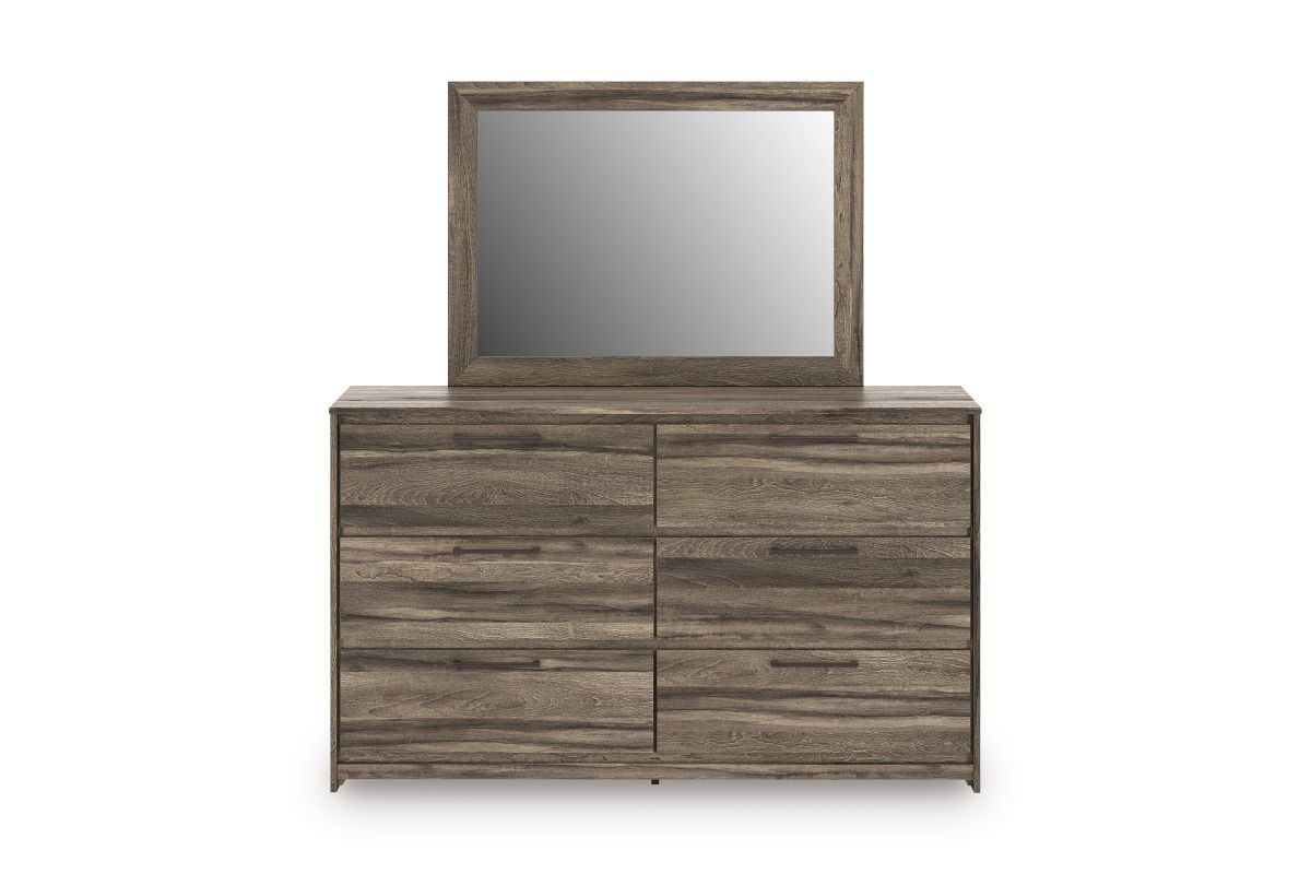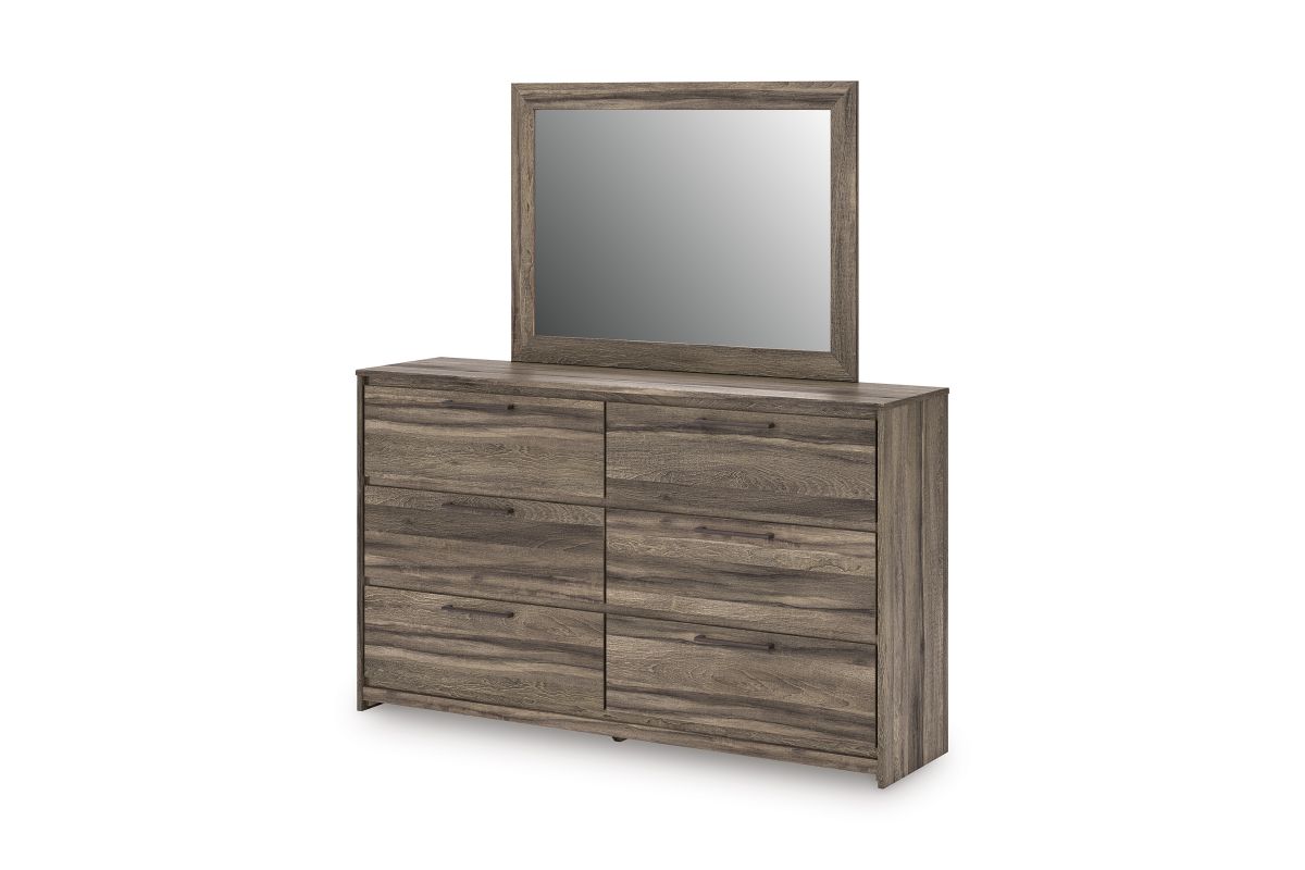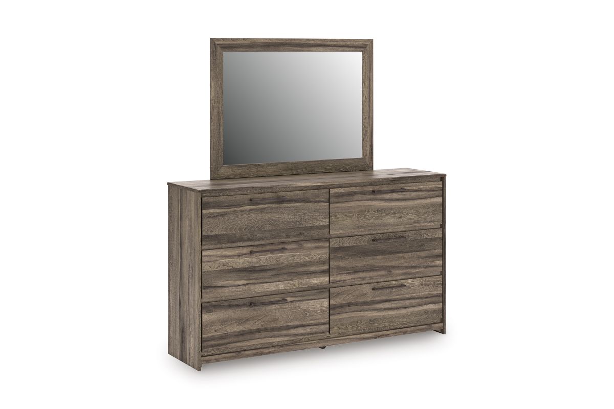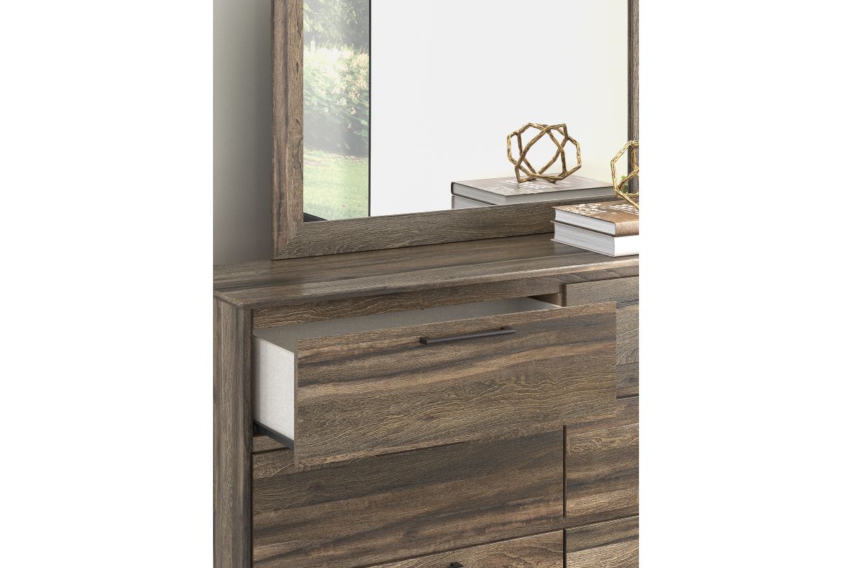 Casually cool style and lots of storage go hand in hand with this dresser and mirror. A weathered brown finish over replicated oak grain creates an easygoing vibe, setting the scene in your restful retreat. Clean lines and modern handles provide a fuss-free look. And the dresser's six roomy drawers give you plenty of space for stowing away clothes and more.