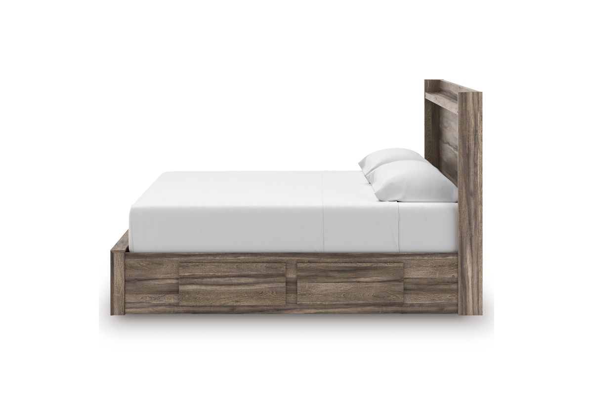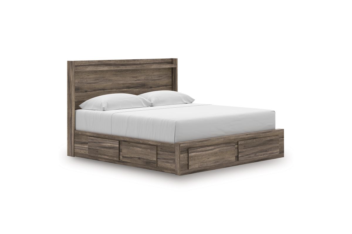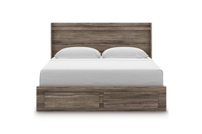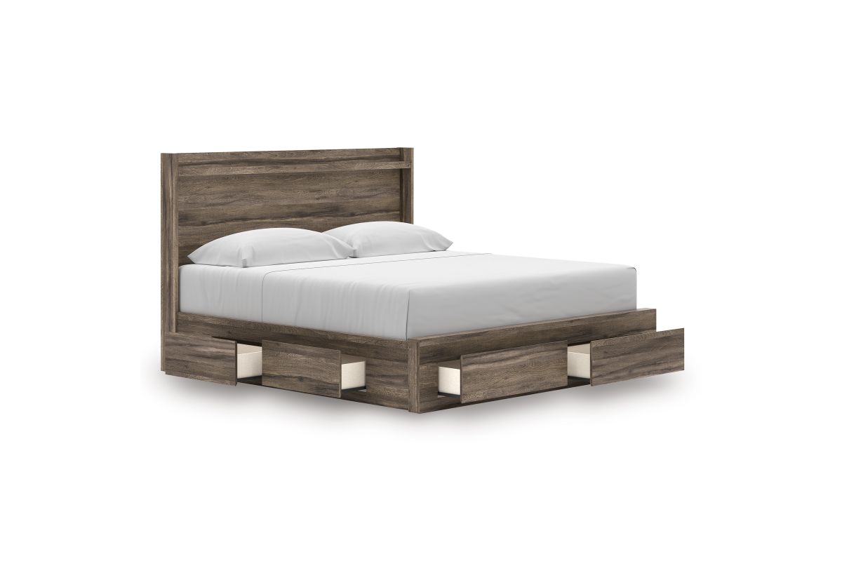 Rest in the casually cool style of this king panel storage bed. A weathered brown finish and chill LED lighting create an easygoing vibe, setting the scene in your restful retreat. Spacious drawers underneath provide plenty of storage. The bed's clean-lined design provides a fuss-free look.