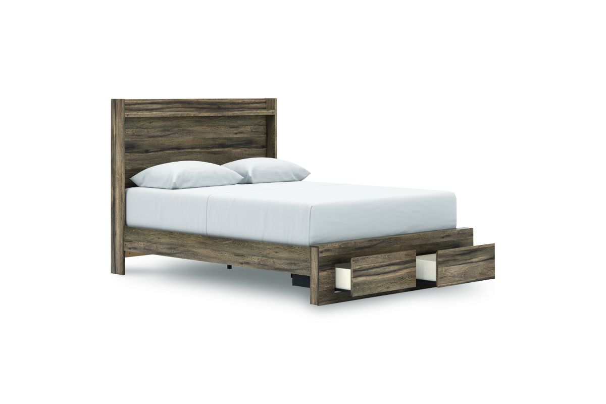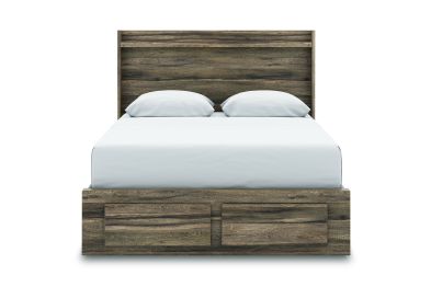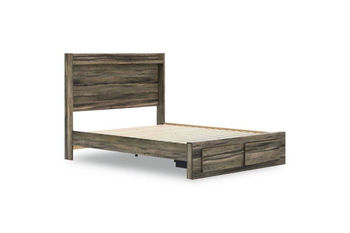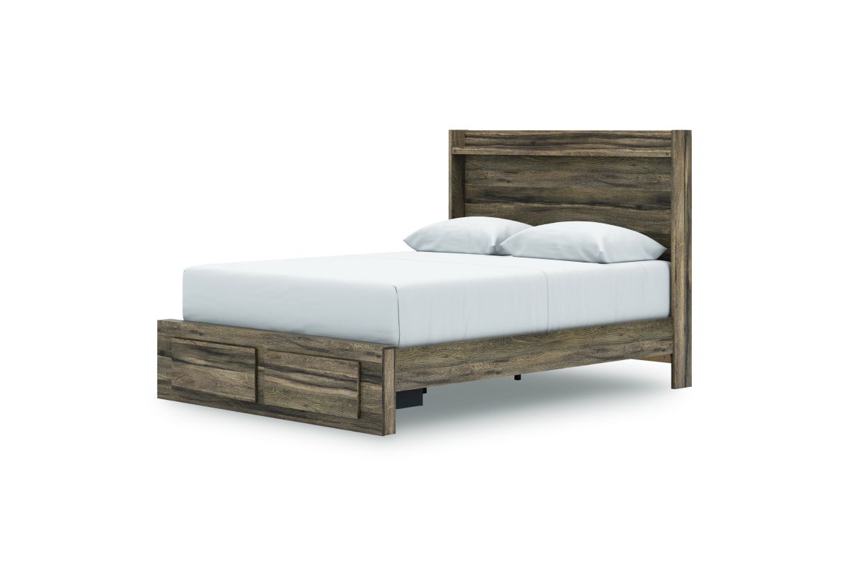 - Includes panel headboard, storage footboard, roll slats and platform rails