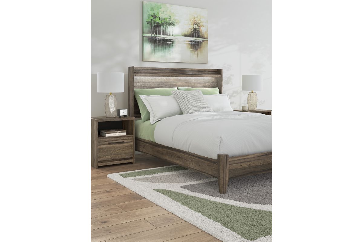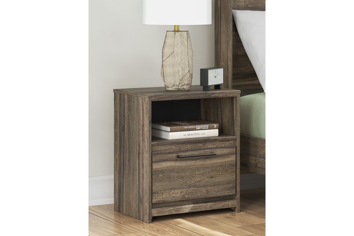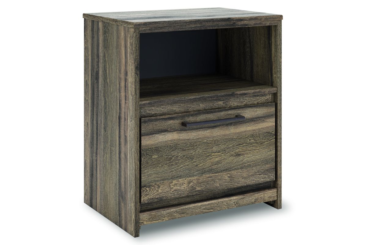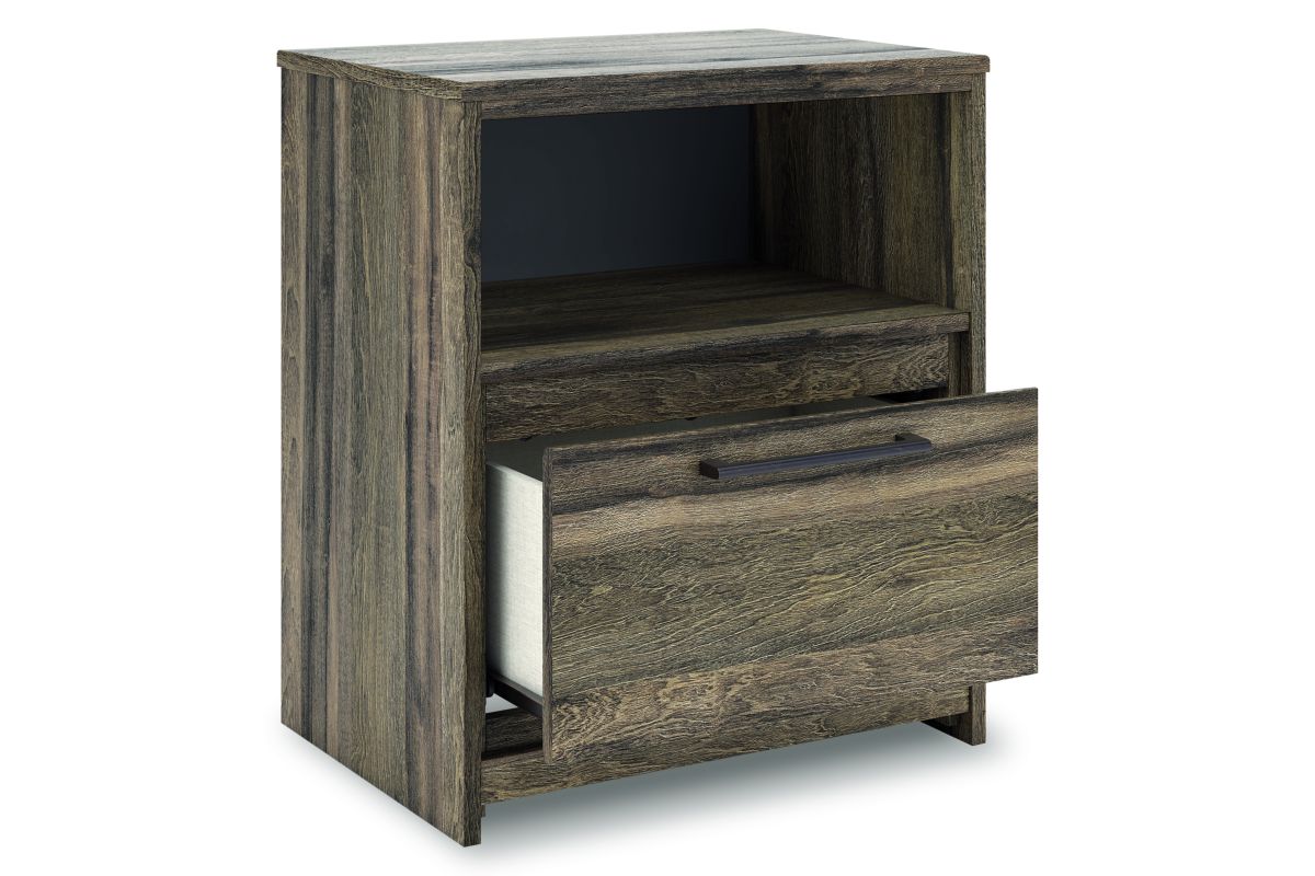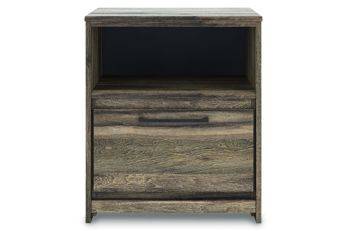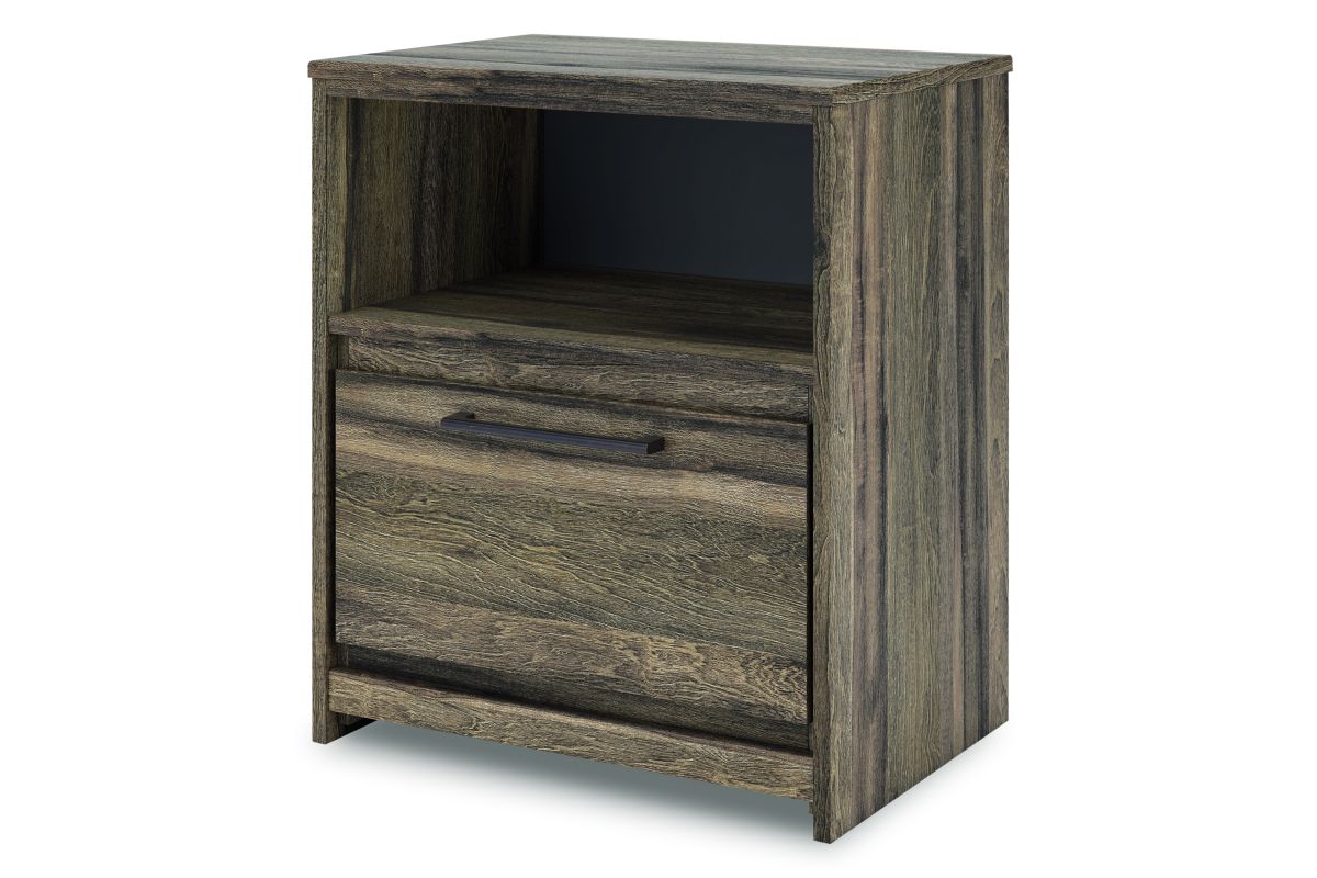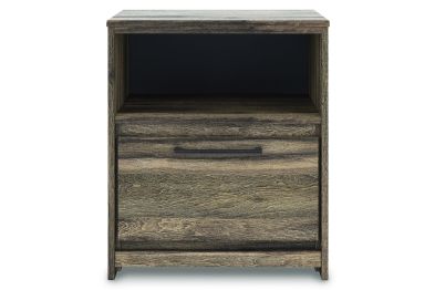 Casually cool style and lots of storage go hand in hand with this nightstand. A weathered brown finish over replicated oak grain creates an easygoing vibe, setting the scene in your restful retreat. The nightstand's clean lines and modern handles provide a fuss-free look. You’ll find its drawer and cubby to be spacious, and the USB charging keeps up with your high-tech lifestyle.