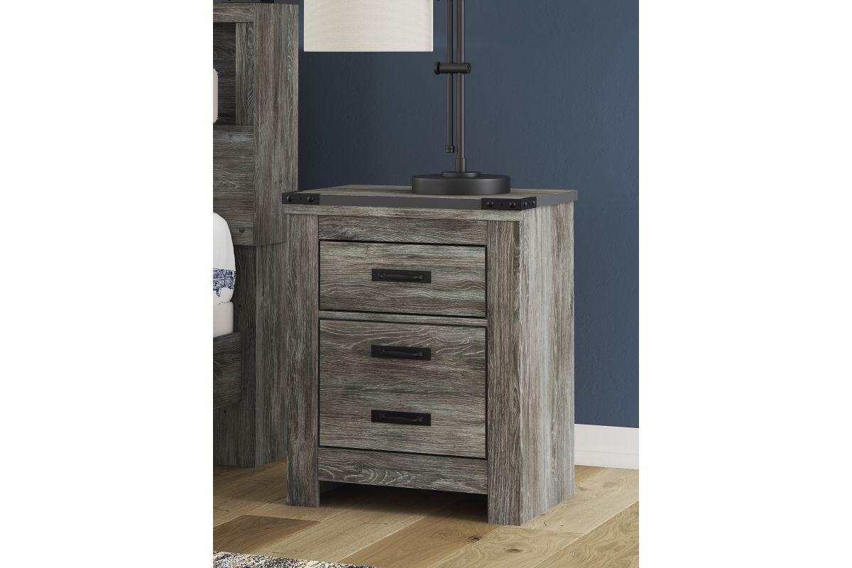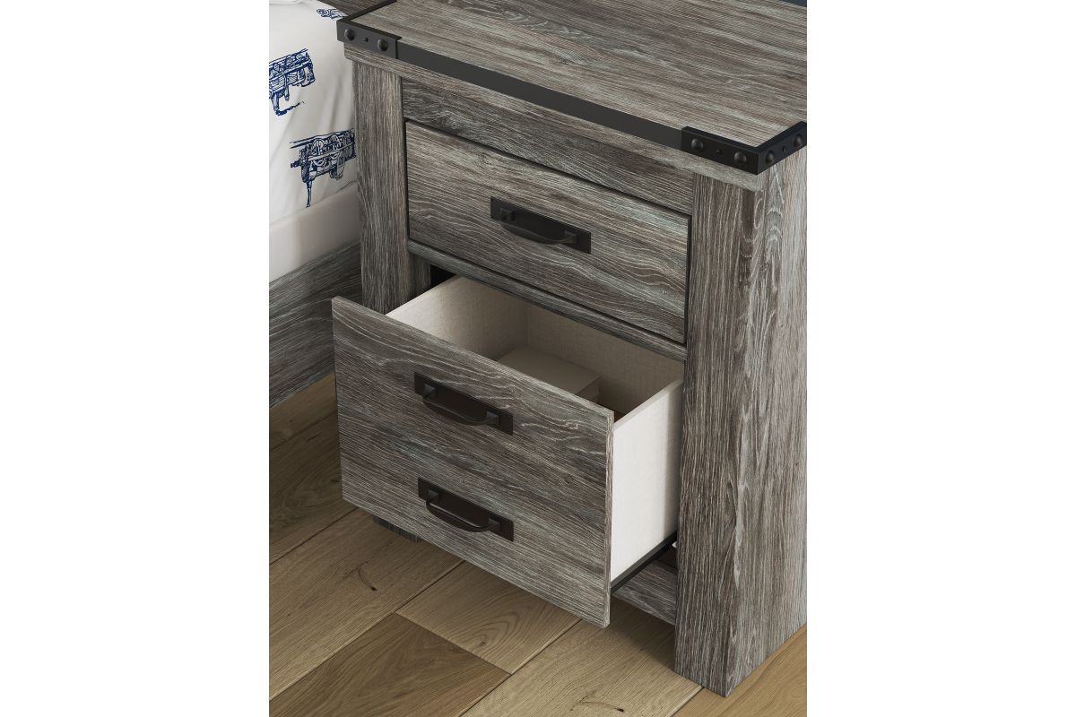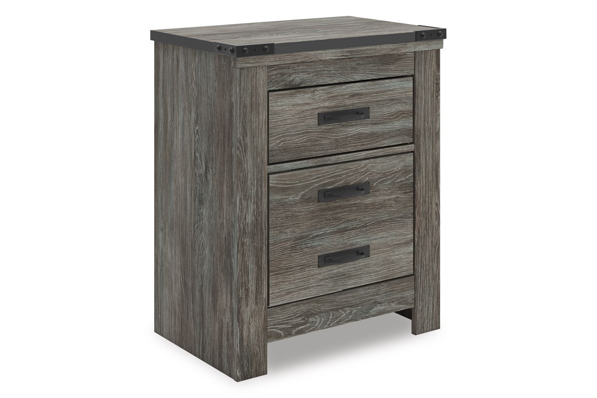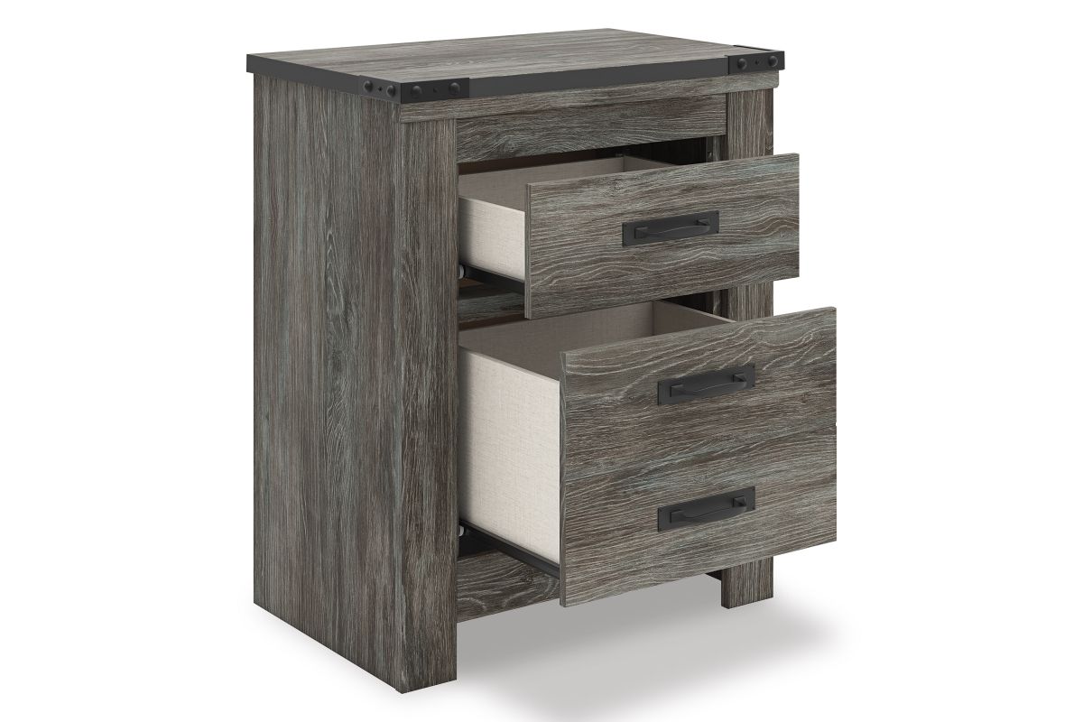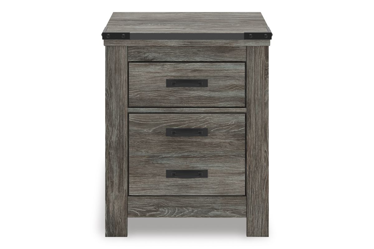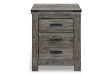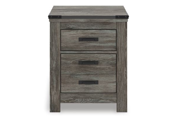 Cool, casual style is for all ages. With this nightstand, they get the function they need paired with the refined design you love. Approachably neutral in a rustic warm gray, it�s adaptable enough to pair with an assortment of existing colors and room decor. Faux metal detailing with nailhead accents lends an industrial edge. And a smooth-gliding drawer and open cubby offer storage for favorite books and other bedtime necessities. Techy toys running low on power? The handy included USB ports allow you to charge devices with ease.