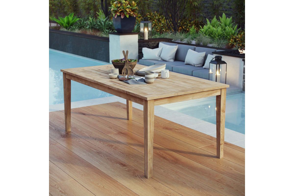 Harbor your greatest expectations with the luxurious Marina Teak Wood Outdoor Patio 72” Dining Table. Marina Patio Dining Table has a seating arrangement perfect for every member of your crew as you breathe the fresh, crisp air of a day spent with friends and family. Known for its natural ability to withstand extreme weather conditions, teak is the wood selection of choice for long-lasting outdoor patio furniture. Now you can enjoy Marina Teak Wood Outdoor Dining Table with its durable construction, alongside a modern design that persistently looks new and welcoming in your patio dining environs. Assembly required.