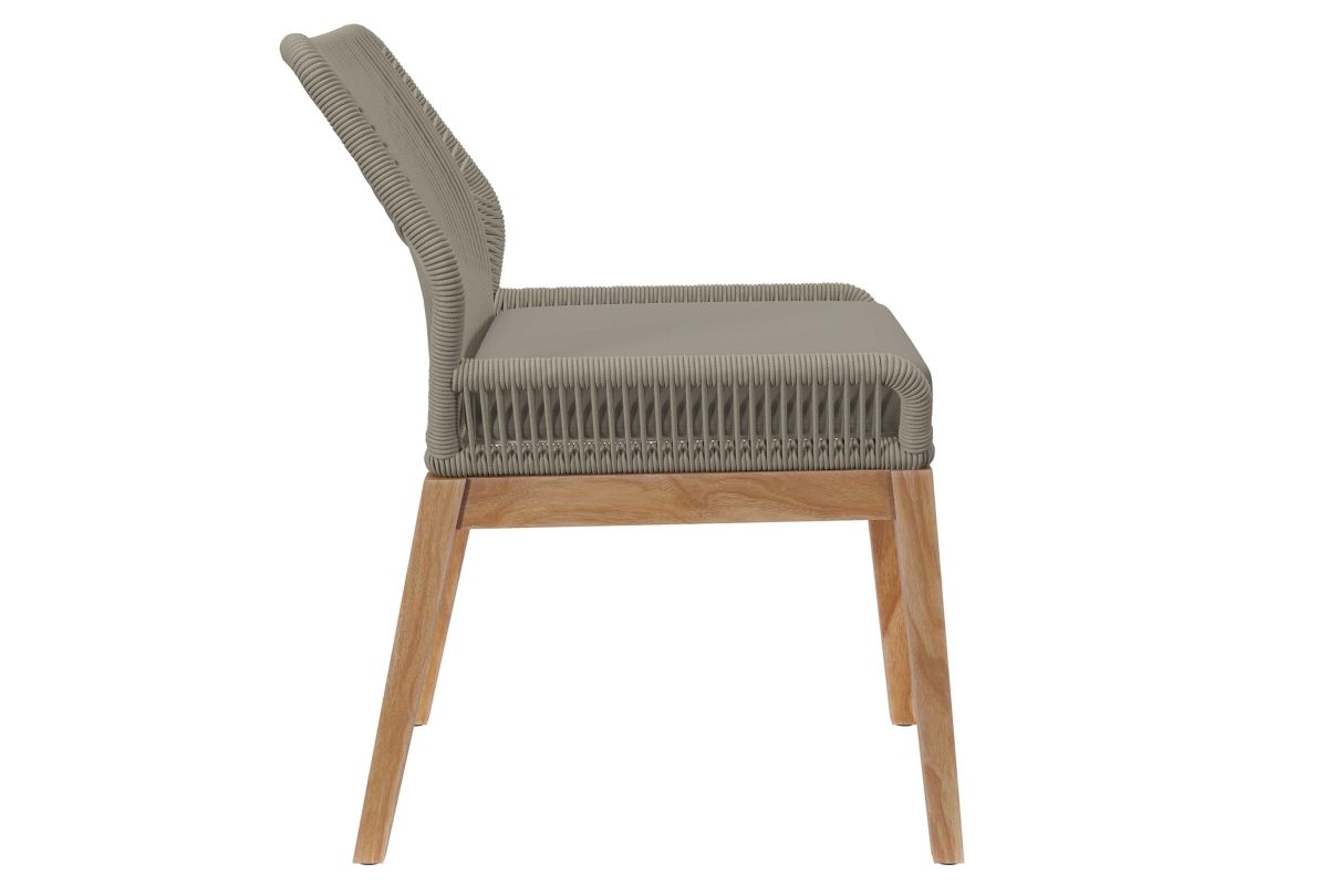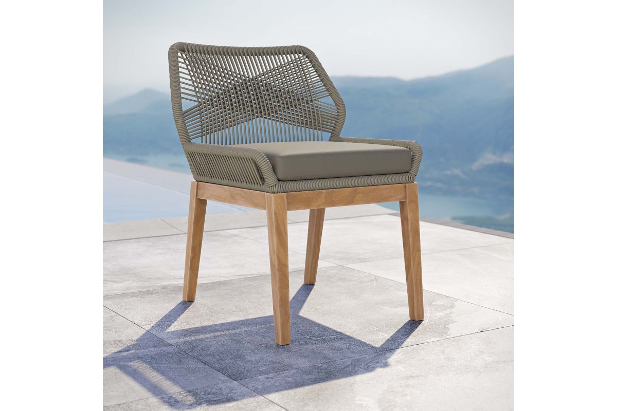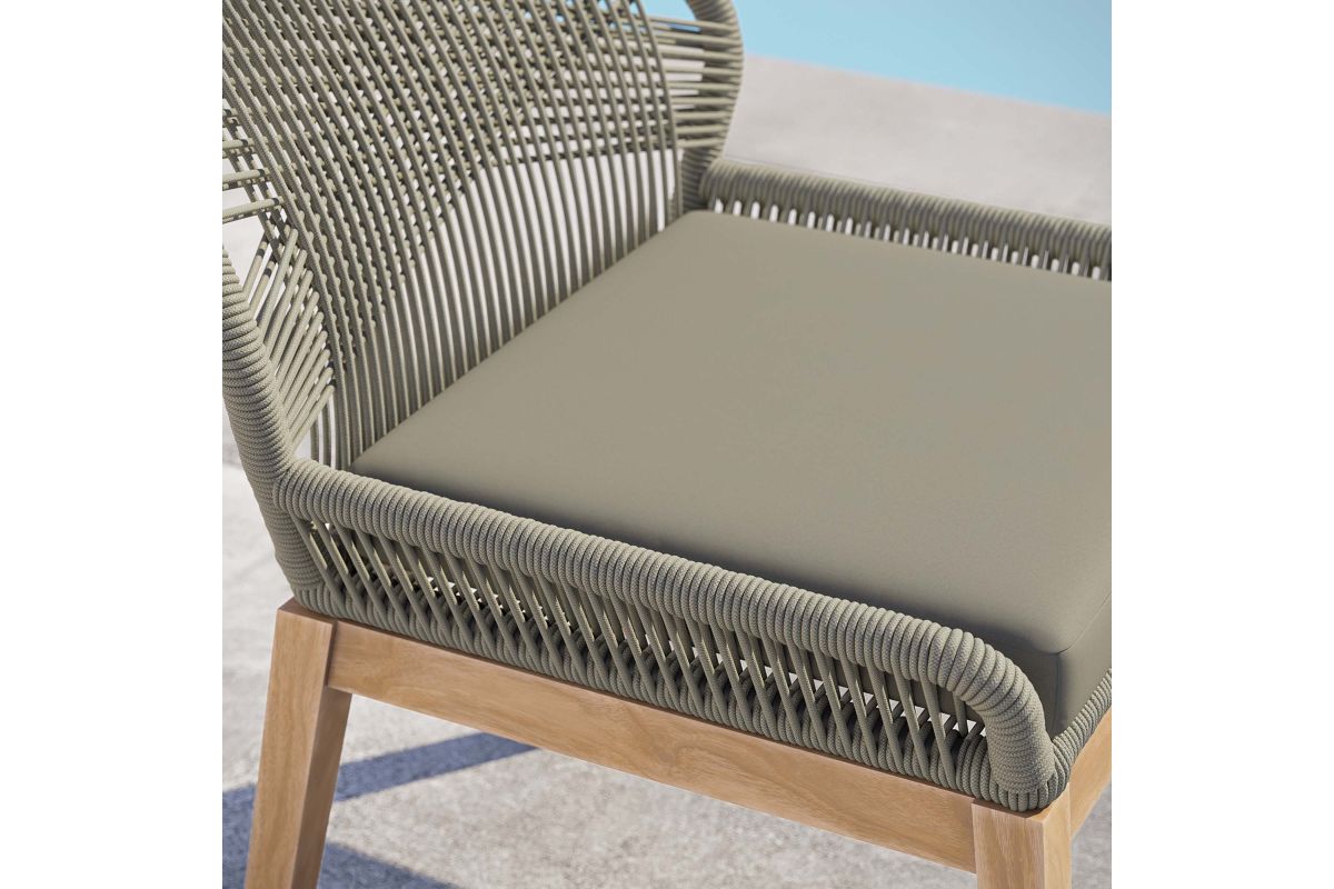 Relax amidst friends and family as you enjoy a meal al fresco with the Wellspring Outdoor Patio Dining Chair. Wellspring brings contemporary modern aesthetics to a backyard, porch, patio, or poolside with it's calming colors, organic wood grain, woven rope detail on the aluminum seat frame, and a crisscross pattern along the backrest. Featuring a premium solid teak wood base with stretchers and non-marking foot pins to protect flooring, this patio chair stool boasts a removable cushion with dense foam padding and ties to ensure a secure seat. It's versatile design makes it a stylish addition indoors too. Assembly required. Weight Capacity: 220 lbs.