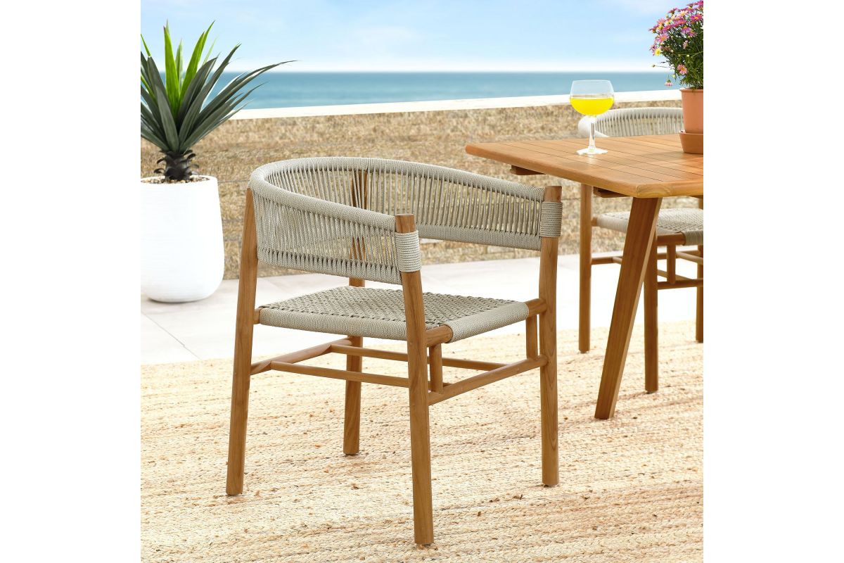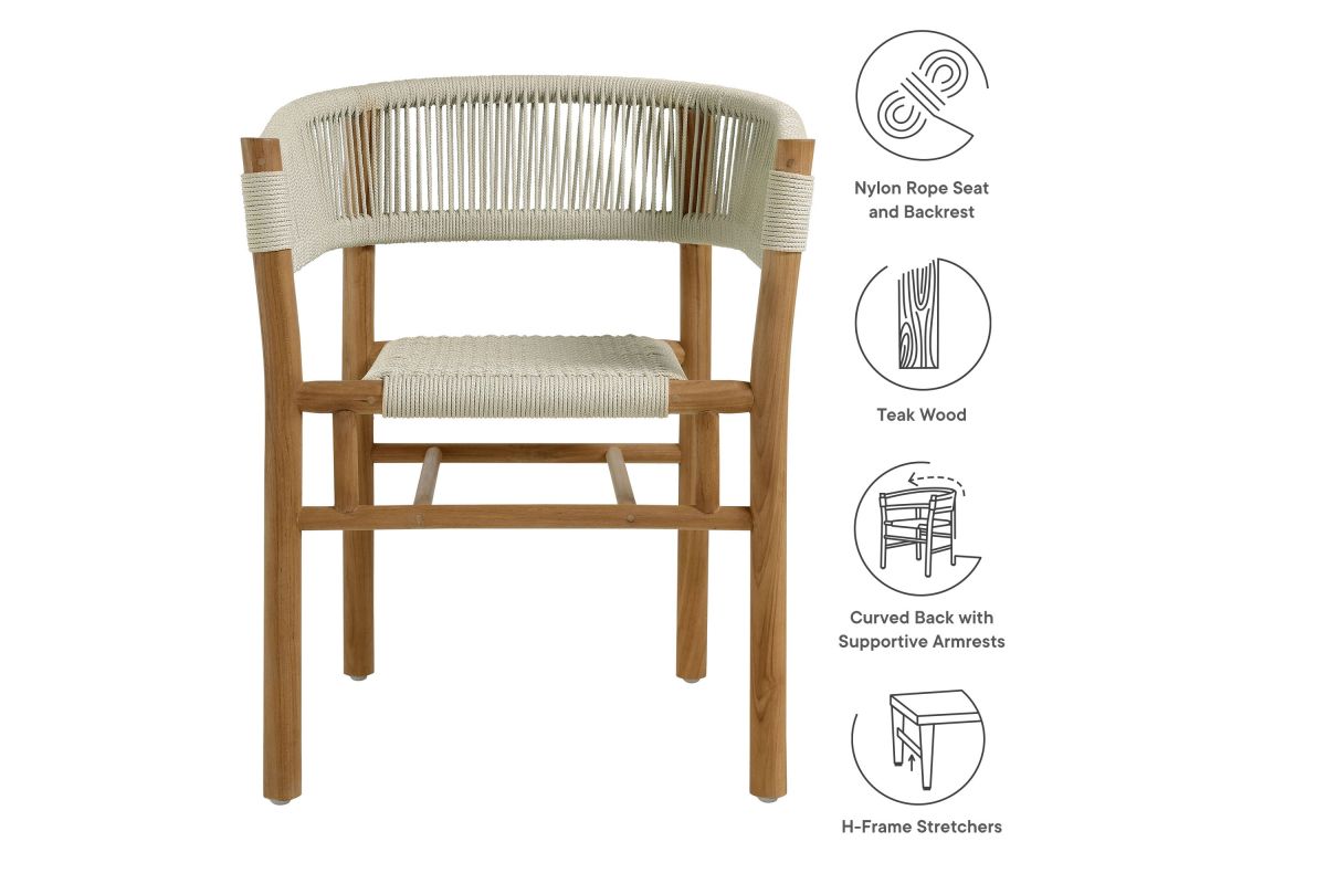 Refresh your outdoor dining experience with the Vienna Outdoor Dining Curved Armchair Set, an al fresco addition that invites relaxation and conversation. This pair of 2 dining patio chairs features a beautiful teak wood frame, naturally resistant to weather, paired with seats intricately woven with high-quality nylon rope, creating a contemporary and cohesive look ideal for any patio or garden setting. The inclusion of armrests in these outdoor rope dining chairs turns any dining experience into a more relaxed, enjoyable occasion. Add to that its H-frame stretchers and rounded backrest, and these rope chairs provide the comfort needed for extended dinner conversations. Whether paired with the complete Vienna Outdoor Teak Wood Dining Set or mixed with other outdoor patio furniture, these woven rope outdoor chairs blend effortlessly, complementing a diverse range of outdoor patios. No Assembly Required. Weight Capacity: 200 lbs.