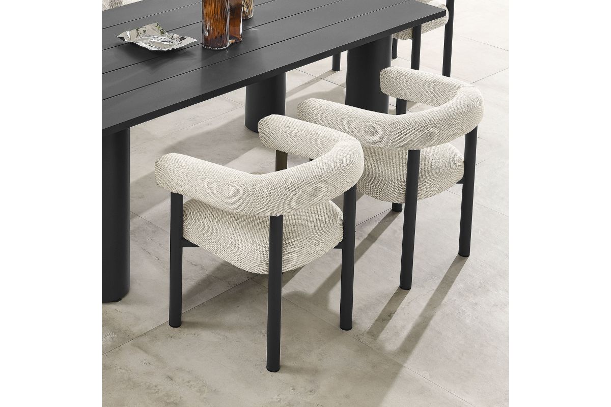 Elevate your outdoor space with the Nautica Modern Contemporary Patio Dining Armchairs Set of 2. Crafted from powder-coated metal, these aluminum outdoor dining chairs combine durability with sleek design. The curved back and sleek tubular frame offer a perfect blend of comfort and style, making them standout patio chairs in any setting. Designed for all weather conditions, these outdoor dining chairs feature quick-drying dense foam padding and water-resistant fabric upholstery. Non-marking plastic foot glides protect your flooring, making these aluminum outdoor chairs ideal for any surface. Whether you need seating for your outdoor dining table, balcony, or stylish patio setup, the Nautica Fabric Upholstered Metal Armchairs Set of 2 is your go-to choice for exceptional outdoor seating. Enhance your patio, porch, or garden with this versatile aluminum patio furniture collection, and enjoy comfort and style all year round. No assembly required. Weight Capacity of each aluminum patio chair : 300 lbs.