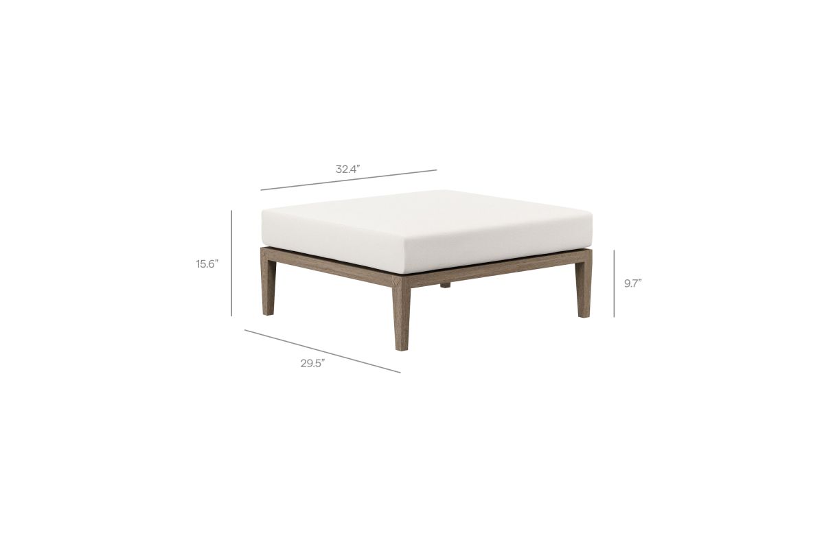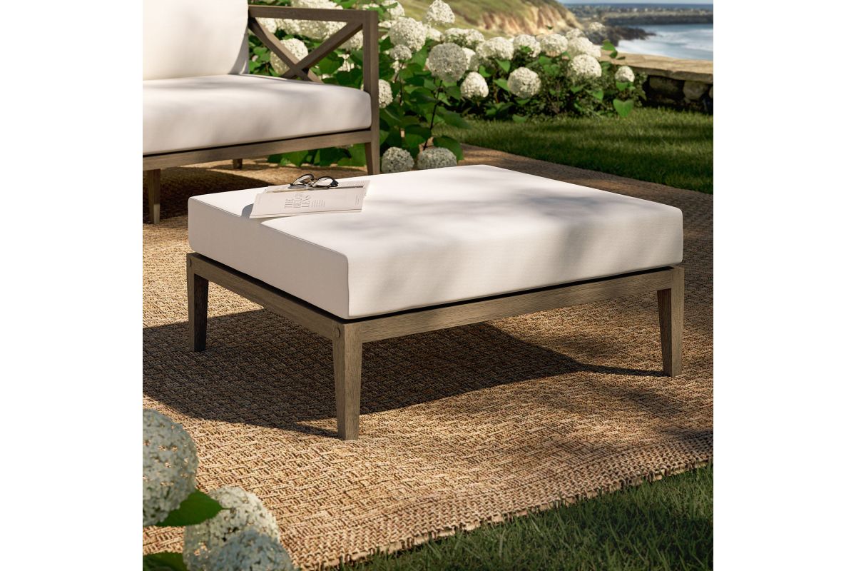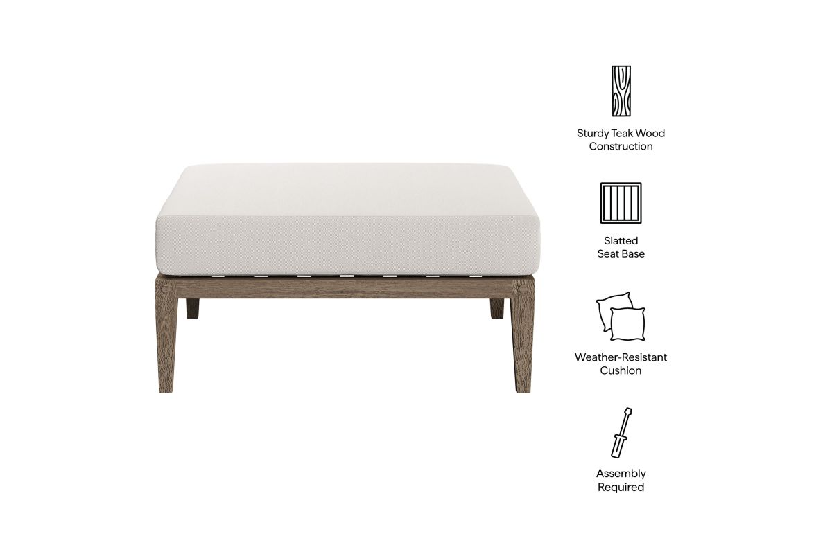 Soak in nature’s beauty with the Northlake Outdoor Ottoman, a stylish and functional addition to any outdoor space. Crafted from sturdy teak wood, this large square outdoor ottoman features a distinctive refined aesthetic. The slatted seat base ensures durability and airflow, while the plush, all-weather cushion offers water-resistant, fade-resistant, and quick-drying performance for year-round comfort. Perfect as a teak wood ottoman footstool, extra patio seating, or a convenient surface for relaxing outdoors, the Northlake Patio Ottoman seamlessly blends timeless craftsmanship with modern outdoor luxury. Includes non-marking floor glides for added protection. Assembly required. Weight Capacity: 300 lbs.