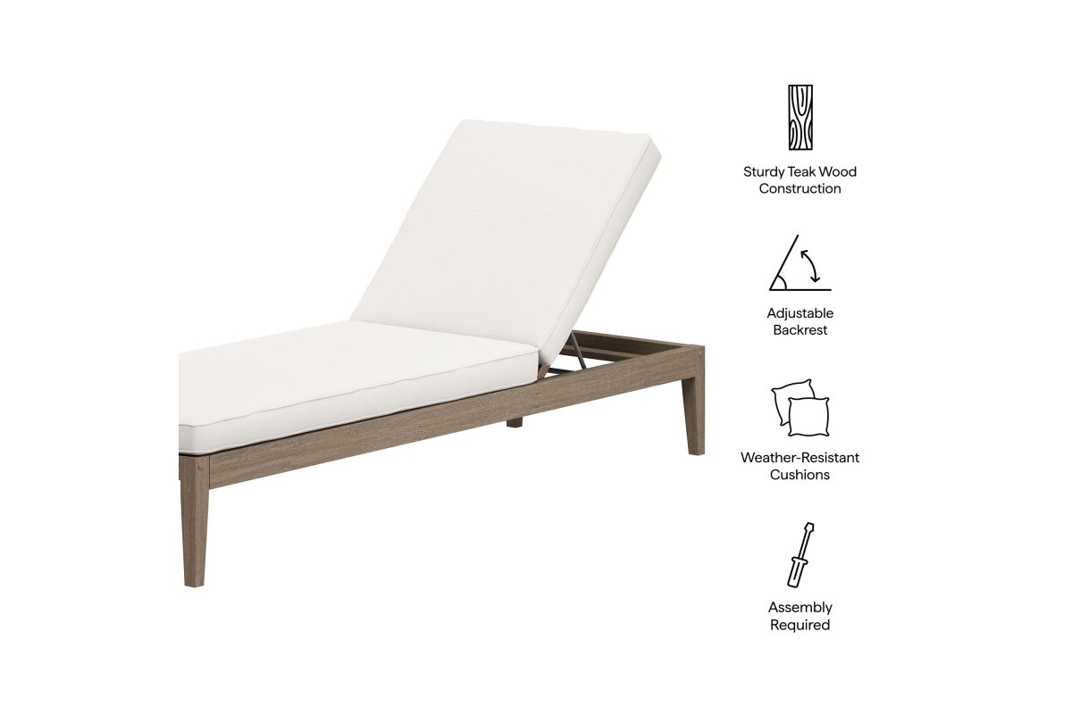 Soak in nature’s beauty as you recline with the Northlake Outdoor Chaise Lounge. Crafted from durable teak wood, this sleek poolside lounger features a slatted seat for breathability and a backrest accented by a distinctive cross-back frame for added support. Designed for ultimate relaxation, the adjustable backrest offers three reclining positions, allowing you to sit upright, lounge back, or lay flat. The plush, weather-resistant cushion provides water-resistant, fade-resistant, and quick-drying comfort for year-round outdoor use. Whether by the pool, on the patio, or anywhere under the sun, the Northlake Chaise Lounge blends timeless craftsmanship with modern convenience. Assembly required. Weight Capacity: 278 lbs.