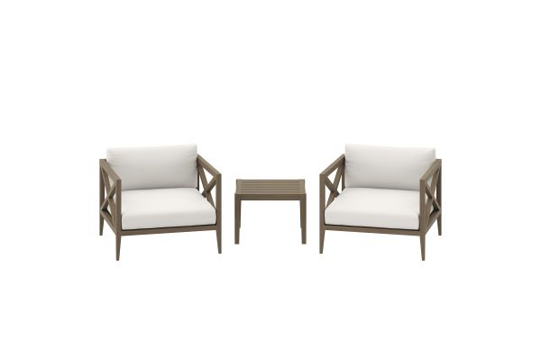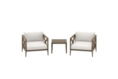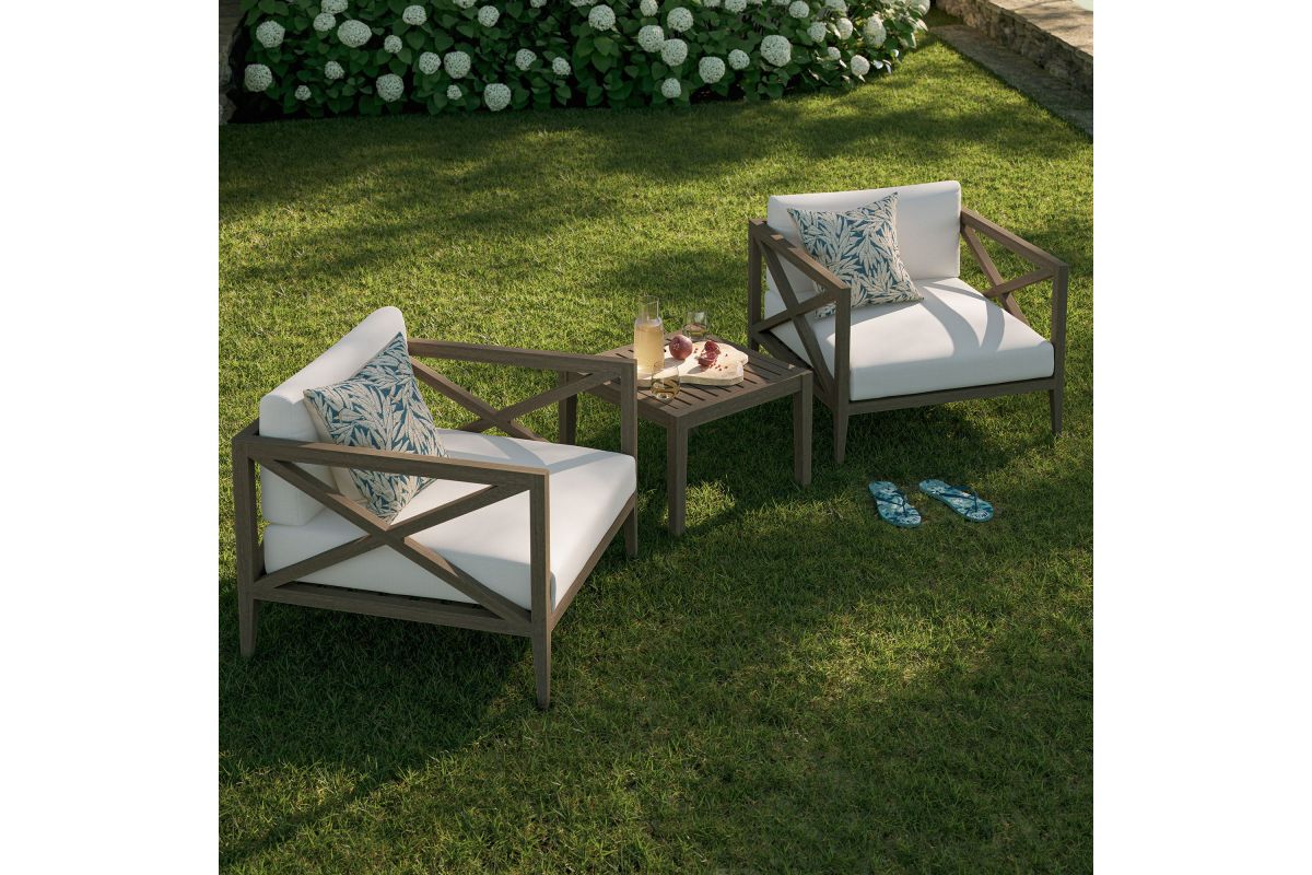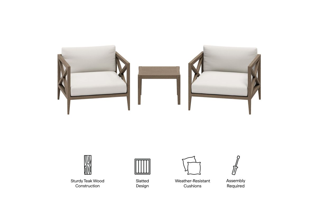 Soak in nature’s beauty with the Northlake 3-Piece Outdoor Furniture Set, featuring stylish lounge armchairs and matching side table. These pieces are crafted from durable teak wood, making them ideal for outdoor use. The wide armchairs showcase a distinctive cross-back frame for added support and a refined aesthetic. A slatted seat base encourages airflow and lasting comfort, while plush, all-weather cushions are water-resistant, fade-resistant, and quick-drying for use through every season. The coordinating square side table is designed with a smooth, slatted top for quick drainage, providing a convenient surface for drinks, decor, or outdoor essentials. Perfect for patios, porches, balconies, and garden lounges, this set blends timeless craftsmanship with modern outdoor luxury. Includes non-marking floor glides for added protection. Assembly required.