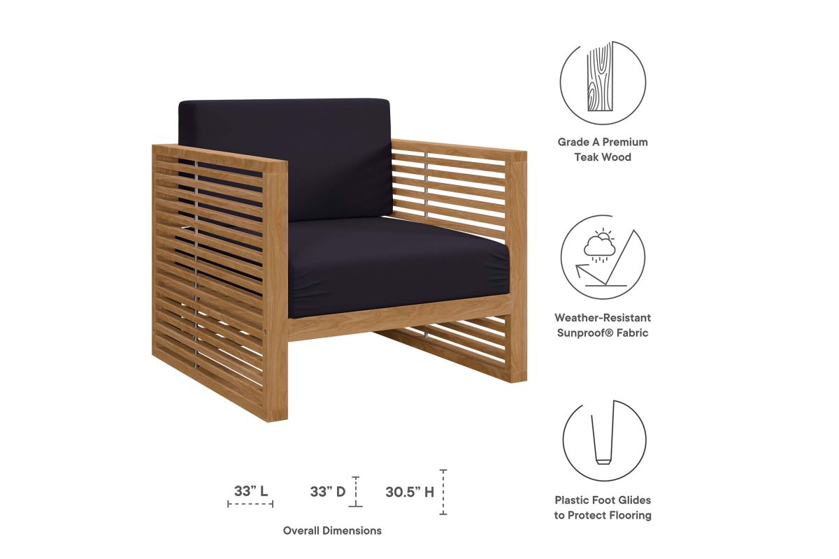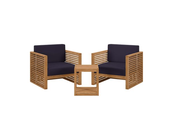 Enjoy warm weather and spirited conversation with the Carlsbad Teak Wood Outdoor Patio Furniture Set. A bold statement on the porch, in your backyard, or poolside, this patio set abounds in contemporary style with a slatted, clean-lined design. Ideal for al fresco entertaining or relaxing by the pool, the Carlsbad Outdoor Patio Furniture Collection is crafted with durable Premium Grade A teak wood and complete with comfortable cushions covered in machine washable sun, stain, water, and fade resistant Sunproof® fabric covers. Includes non-marking plastic foot glides. Patio Set Includes: 2 Armchairs, 1 Side Table