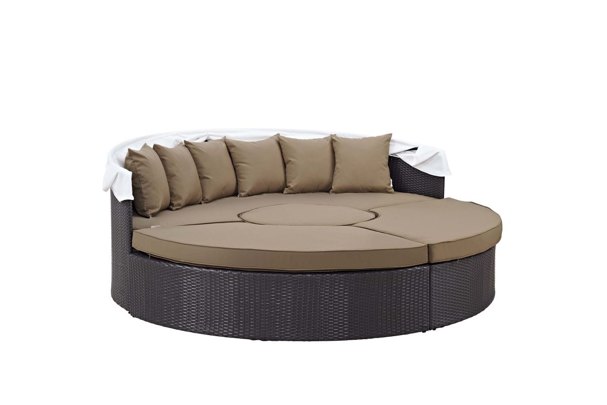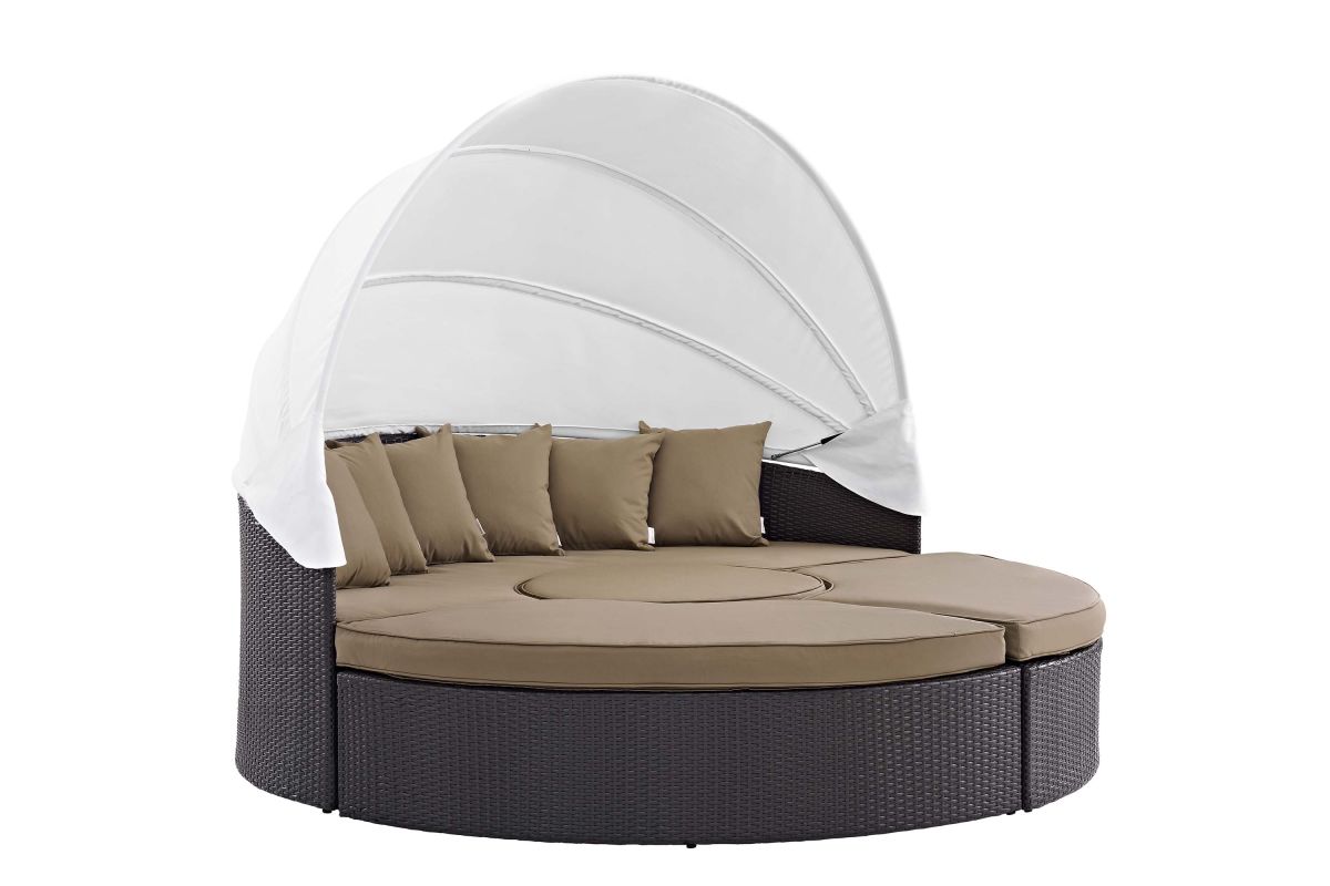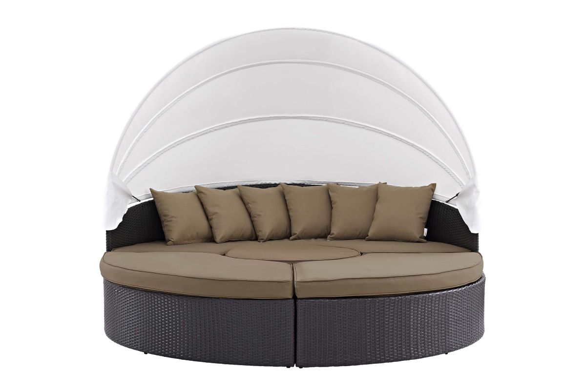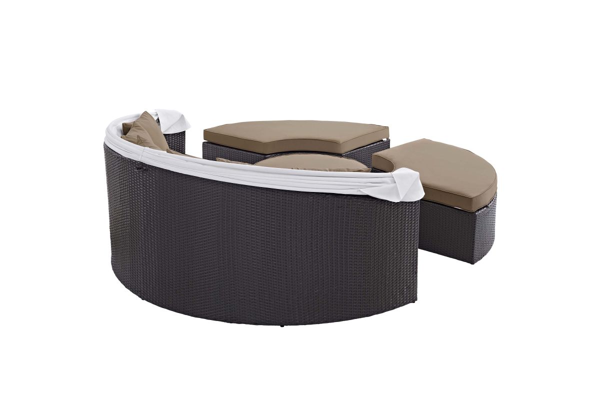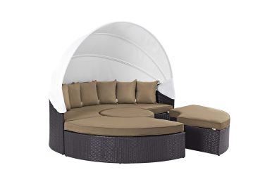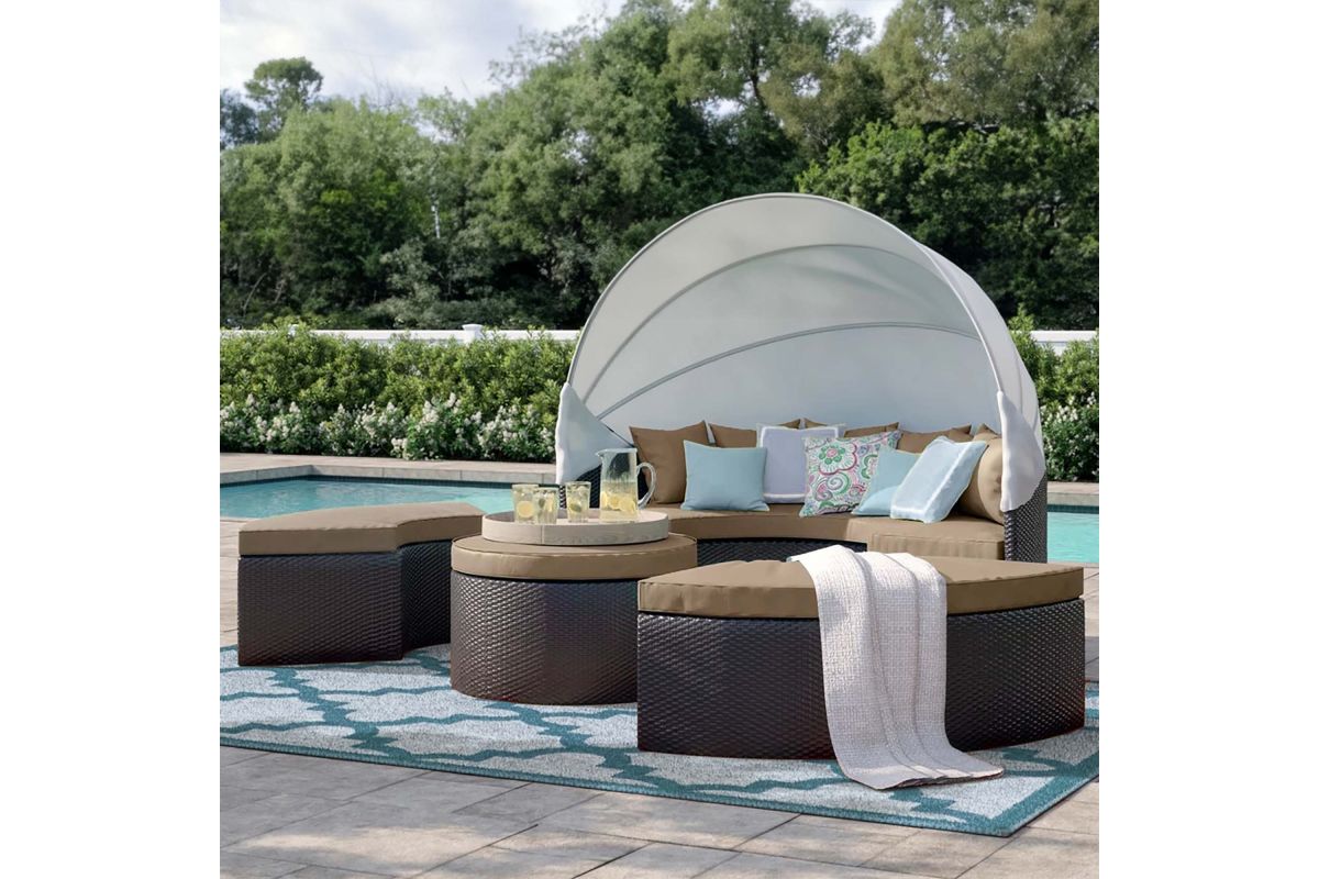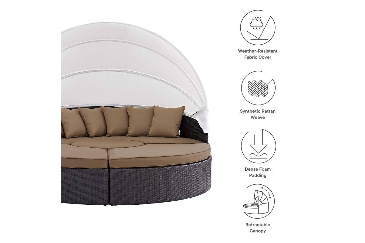 Gather stages of sensitivity with the Convene Outdoor Sectional series. Made with a synthetic rattan weave and a powder-coated aluminum frame, Convene Patio Daybed is a versatile outdoor collection that shifts and combines according to the spontaneous needs of the moment. Outfitted with all-weather fabric cushions, leave a positive impression on friends and family while enhancing your patio, backyard, or poolside repast in this series of palpable distinction. This installment of the series is an Outdoor Patio Daybed with Canopy.