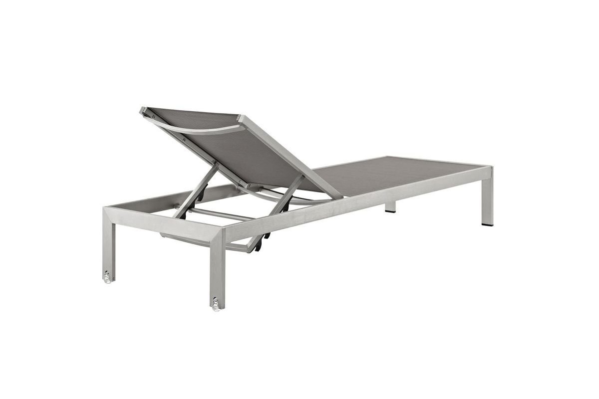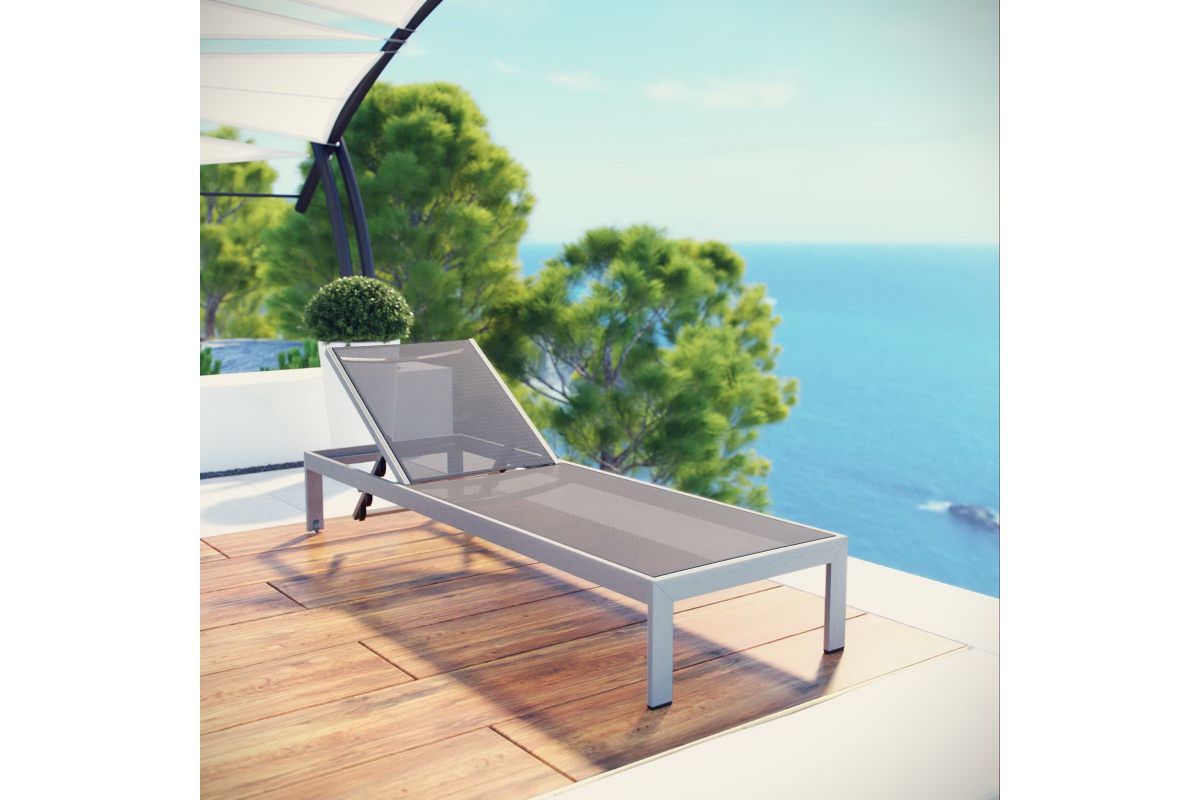 Maintain clean lines with the Shore Outdoor Patio Sun Lounger in Mesh. Strong and durable, relax in the Shore Outdoor Chaise Lounge as you choose from four available recline positions or sunbathe while lying flush. Made with an anodized brushed aluminum frame and tone-on-tone grays, Shore Patio Lounge Chair is a breeze to assemble, comes with clear wheels for easy mobility on the top end, and non-marking black plastic foot caps under the bottom two support legs. Chic and minimalist, the Shore Outdoor Sun Lounger in Mesh is a piece built to last with the comfort and versatility you've been looking for in an outdoor lounger.