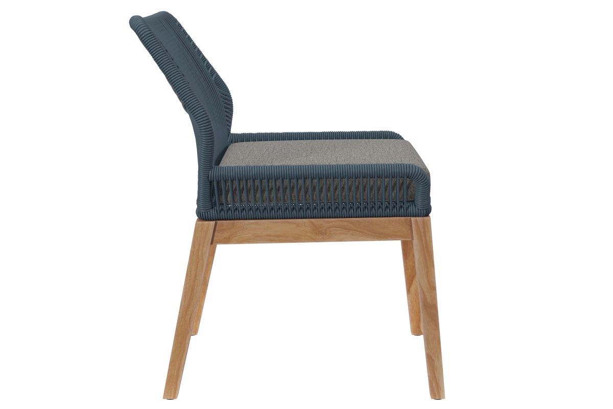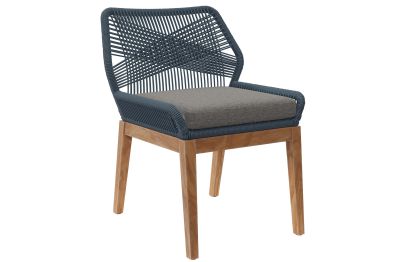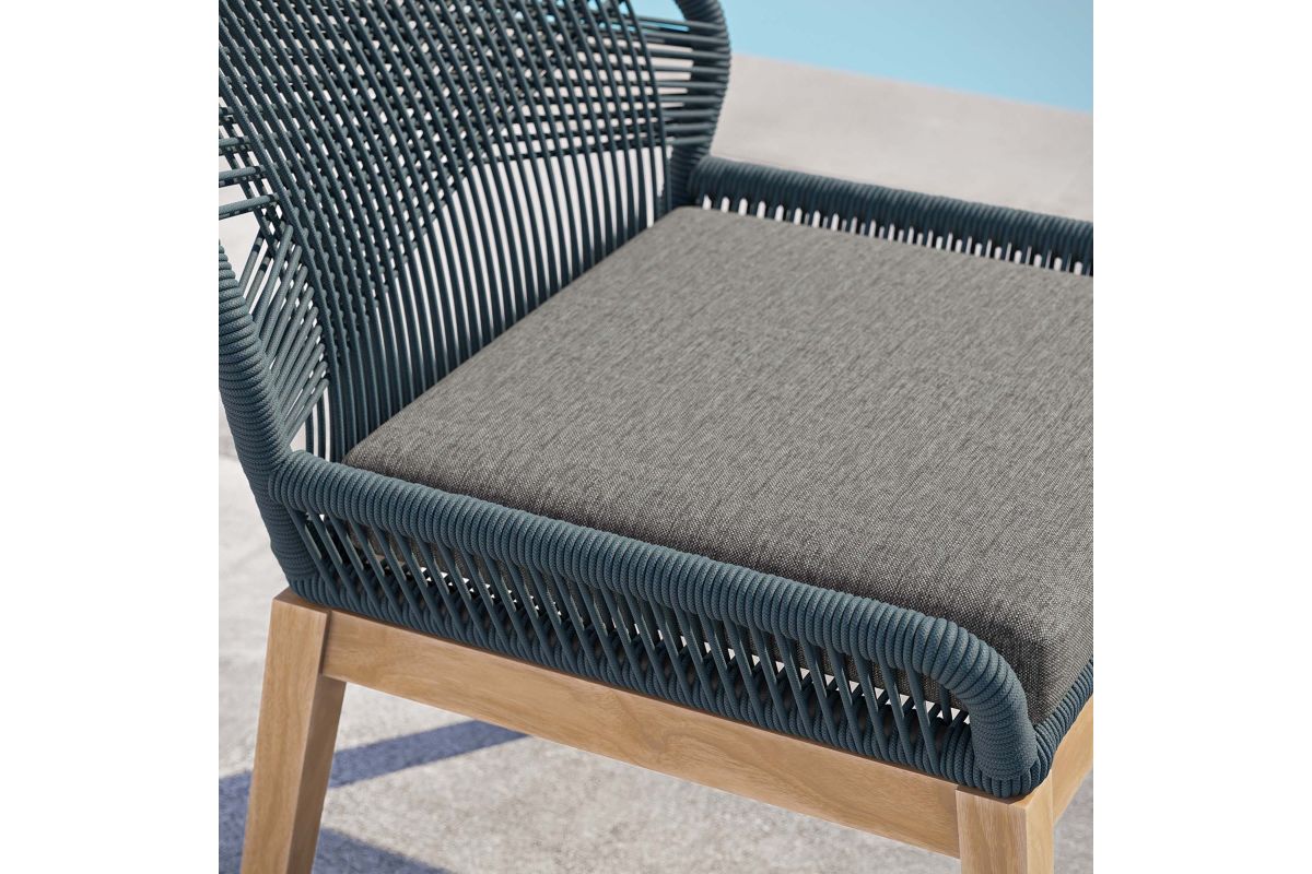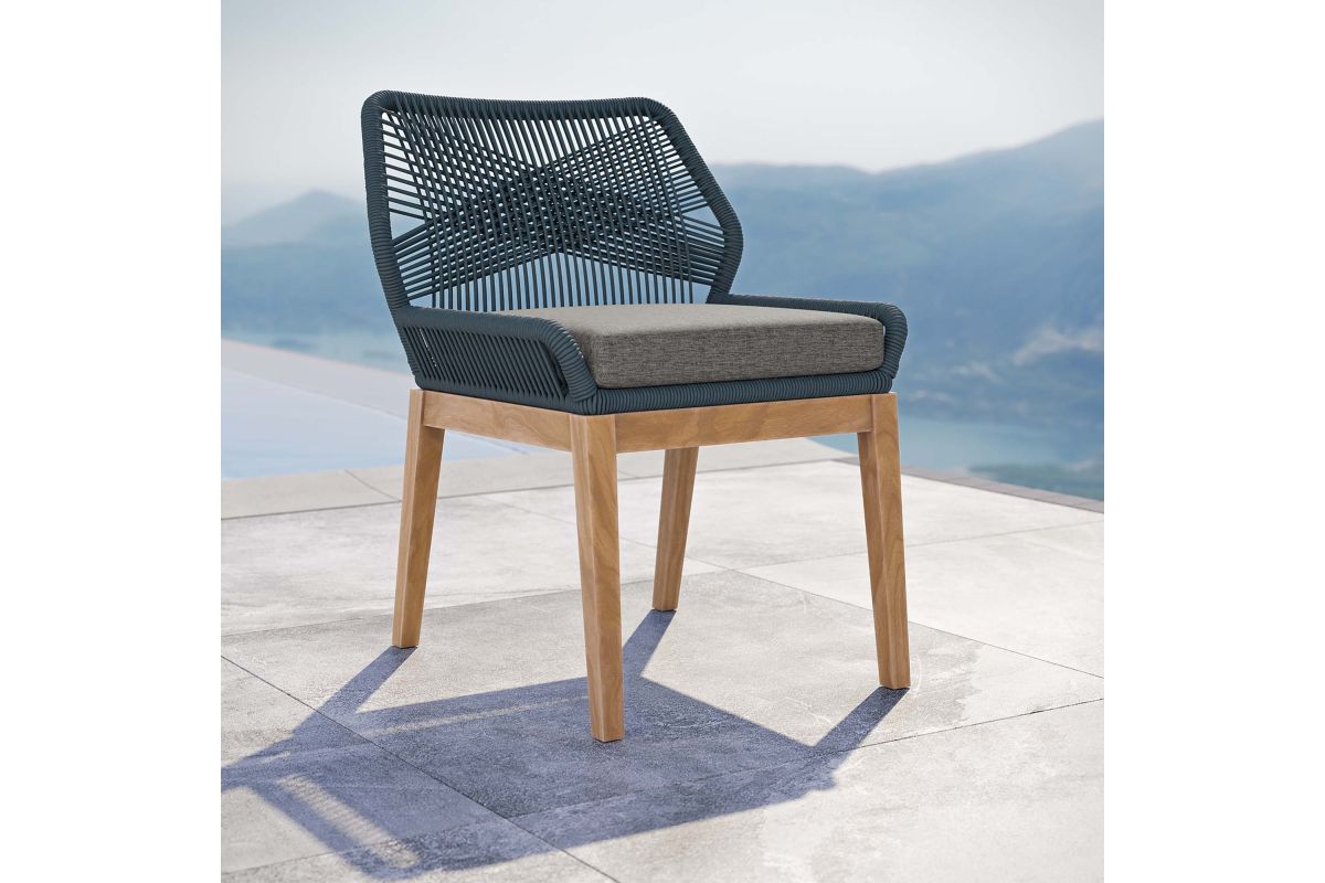 Relax amidst friends and family as you enjoy a meal al fresco with the Wellspring Outdoor Patio Dining Chair. Wellspring brings contemporary modern aesthetics to a backyard, porch, patio, or poolside with it's calming colors, organic wood grain, woven rope detail on the aluminum seat frame, and a crisscross pattern along the backrest. Featuring a premium solid teak wood base with stretchers and non-marking foot pins to protect flooring, this patio chair stool boasts a removable cushion with dense foam padding and ties to ensure a secure seat. It's versatile design makes it a stylish addition indoors too. Assembly required. Weight Capacity: 220 lbs.