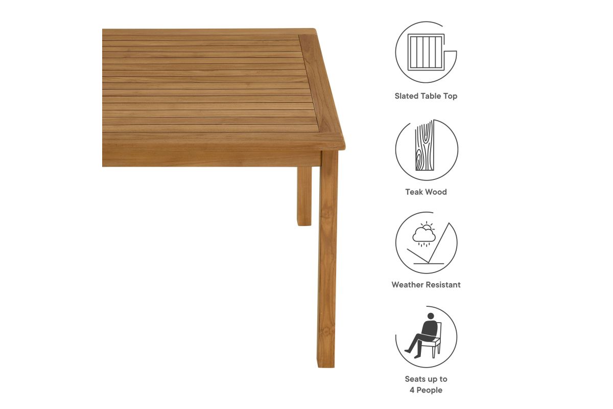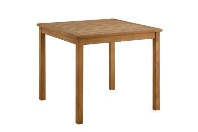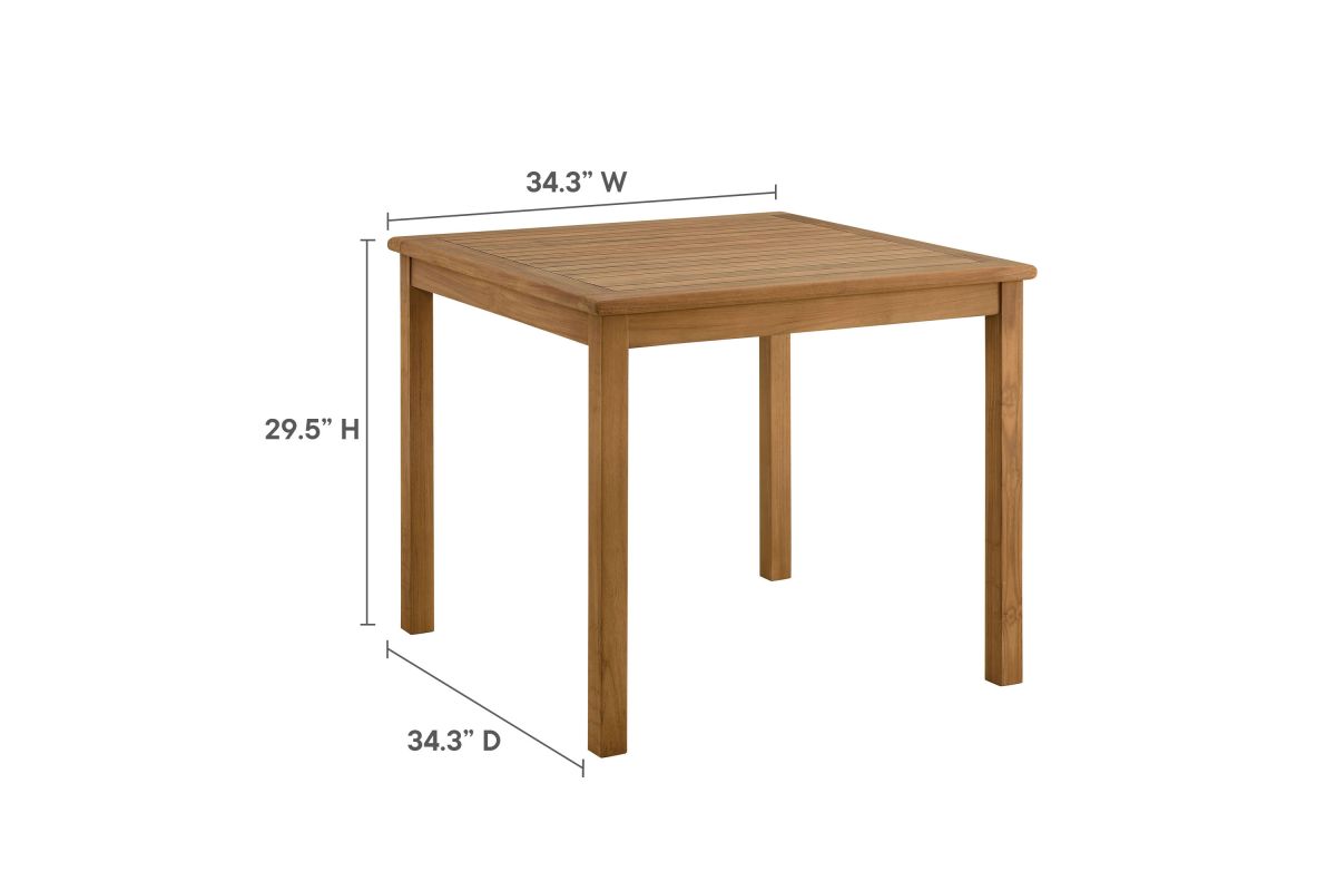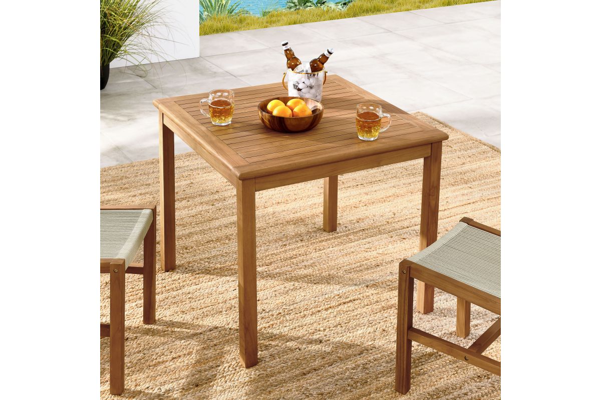 Refresh your outdoor dining experience with the Vienna Teak Wood Dining Table, an exquisite addition for everyday casual dining outside. This square outdoor dining table, crafted from beautiful teak wood that is naturally weather-resistant, features a slatted surface that creates a contemporary and cohesive look ideal for any patio or garden setting. Perfect for cozy meals and small get-togethers, this outdoor dining table comfortably seats 4 people. Standing on four solid wood legs, the 34-inch square Vienna Teak Patio Table provides stability and durability, creating a timeless focal point for your outdoor decor. Whether used as wood bistro table, an outdoor breakfast table, or paired with the complete Vienna Outdoor Teak Wood Furniture Set, this square patio table complements a diverse range of outdoor patios. Assembly Required.