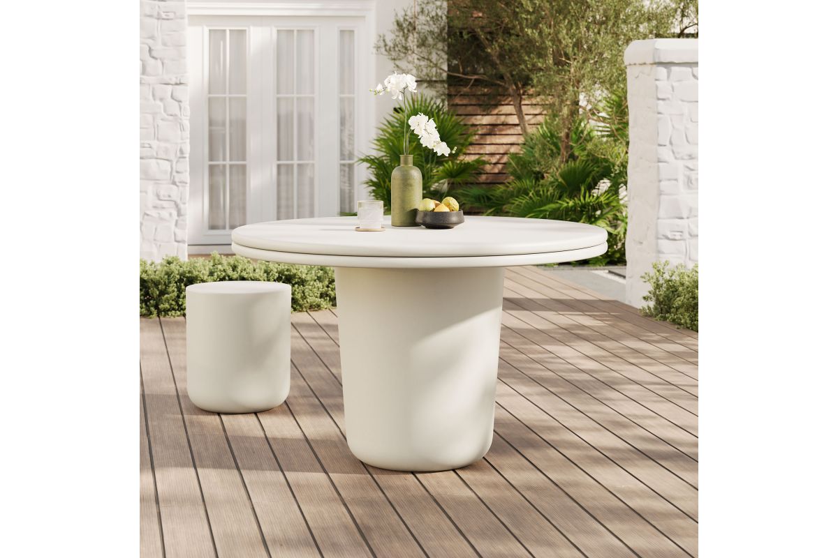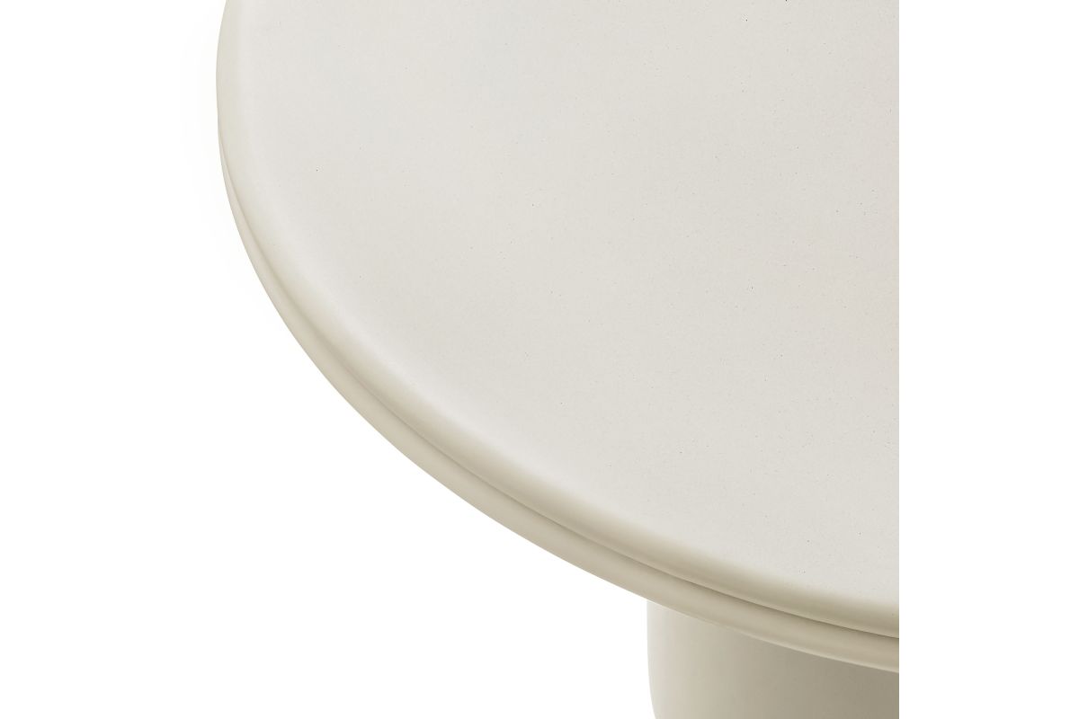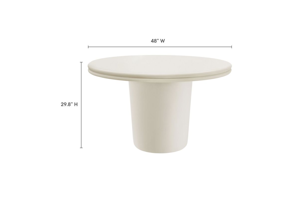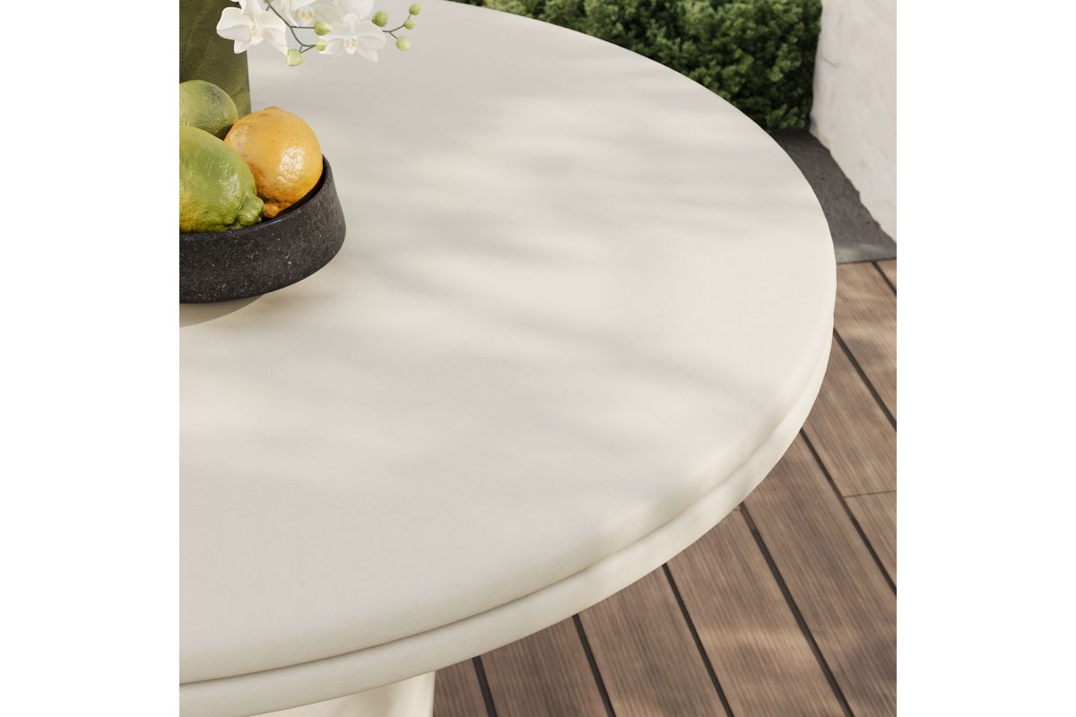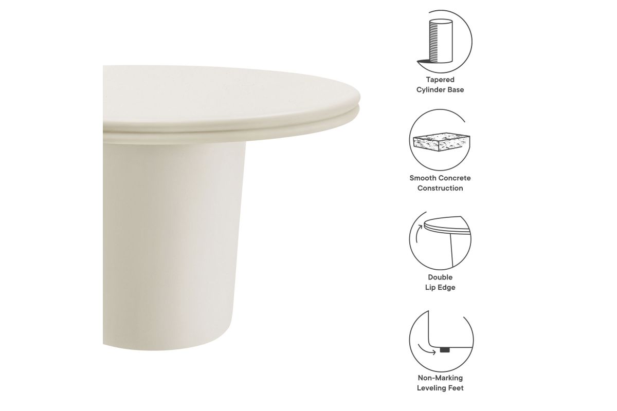 The Brion Concrete Round Dining Table makes a bold statement with its contemporary design and distinctive details. Crafted from solid concrete and finished with a sleek coating, this circular dining table provides both durability and a smooth, refined look. Featuring a striking round top with a double lip around the edge, the Brion 48-inch cement dining table complements any decor, whether used outdoors or indoors. Its cylindrical base, subtly tapered for a streamlined appearance, offers superior stability while maintaining a minimalist design. Perfect for gatherings of 2 to 4, this round dining table is equally at home in a modern dining room, cozy kitchen, or a stylish patio setting. Complete with non-marking leveling feet, it ensures stability on any surface while protecting your floors. No matter where its placed, the Brion indoor/outdoor cement dining table makes a bold statement with its durable construction and modern aesthetic. Assembly required. Weight Capacity: 230 lbs.