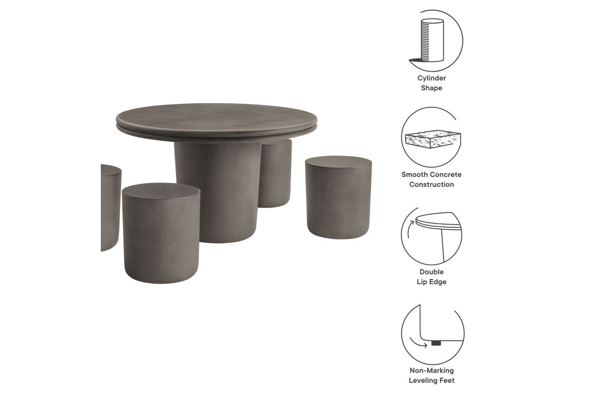 The Brion 5-Piece Dining table set makes a bold statement with its contemporary design and cohesive aesthetic. This set includes a 48-inch round dining table and 4 cylindrical stools, all crafted from solid concrete and finished with a sleek coating, offering a smooth, refined look with exceptional durability. The round dining table features a striking top with a double lip detail, while the 16-inch cylindrical stools echo the same minimalist design with rounded edges. Perfectly suited for indoor or outdoor use, this dining table with stools set seamlessly complements any decor. The table's subtly tapered cylindrical base offers robust stability, while the stools provide versatile functionality—use them as seating, side tables, or even plant stands. The Brion dining table set for 4 is equally at home in a modern dining room, cozy kitchen, stylish patio, or garden. Complete with non-marking leveling feet, both the table and stools ensure stability on any surface while protecting your floors. No matter where it’s placed, the Brion outdoor dining set for 4 stands out with its durable construction and modern aesthetic.