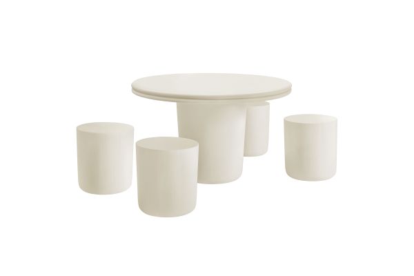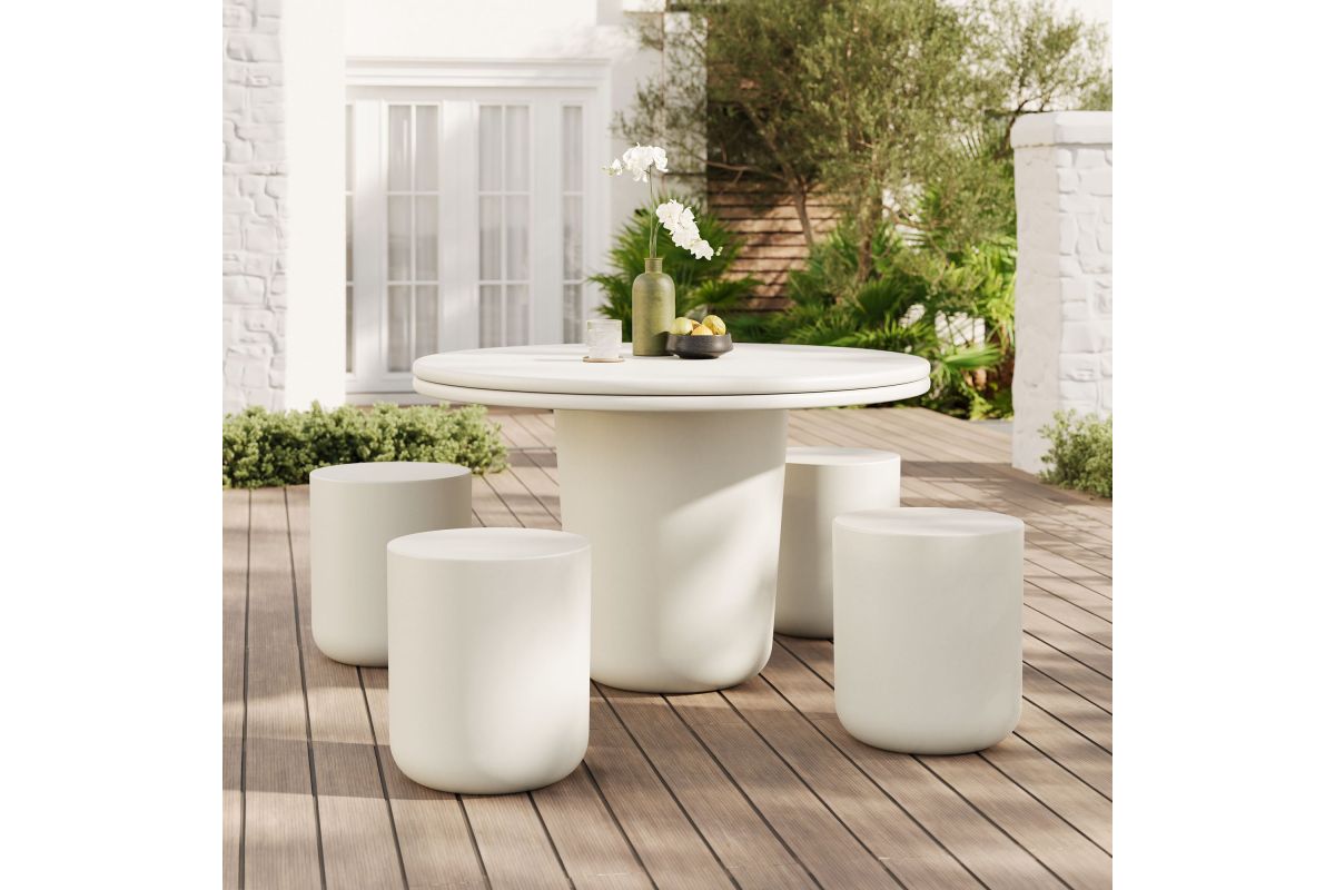 The Brion 5-Piece Dining table set makes a bold statement with its contemporary design and cohesive aesthetic. This set includes a 48-inch round dining table and 4 cylindrical stools, all crafted from solid concrete and finished with a sleek coating, offering a smooth, refined look with exceptional durability. The round dining table features a striking top with a double lip detail, while the 16-inch cylindrical stools echo the same minimalist design with rounded edges. Perfectly suited for indoor or outdoor use, this dining table with stools set seamlessly complements any decor. The table's subtly tapered cylindrical base offers robust stability, while the stools provide versatile functionality—use them as seating, side tables, or even plant stands. The Brion dining table set for 4 is equally at home in a modern dining room, cozy kitchen, stylish patio, or garden. Complete with non-marking leveling feet, both the table and stools ensure stability on any surface while protecting your floors. No matter where it’s placed, the Brion outdoor dining set for 4 stands out with its durable construction and modern aesthetic.