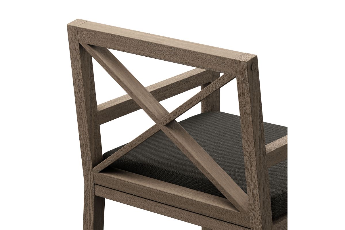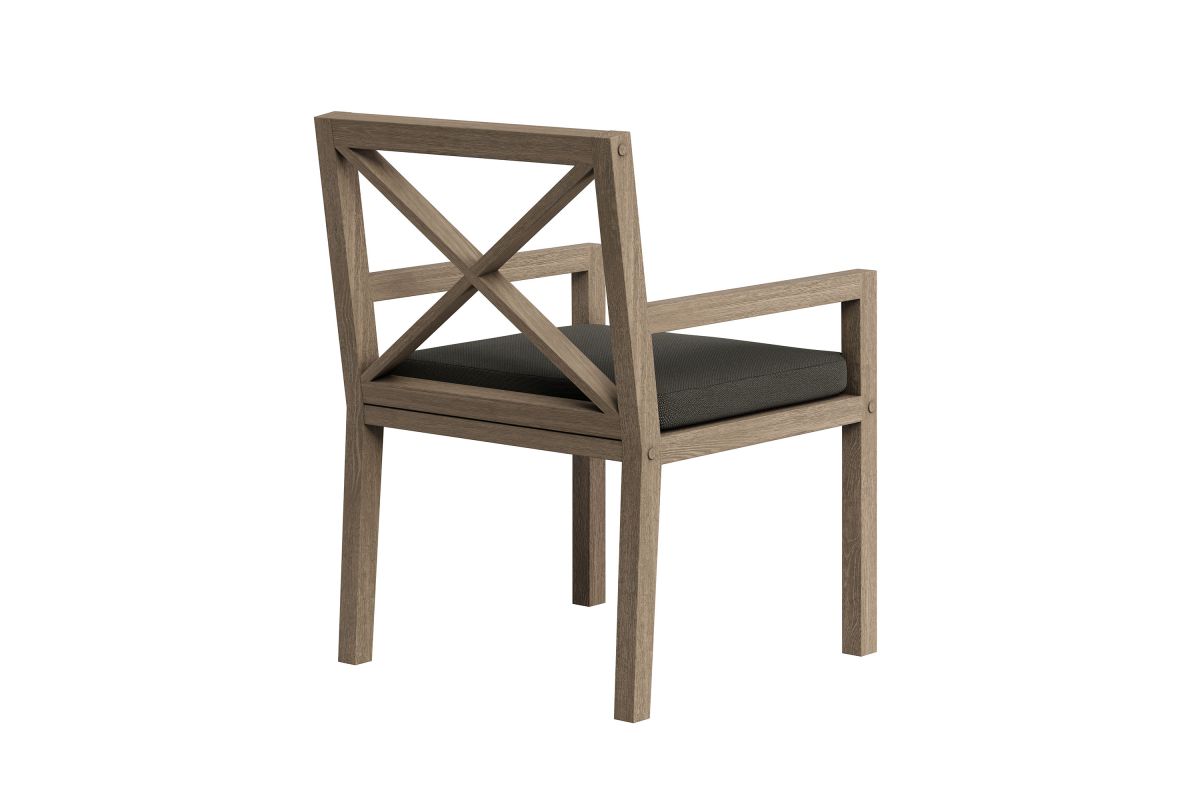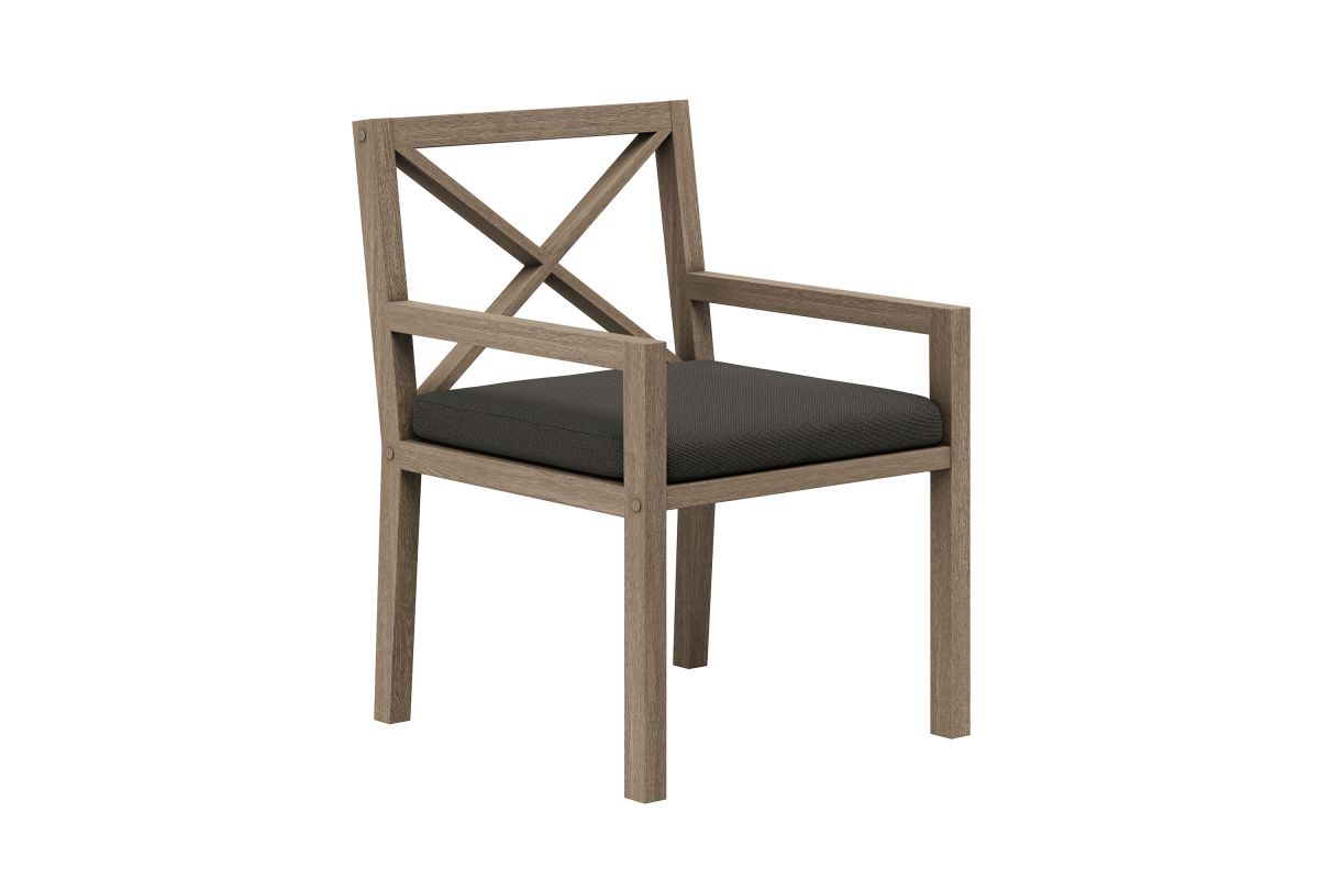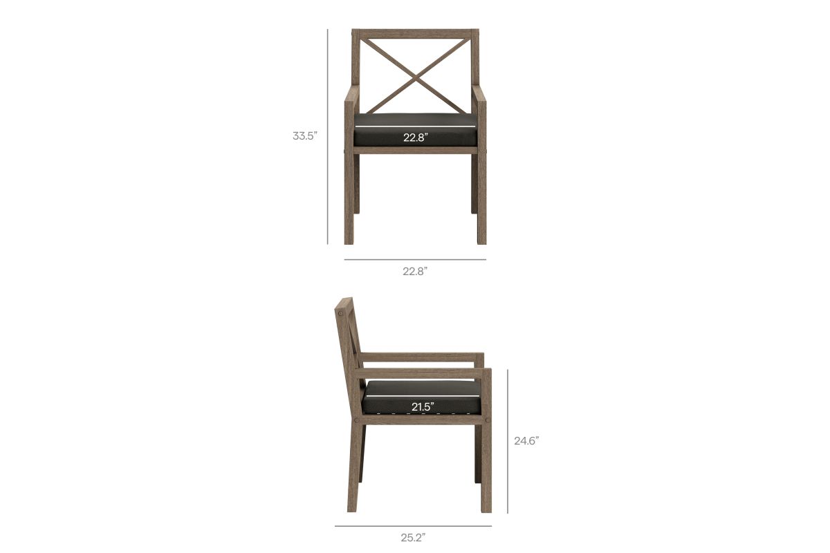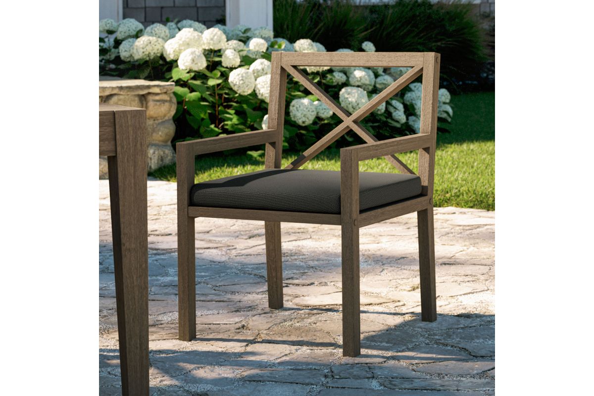 Soak in nature's beauty while dining al fresco with the Northlake Outdoor Teak Dining Chair, a stylish and durable addition to any patio or deck. Expertly crafted from sturdy teak wood, this outdoor dining armchair features a distinctive cross-back design that enhances both support and aesthetic appeal. The slatted seat base promotes airflow and durability, while the plush, all-weather cushion offers water-resistant, fade-resistant, and quick-drying performance for lasting comfort. Whether gathered around a dining table or used as a standalone accent chair, the Northlake Outdoor Patio Dining Chair blends timeless craftsmanship with modern outdoor luxury. Includes non-marking floor glides for added protection. Assembly required. Weight Capacity: 500 lbs.