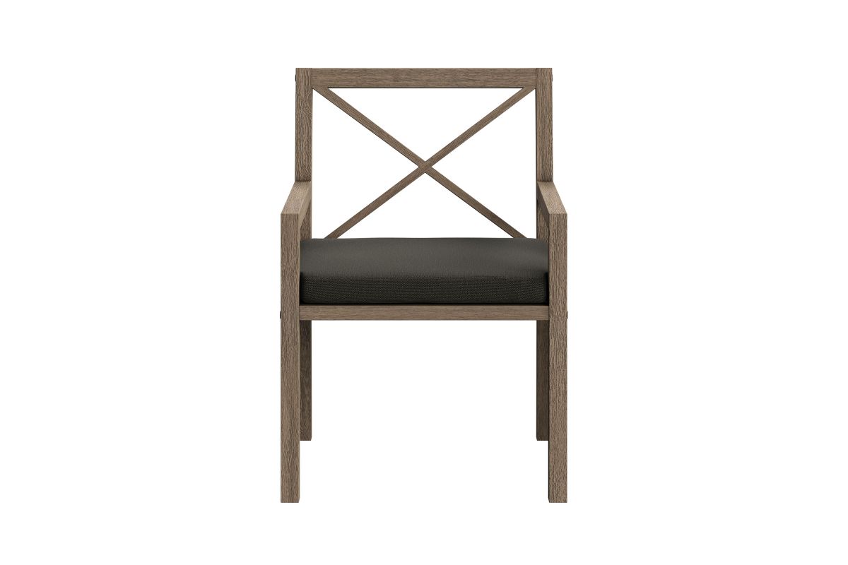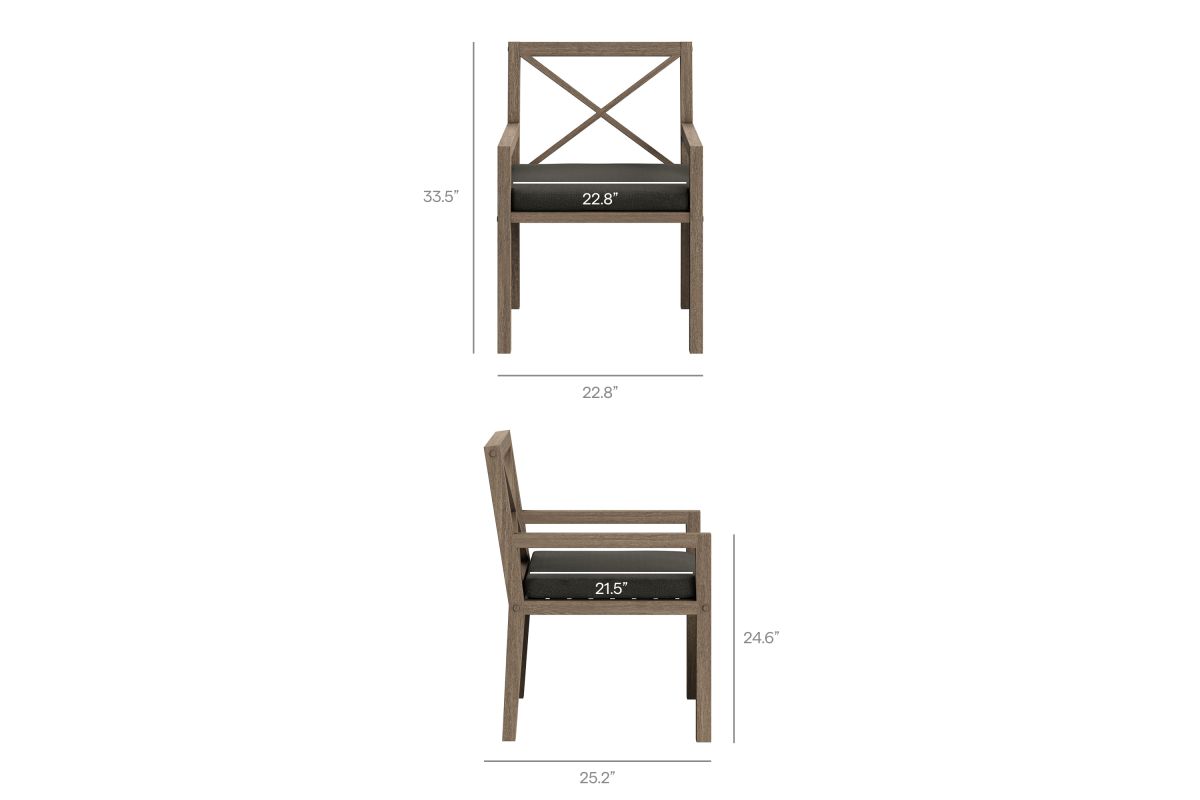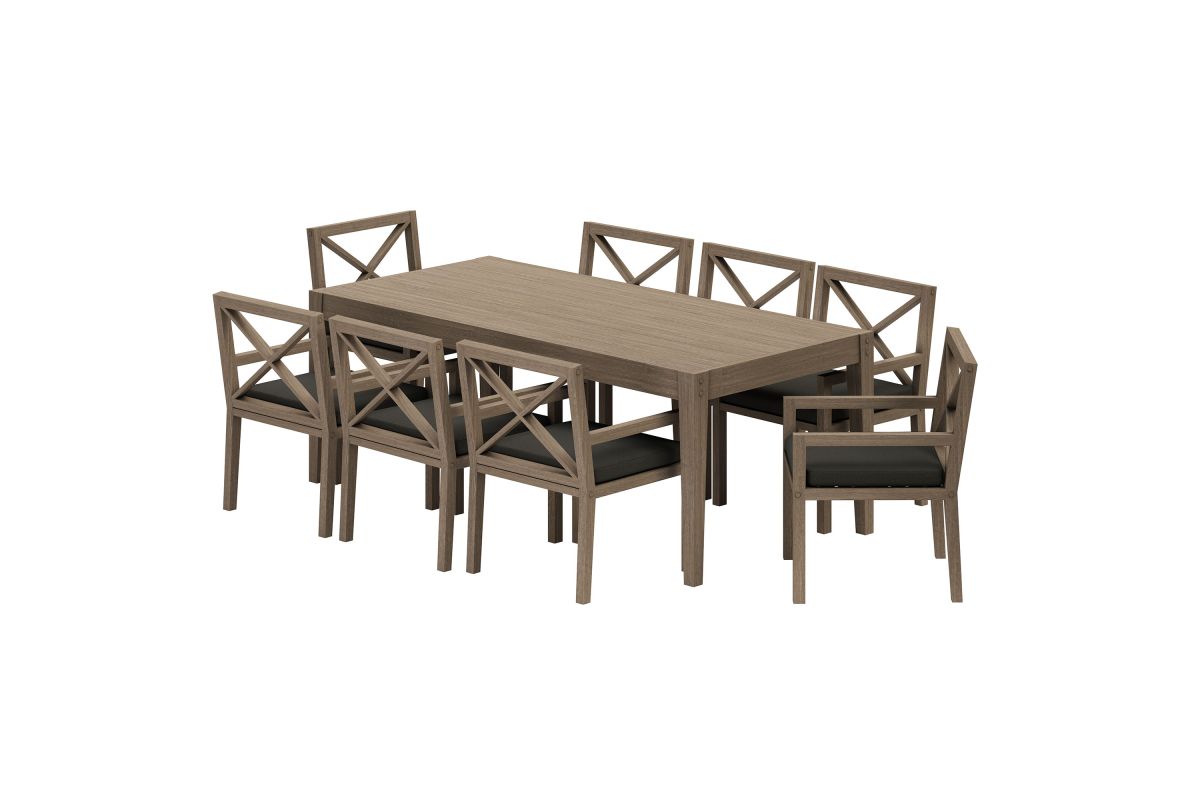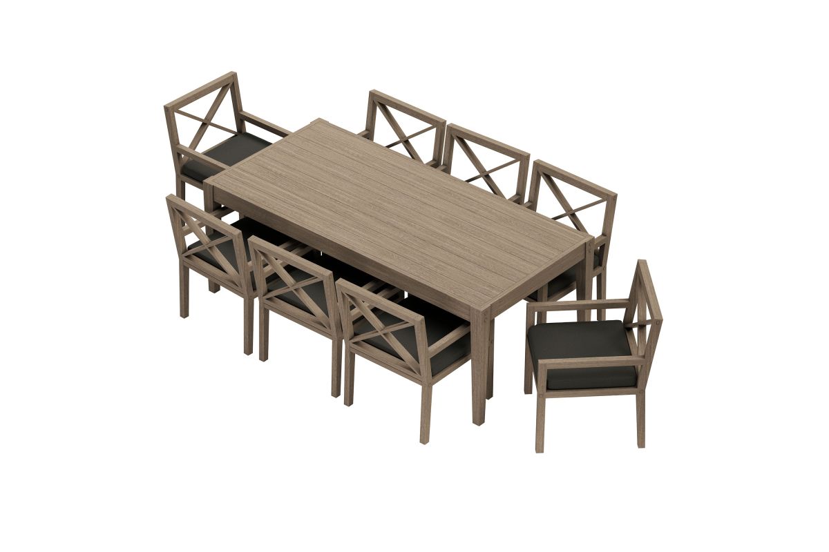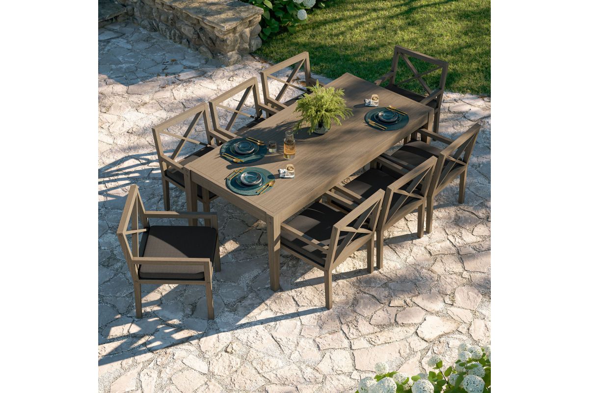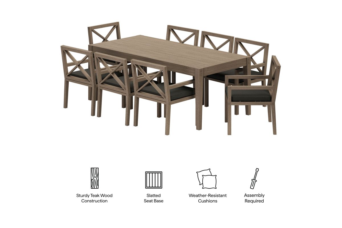 Soak in nature's beauty with the Northlake 9-Piece Outdoor Patio Dining Set, featuring a spacious dining table and eight matching armchairs. All crafted from durable teak wood, the 83-inch rectangular table showcases clean lines and a smooth plank-style top, creating a modern yet timeless setting for outdoor dining. The coordinating armchairs are designed with distinctive cross-back frames for added support and a refined aesthetic. Each patio chair includes a plush, all-weather cushion that is water-resistant, fade-resistant, and quick-drying for lasting comfort, while slatted seat bases encourage airflow and durability. Perfect for patios, decks, and garden gatherings, this teak patio dining set blends elegant craftsmanship with lasting outdoor performance. Includes non-marking floor glides for added protection. Assembly required.