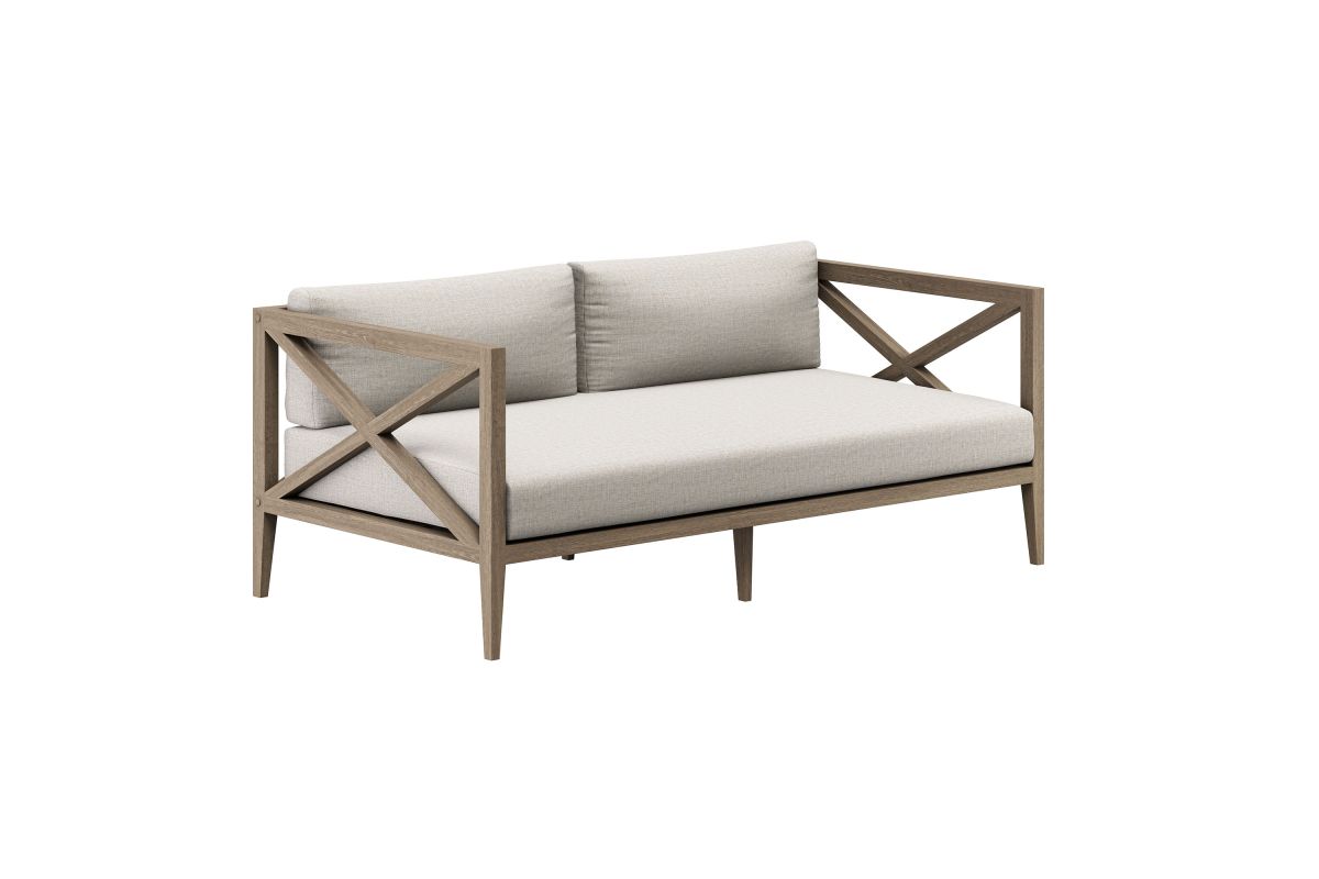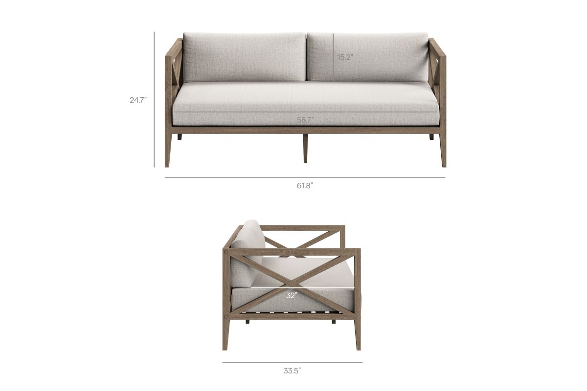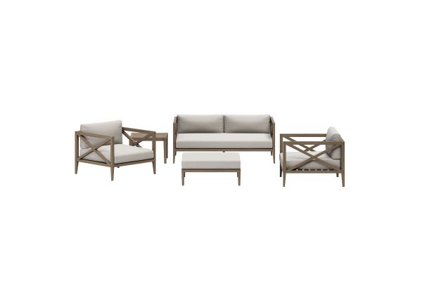 Soak in nature’s beauty with the Northlake 5-Piece Outdoor Furniture Set, featuring a sofa, two armchairs, a matching ottoman, and a side table. All crafted from durable teak, the sofa and armchairs are designed with distinctive cross-back frames for added support and a refined aesthetic, while the ottoman complements the set with a wide, seat and clean, modern look. All three seating pieces include plush, all-weather cushions that are water-resistant, fade-resistant, and quick-drying, providing year-round comfort. Slatted seat bases encourage airflow and lasting durability across the set. The coordinating square side table completes the layout with a smooth slatted top designed for quick drainage, offering a convenient surface for drinks, decor, or outdoor essentials. Perfect for patios, porches, decks, and garden lounges, this 5 piece patio set blends timeless craftsmanship with modern outdoor luxury. Includes non-marking floor glides for added protection. Assembly required.