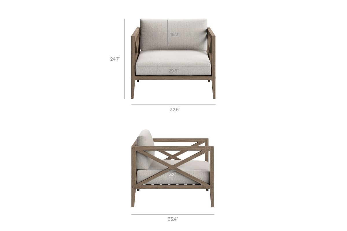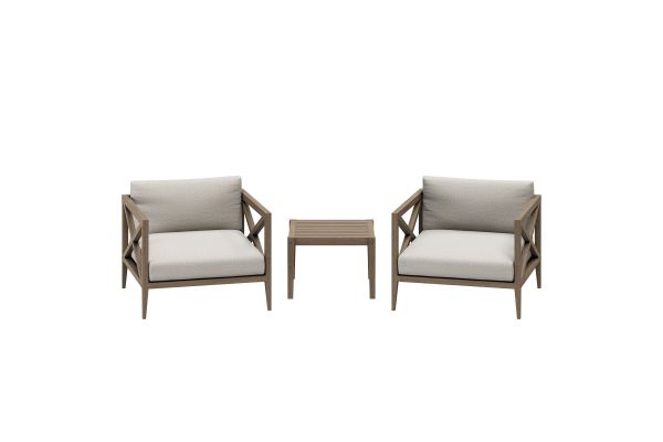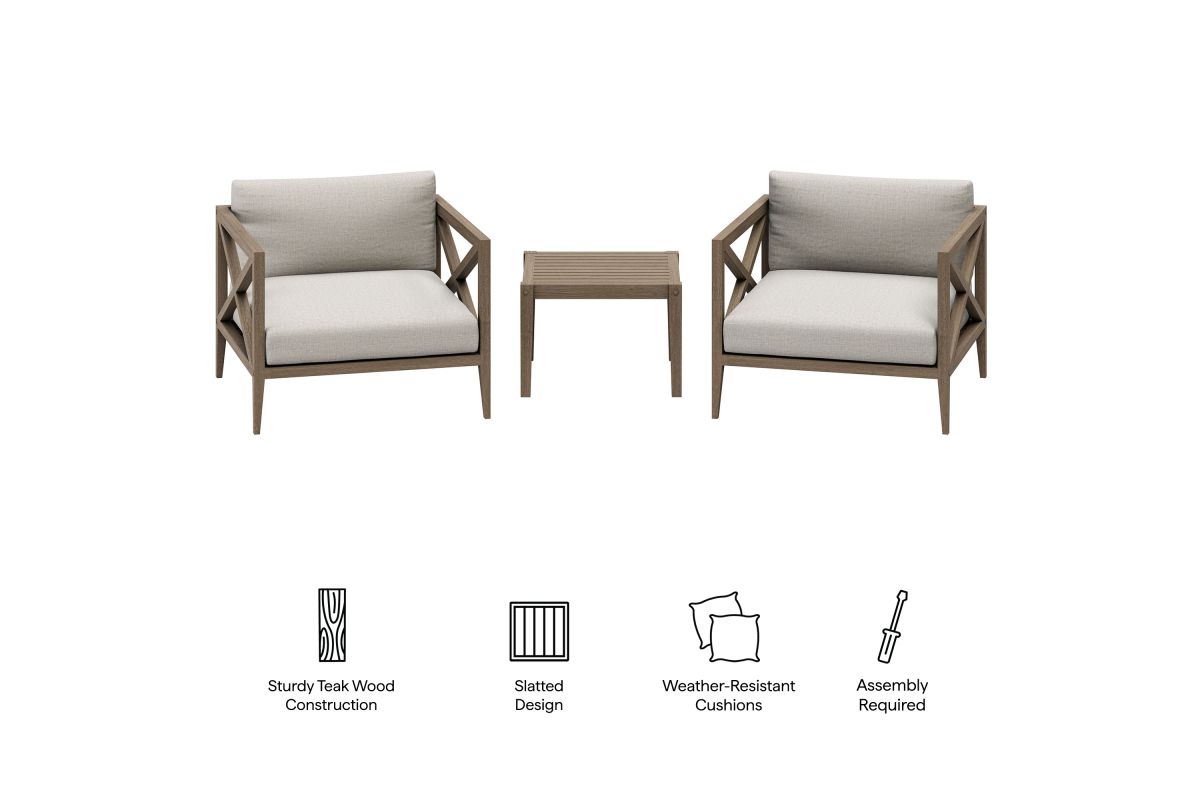 Soak in nature’s beauty with the Northlake 3-Piece Outdoor Furniture Set, featuring stylish lounge armchairs and matching side table. These pieces are crafted from durable teak wood, making them ideal for outdoor use. The wide armchairs showcase a distinctive cross-back frame for added support and a refined aesthetic. A slatted seat base encourages airflow and lasting comfort, while plush, all-weather cushions are water-resistant, fade-resistant, and quick-drying for use through every season. The coordinating square side table is designed with a smooth, slatted top for quick drainage, providing a convenient surface for drinks, decor, or outdoor essentials. Perfect for patios, porches, balconies, and garden lounges, this set blends timeless craftsmanship with modern outdoor luxury. Includes non-marking floor glides for added protection. Assembly required.